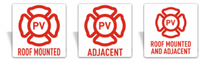 The photovoltaic system warning signs require an emblem in the shape of a Maltese cross made up of a three inch diameter circle with a stroke width of one-half inch and Maltese cross wings that are one and one-eighth inches in height or width with a stroke width of one-half inch. Signs must also have a white reflective background with red lettering. Three different legends; “PV Roof Mounted”, “PV Adjacent”, and “PV Roof Mounted and Adjacent” are available to choose from. All lettering shall be one and one-quarter inch in height with a stroke width of one-quarter inch.
