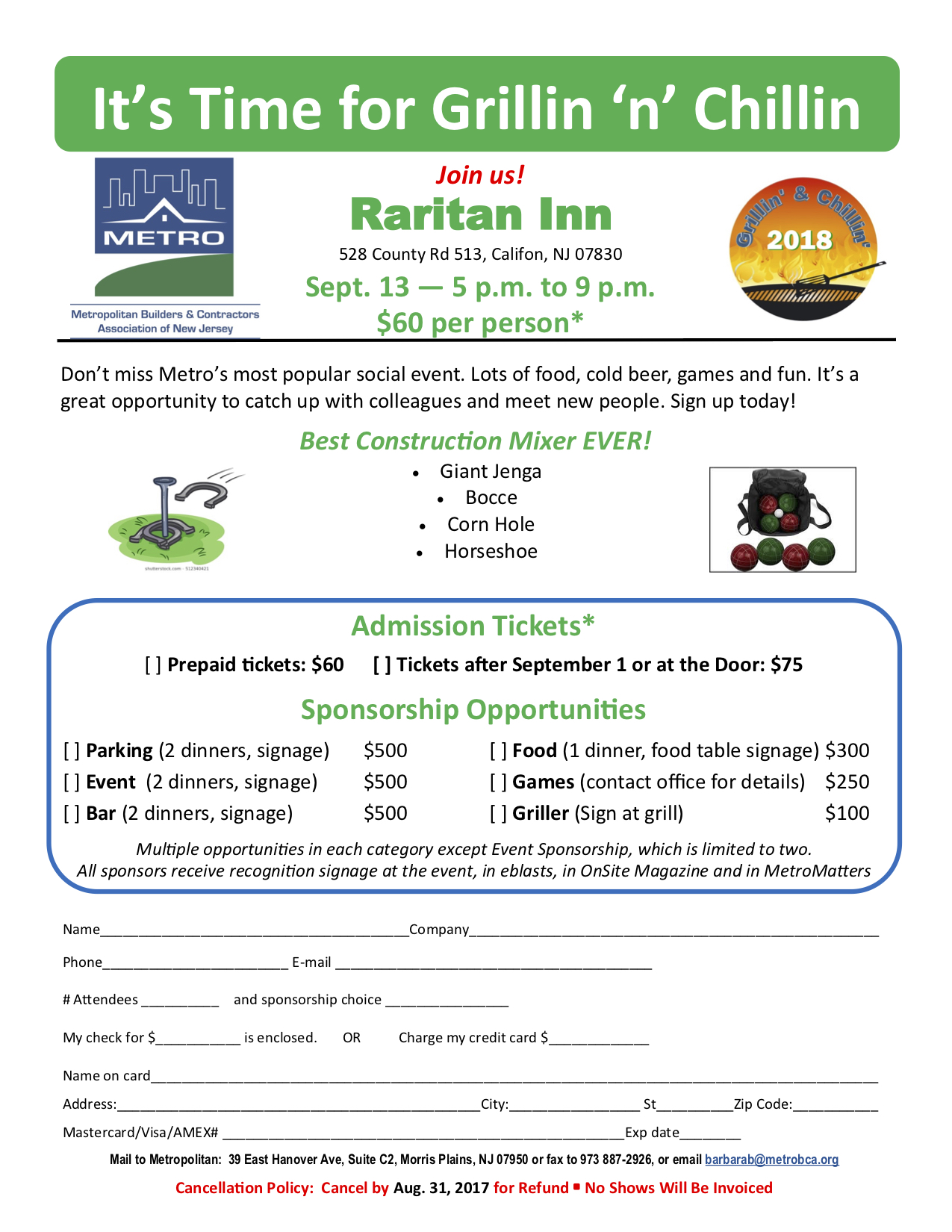 Grillin’ & Chillin’ event, picnic style food, beer and wine included, live entertainment, tournament games and general networking