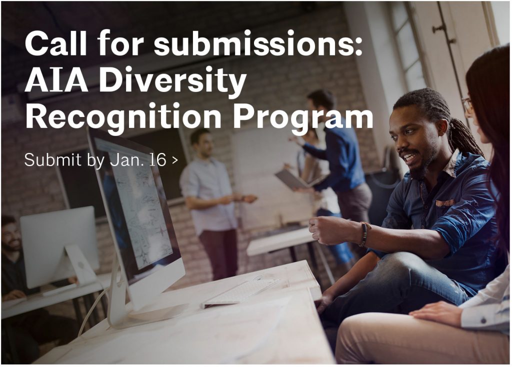 The AIA Diversity Recognition Program recognizes people, programs, and AIA chapters whose work challenges the norms and helps diversify the architecture profession. We’re looking for submissions that showcase work, influence, and change in five categories: K–12 initiatives, community engagement, citizen architect, knowledge-sharing initiatives, and inclusive firm policies.This program isn’t just an opportunity to get recognized—it’s a chance to share what you’re doing and inspire others.Submissions are due January 16, 2019.