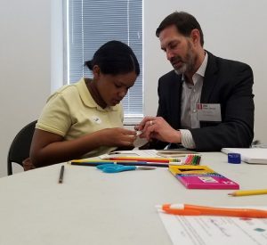 AIA NJ President Steven Lazarus, AIA, works with a student on her architectural model.
