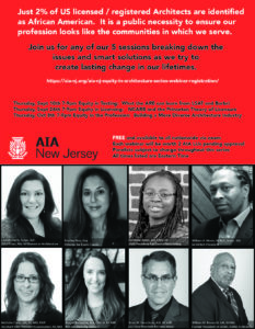 In response to the slow increase in architectural professional diversity, new data and comments from academia, AIA New Jersey is opening up a 6 part panel discussion with key community members to look at the African American experience of the past and present and discuss strategies to make improvements for the future. The series has been developed and will be moderated by AIA New Jersey Women in Architecture Chair Libertad Lauren Harris, Associate AIA, in conjunction with the Equity in Architecture Committee. Registrants are invited to attend some or all of the webinars. This series is offered as a free member benefit to all.