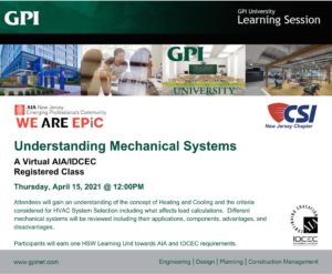 By Stacey Ruhle Kliesch, AIA, AIA NJ Advocacy Consultant | Posted in Continuing Ed, Emerging Professionals | Tagged: #AIANJEPiC, #ContinuingEducations, #emergingprofessionals, #EPiC, #GPI, #MechanicalSystems, #NJCSI | Comments (0)