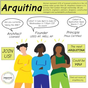 Today we begin mentee recruitment of the Spring 2022 cohort. Through the cohort initiative, Arquitina candidates receive the mentorship, encouragement and resources necessary to clear the path to licensure and pursue a successful career in architecture. Applications will be open from March 7th through the 21st. The application form can be reached HERE.