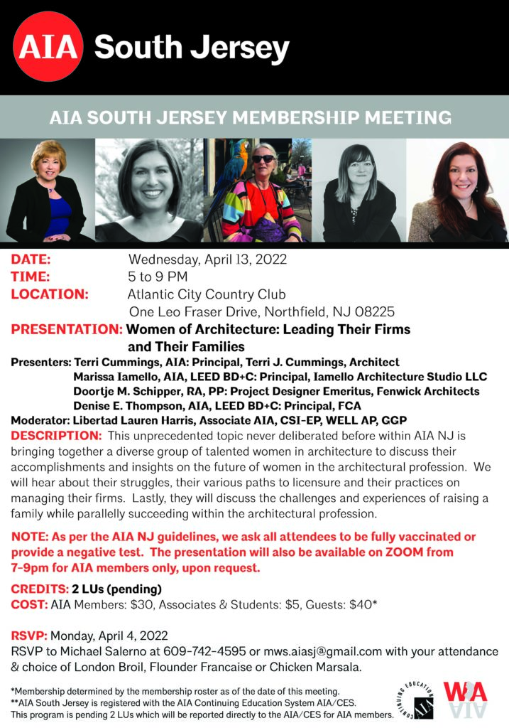 It’s Womens History Month, the perfect time to register for an event discussing how women crush it in BUSINESS, at HOME and in their COMMUNITIES. Join AIA South Jersey for this outstanding presentation, Women Of Architecture: Leading their Firms and their Families. Sponsors for the evening are Versatex and Mannington Commercial. RSVP to Michael Salerno at mws.aiasj@gmail.com by April 4th.