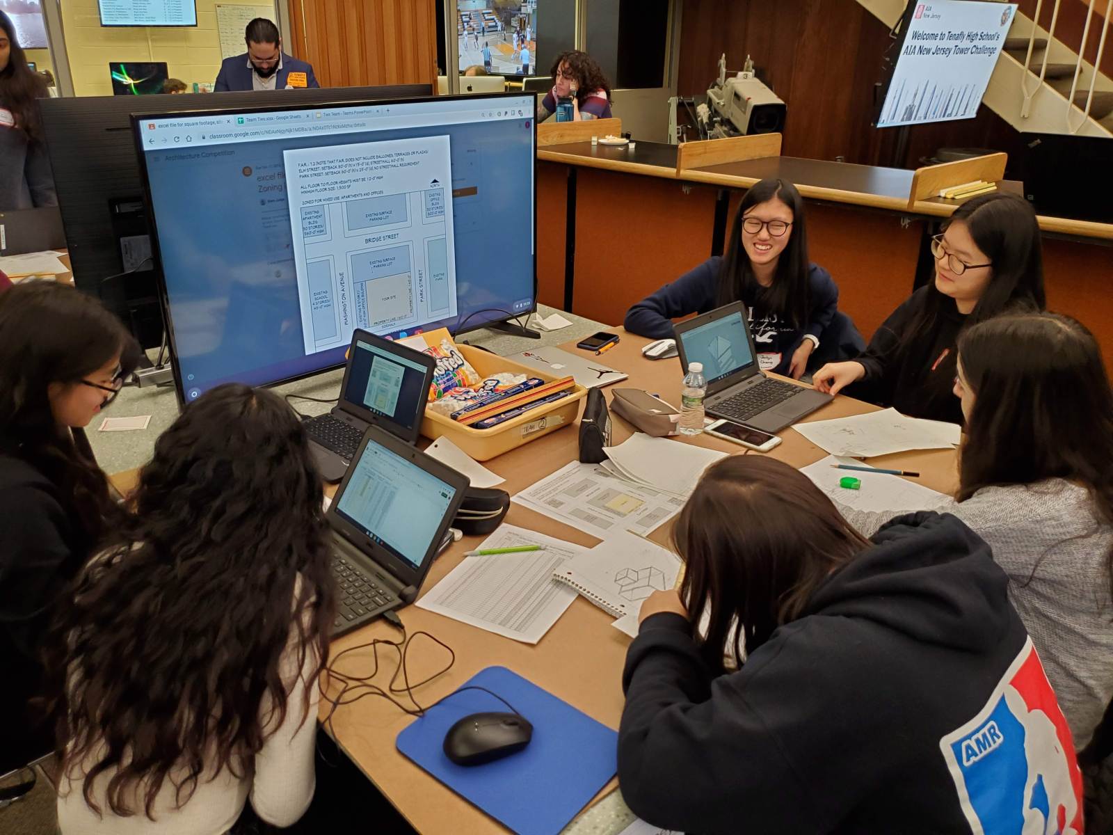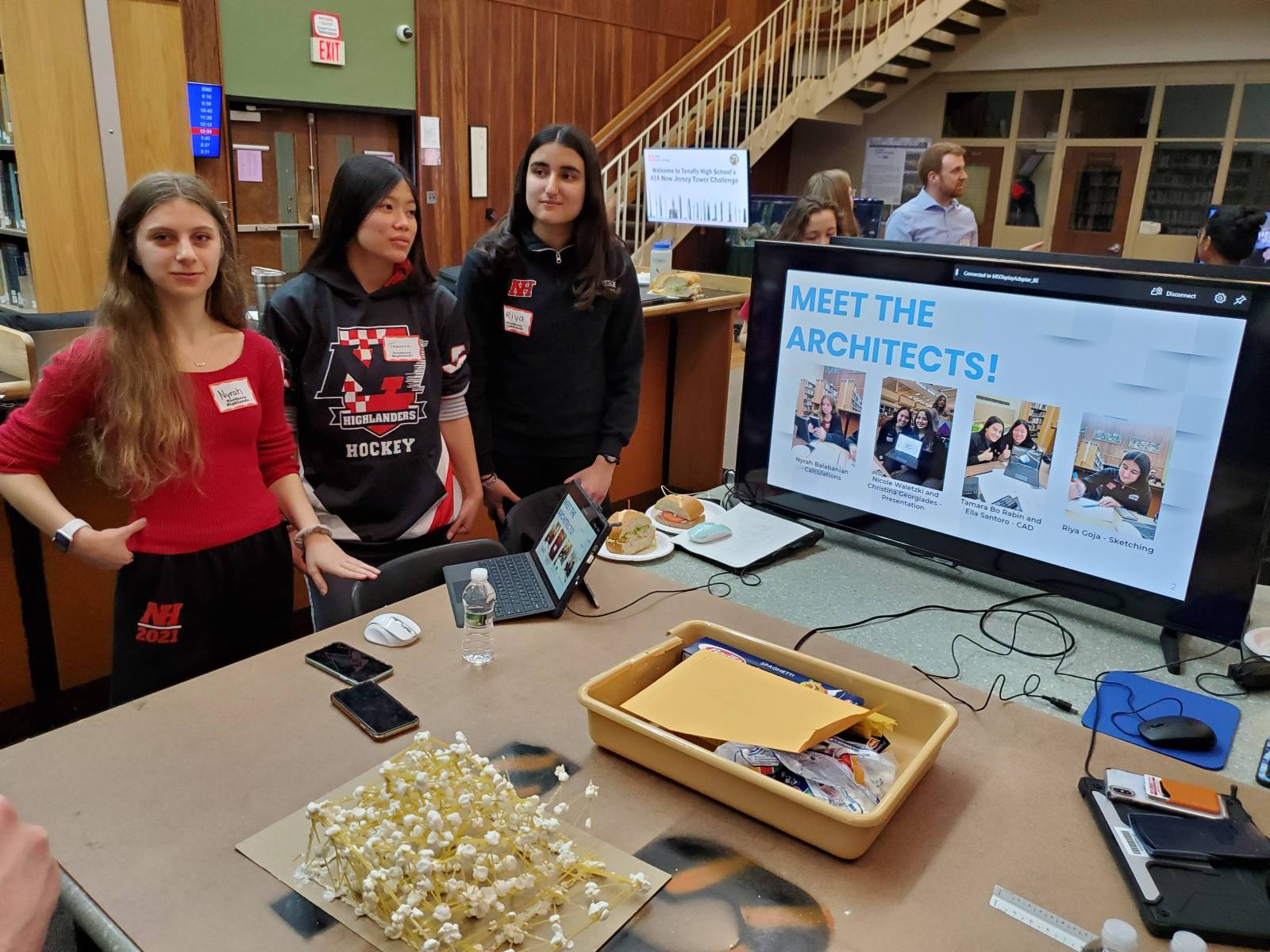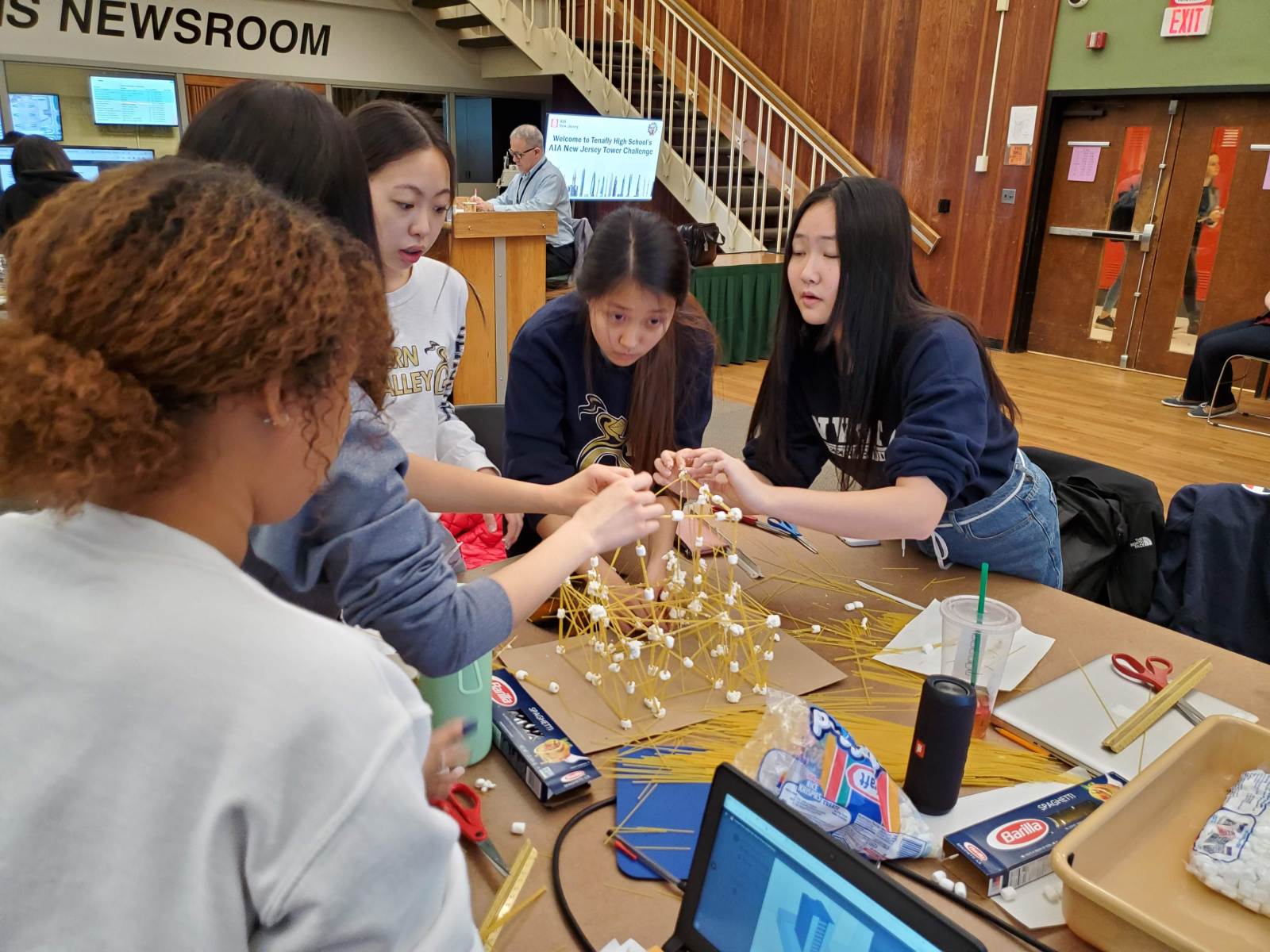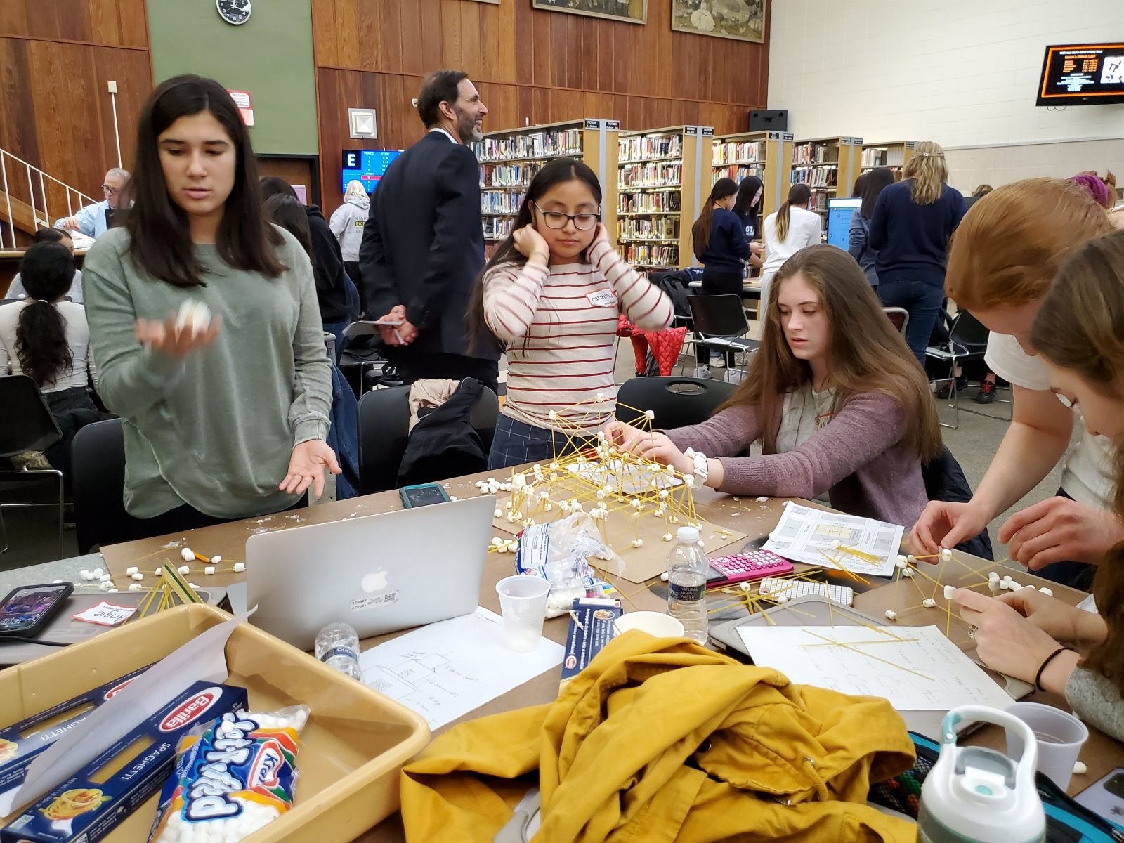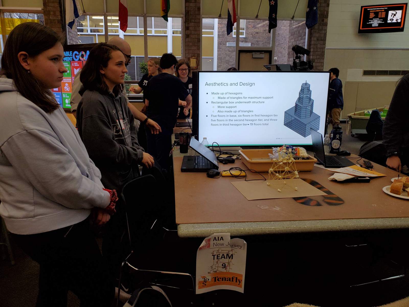 On February 6, 2020, Tenafly High School invited 96 young women from 12 NJ high schools to compete in the AIA NJ Women’s STEAM Tower Challenge. The project was designed by Joseph David, AIA, and co-chaired by Stacey Ruhle Kliesch, AIA, both past presidents of The Architects League of Northern New Jersey. Tenafly High School Teacher of Technology Education, Ghania Layachi, conceived the idea for the all-women STEAM event, arranged the logistics of the entire event and brought all of the participants together. According to Ms. Layacha, “The lack of girls in engineering and architecture motivated the officers of Tenafly Chapter of Society of Women Engineers(SWEnext) to plan this competition.”