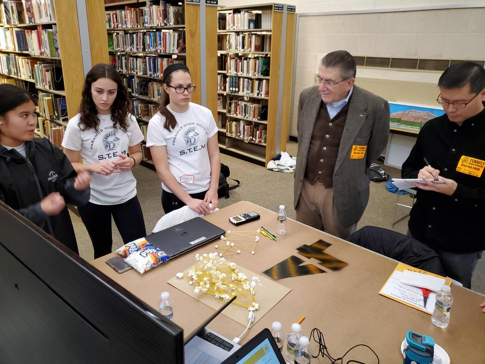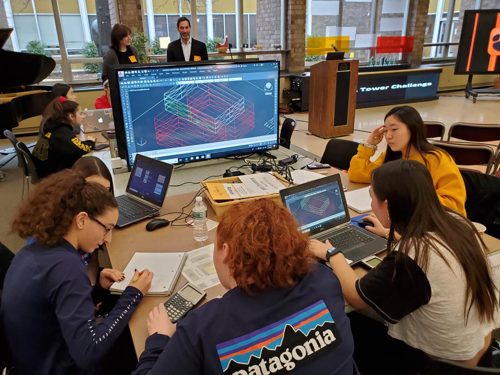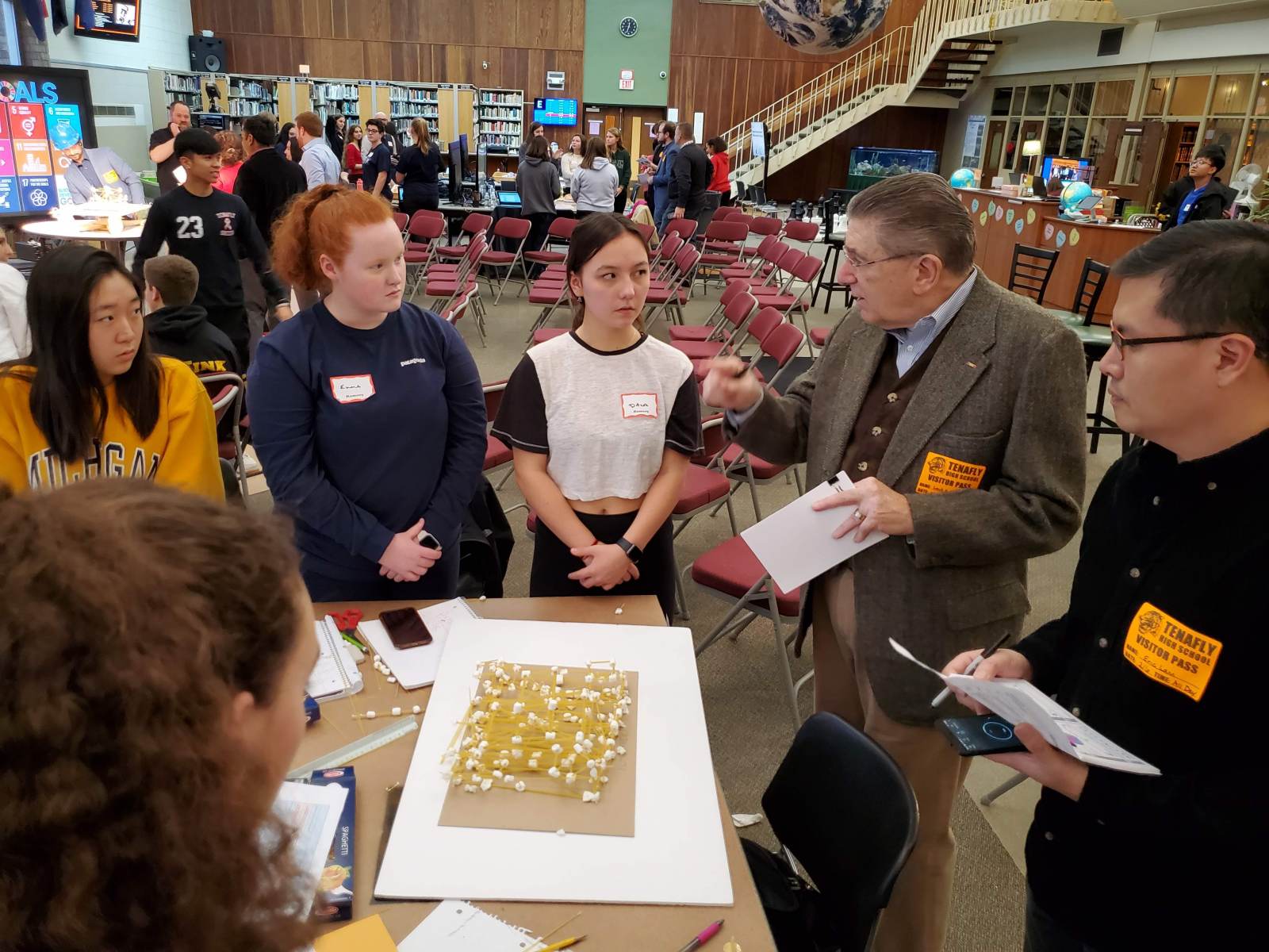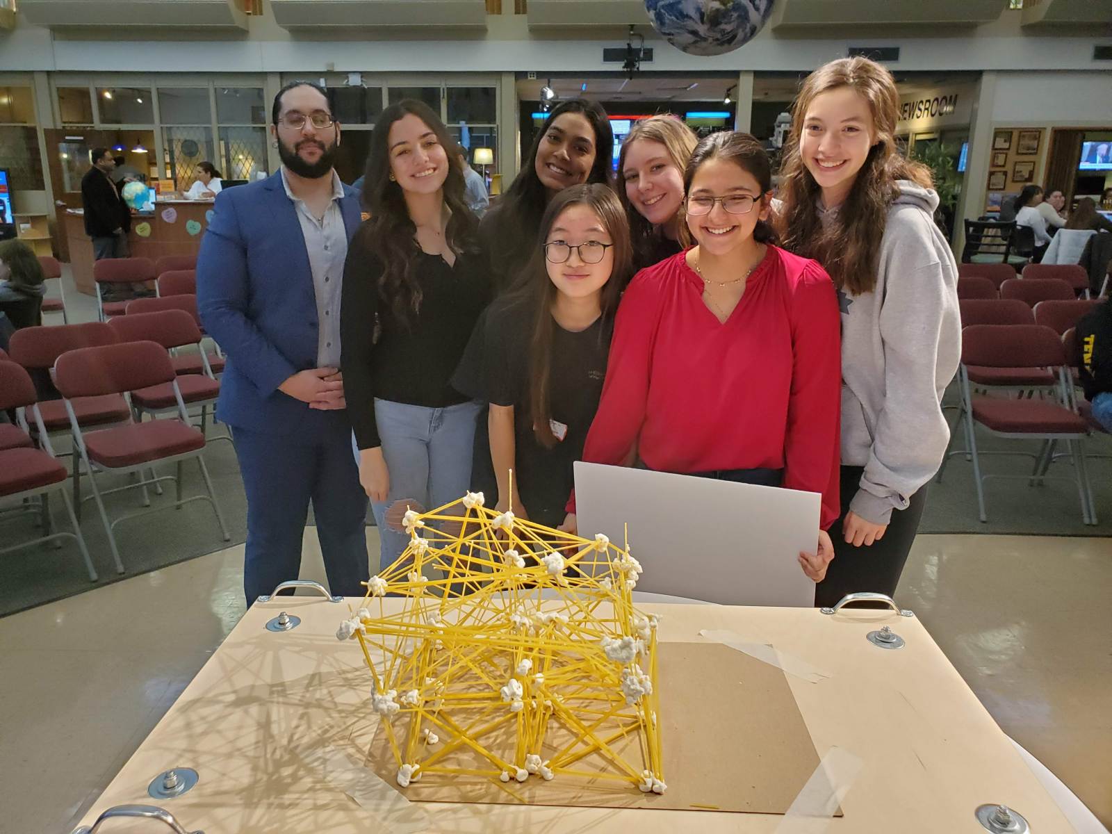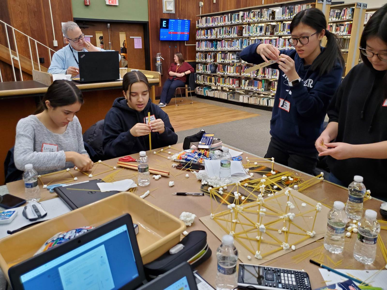 On February 6, 2020, Tenafly High School invited 96 young women from 12 NJ high schools to compete in the AIA NJ Women’s STEAM Tower Challenge. The project was designed by Joseph David, AIA, and co-chaired by Stacey Ruhle Kliesch, AIA, both past presidents of The Architects League of Northern New Jersey. Tenafly High School Teacher of Technology Education, Ghania Layachi, conceived the idea for the all-women STEAM event, arranged the logistics of the entire event and brought all of the participants together. According to Ms. Layacha, “The lack of girls in engineering and architecture motivated the officers of Tenafly Chapter of Society of Women Engineers(SWEnext) to plan this competition.”