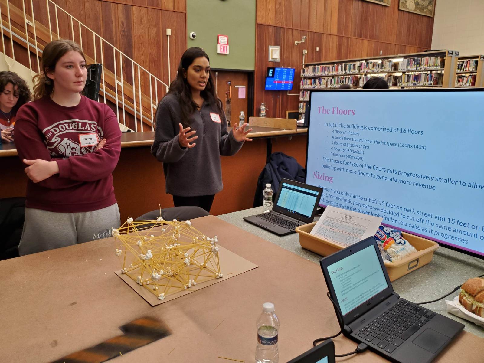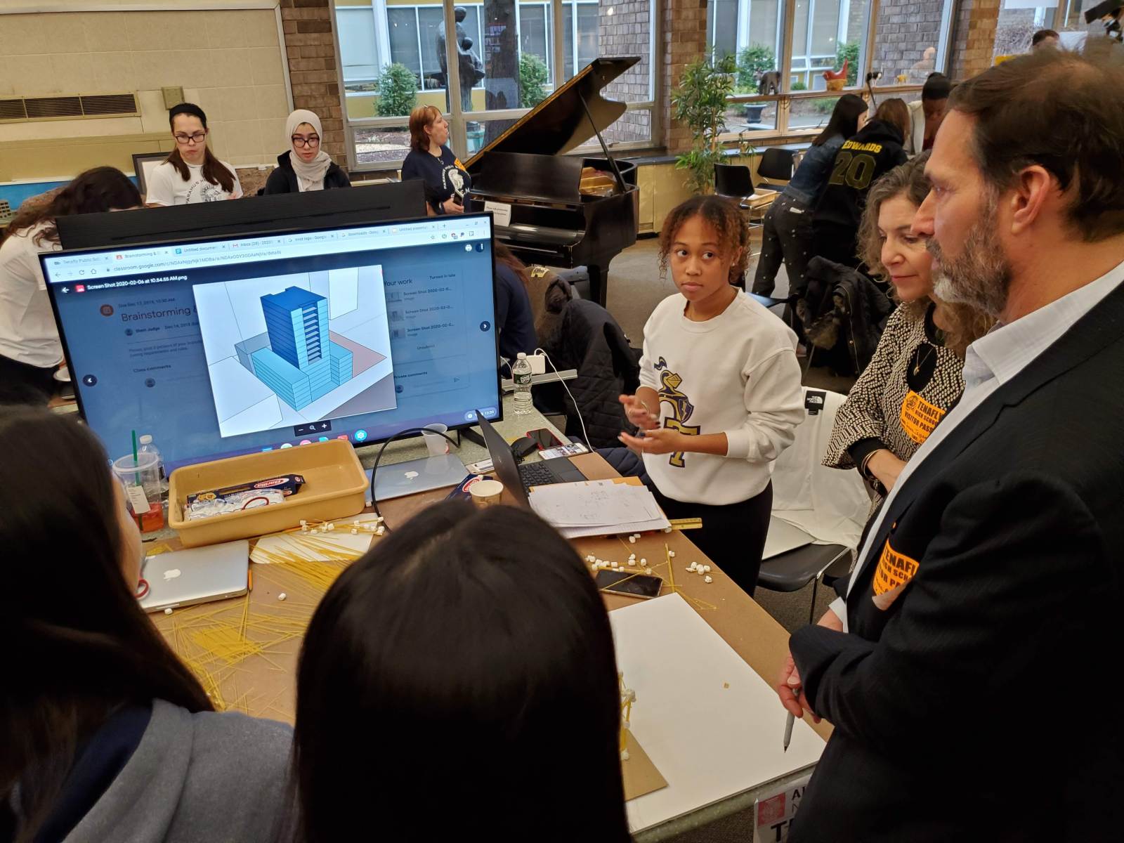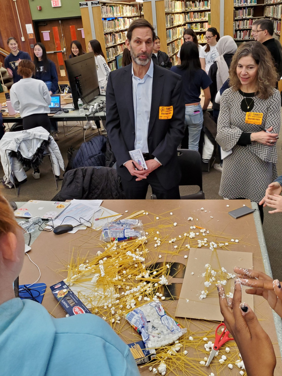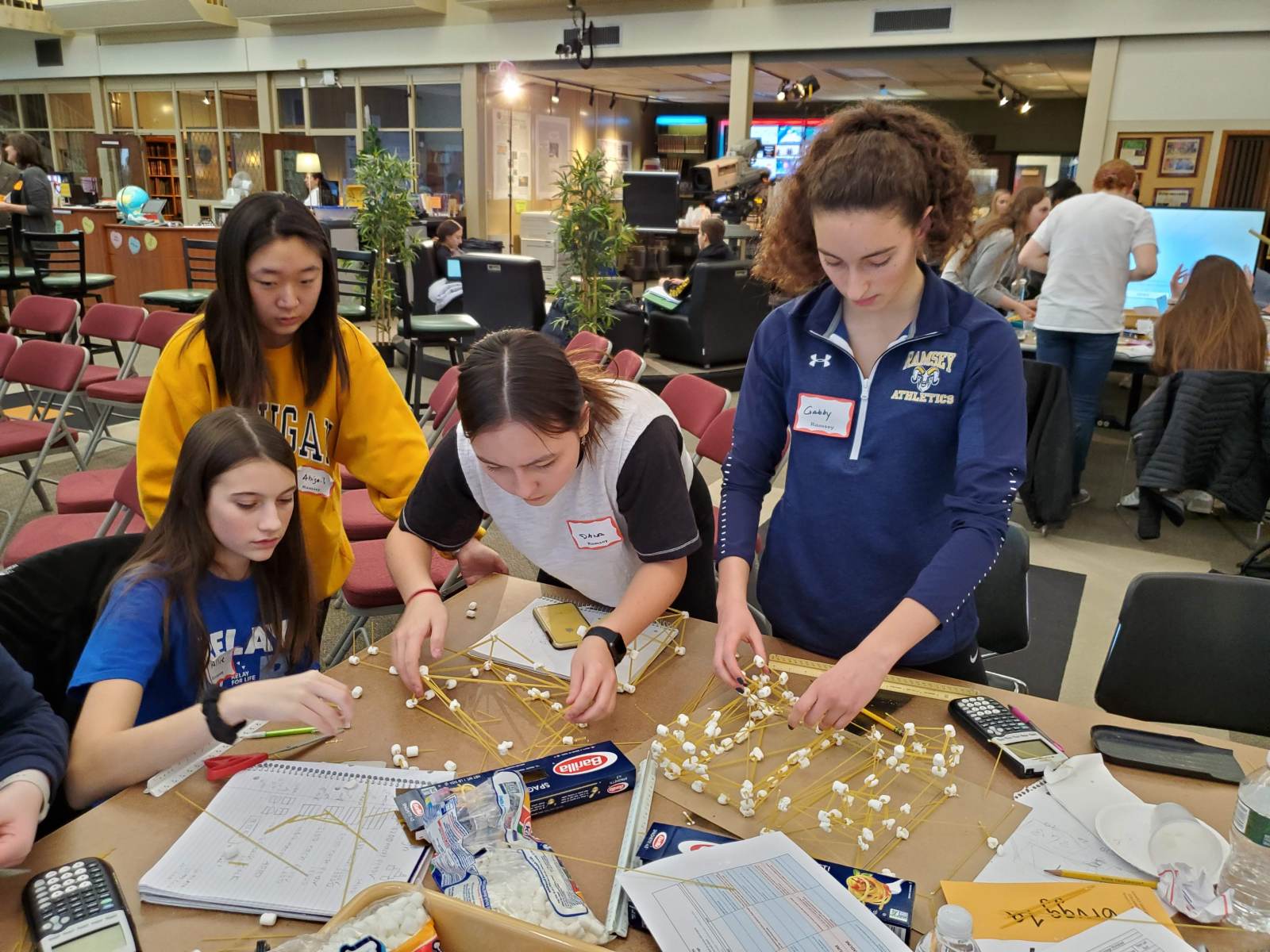 On February 6, 2020, Tenafly High School invited 96 young women from 12 NJ high schools to compete in the AIA NJ Women’s STEAM Tower Challenge. The project was designed by Joseph David, AIA, and co-chaired by Stacey Ruhle Kliesch, AIA, both past presidents of The Architects League of Northern New Jersey. Tenafly High School Teacher of Technology Education, Ghania Layachi, conceived the idea for the all-women STEAM event, arranged the logistics of the entire event and brought all of the participants together. According to Ms. Layacha, “The lack of girls in engineering and architecture motivated the officers of Tenafly Chapter of Society of Women Engineers(SWEnext) to plan this competition.”