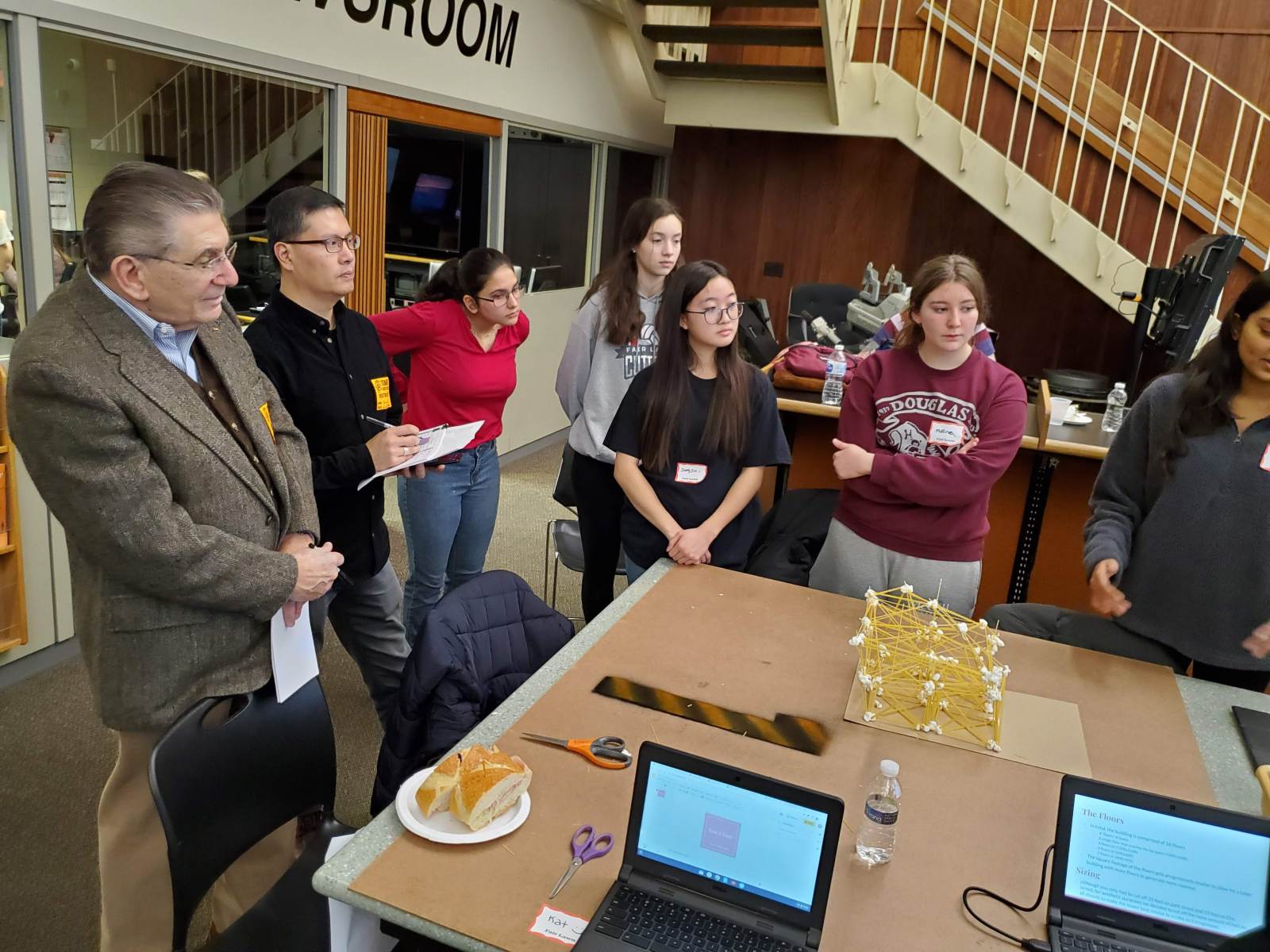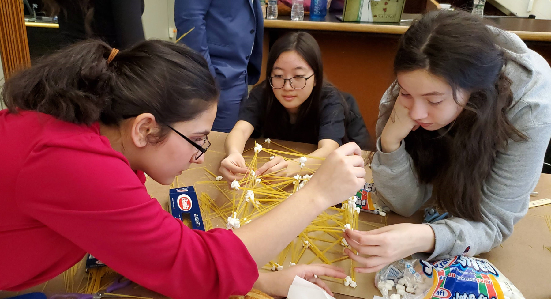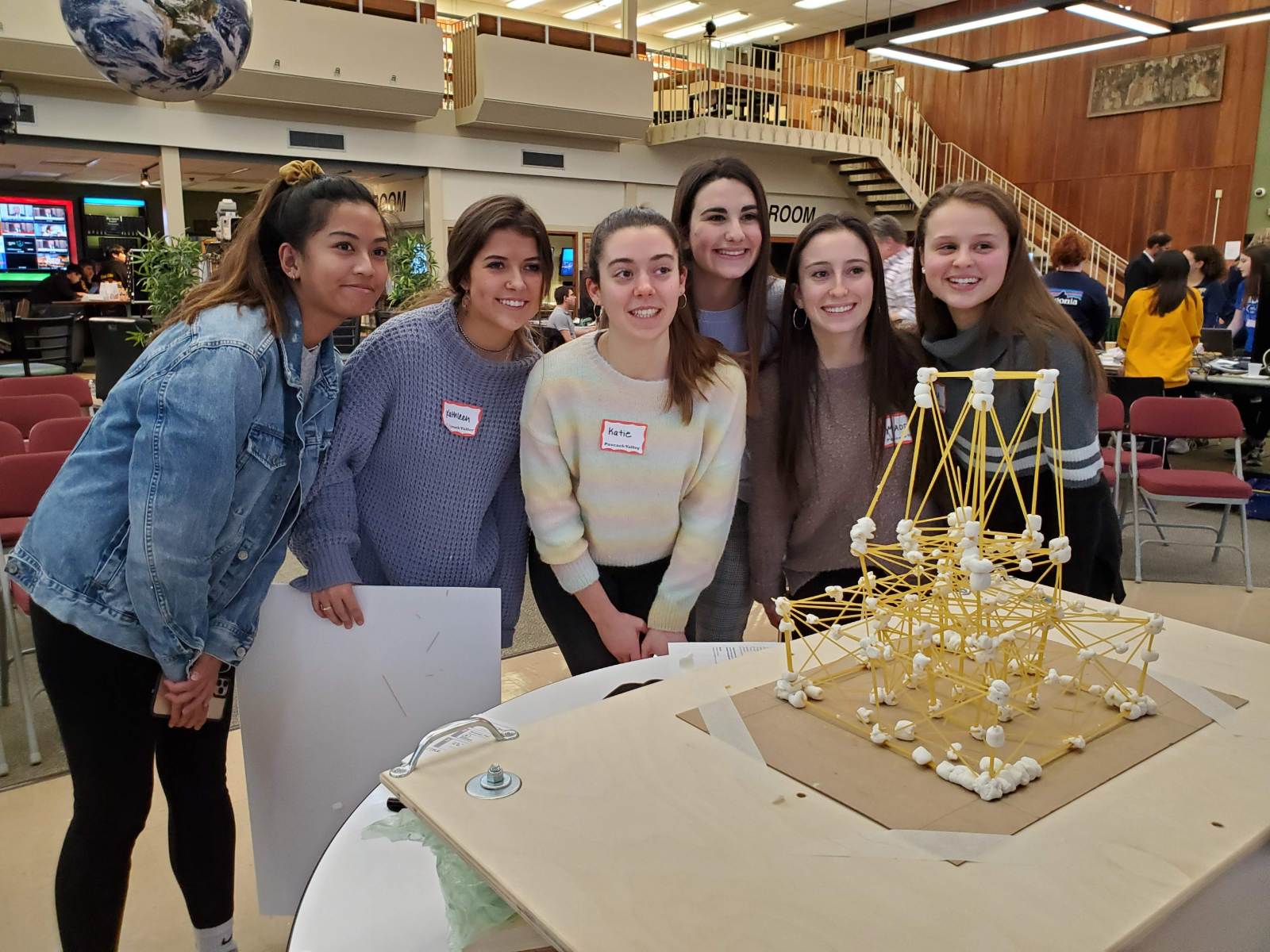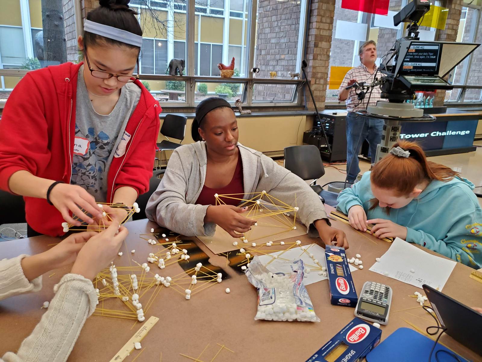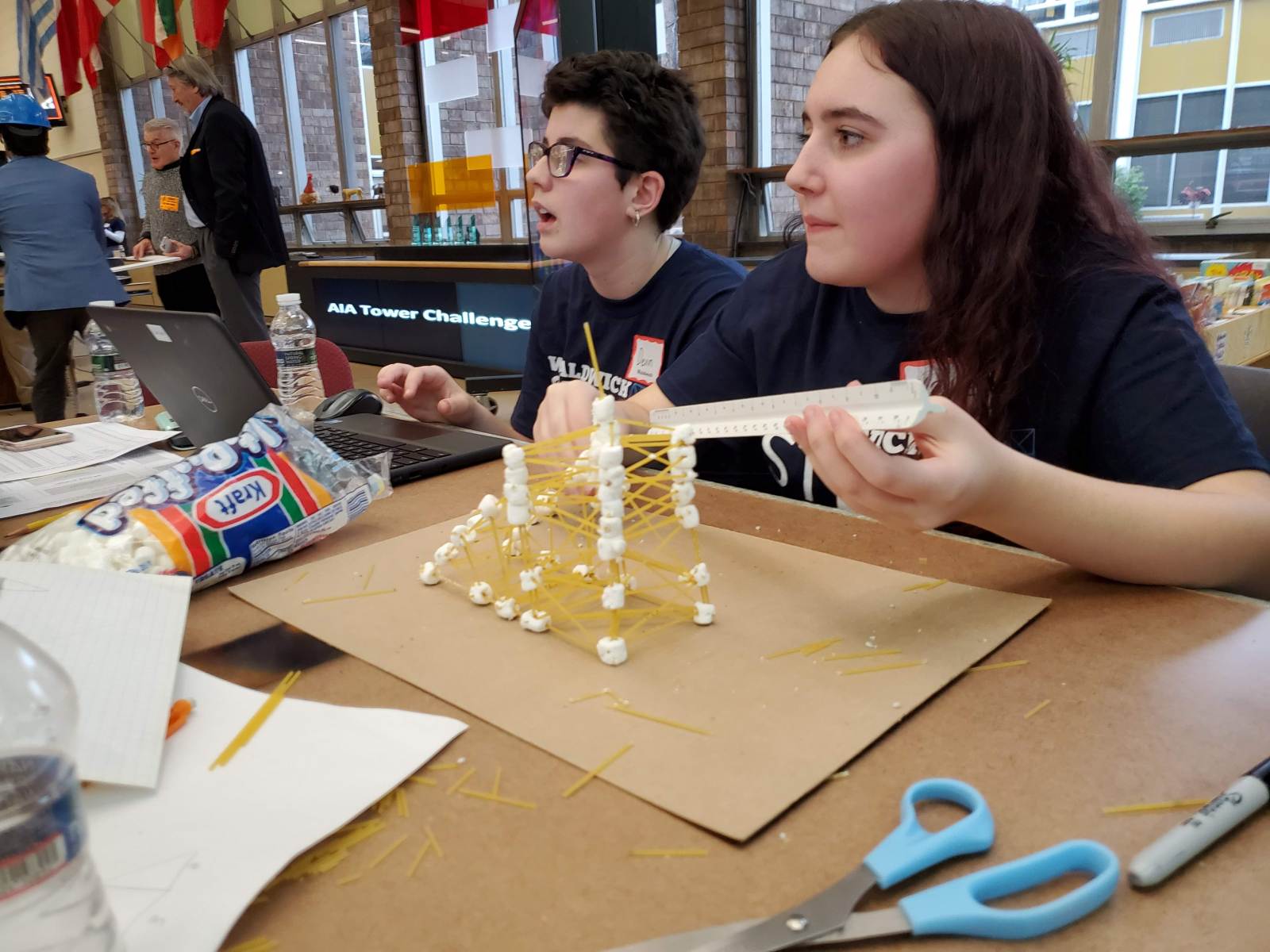 The project, designed and developed by Joseph David, AIA, challenged teams to experience some of the design challenges that architects face every day as they work together to design a residential tower. Points were awarded to teams that designed the highest building, the building with the most square footage as well as designs that explore creative solutions. Teams also assembled a simple study model from spaghetti and marshmallows representing their design’s structural system which was tested on a shake table to simulate seismic effects. The women arrived for the competition blind and were required to absorb the concepts and develop the solution all within the time constraints of the single school day competition. Each team had three hours to develop their design, build their model and prepare their presentation.