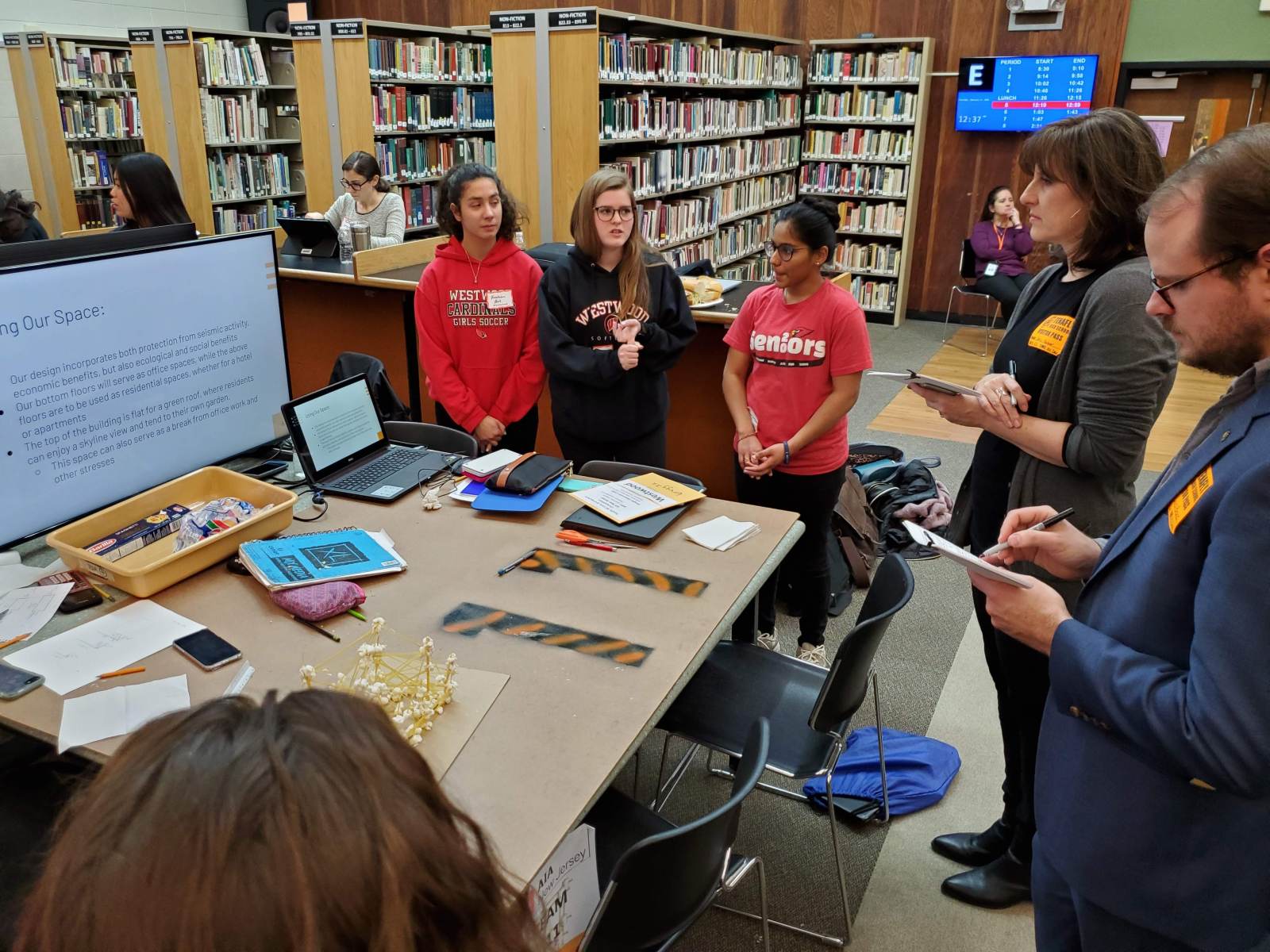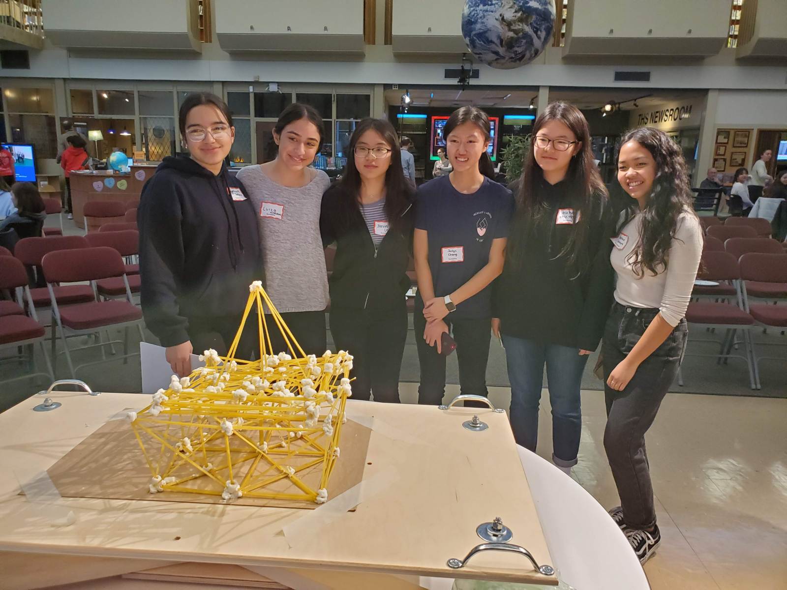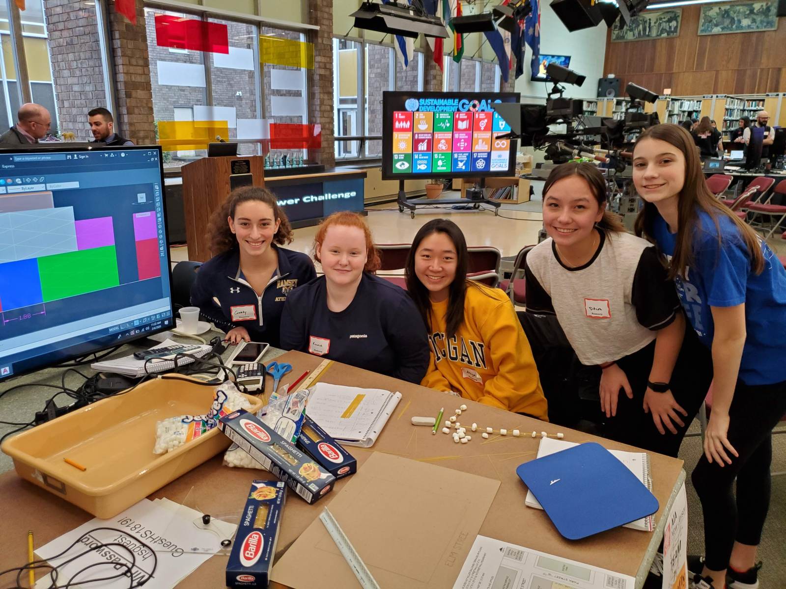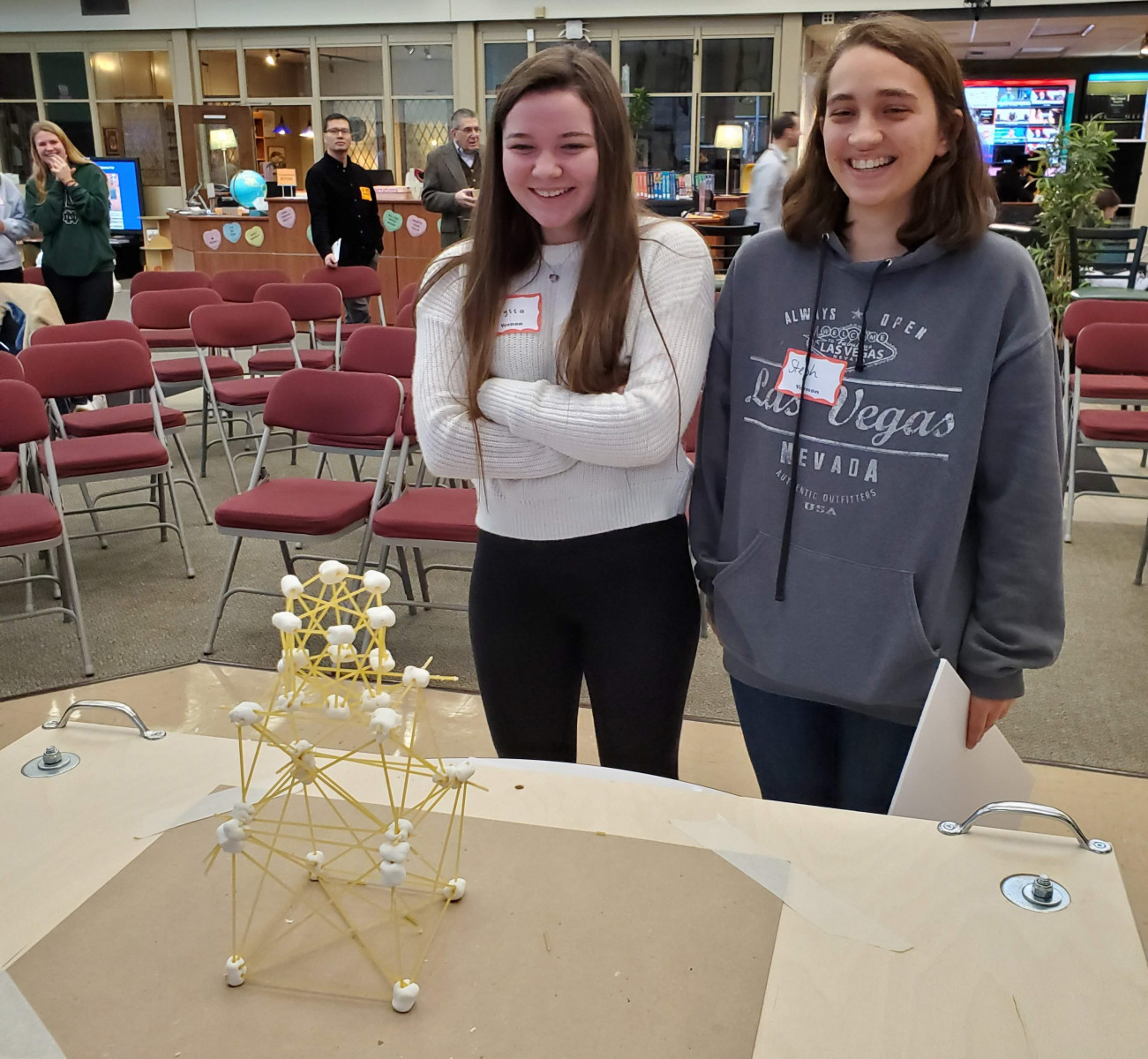 The project, designed and developed by Joseph David, AIA, challenged teams to experience some of the design challenges that architects face every day as they work together to design a residential tower. Points were awarded to teams that designed the highest building, the building with the most square footage as well as designs that explore creative solutions. Teams also assembled a simple study model from spaghetti and marshmallows representing their design’s structural system which was tested on a shake table to simulate seismic effects. The women arrived for the competition blind and were required to absorb the concepts and develop the solution all within the time constraints of the single school day competition. Each team had three hours to develop their design, build their model and prepare their presentation.
