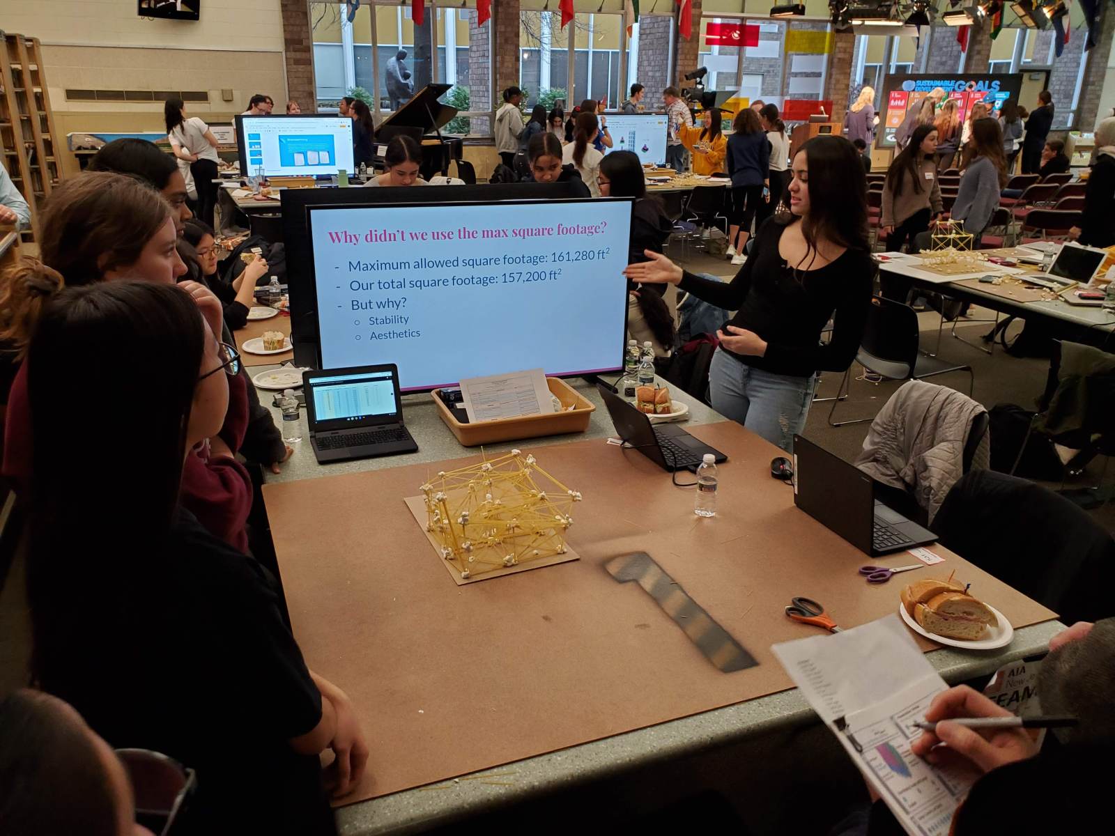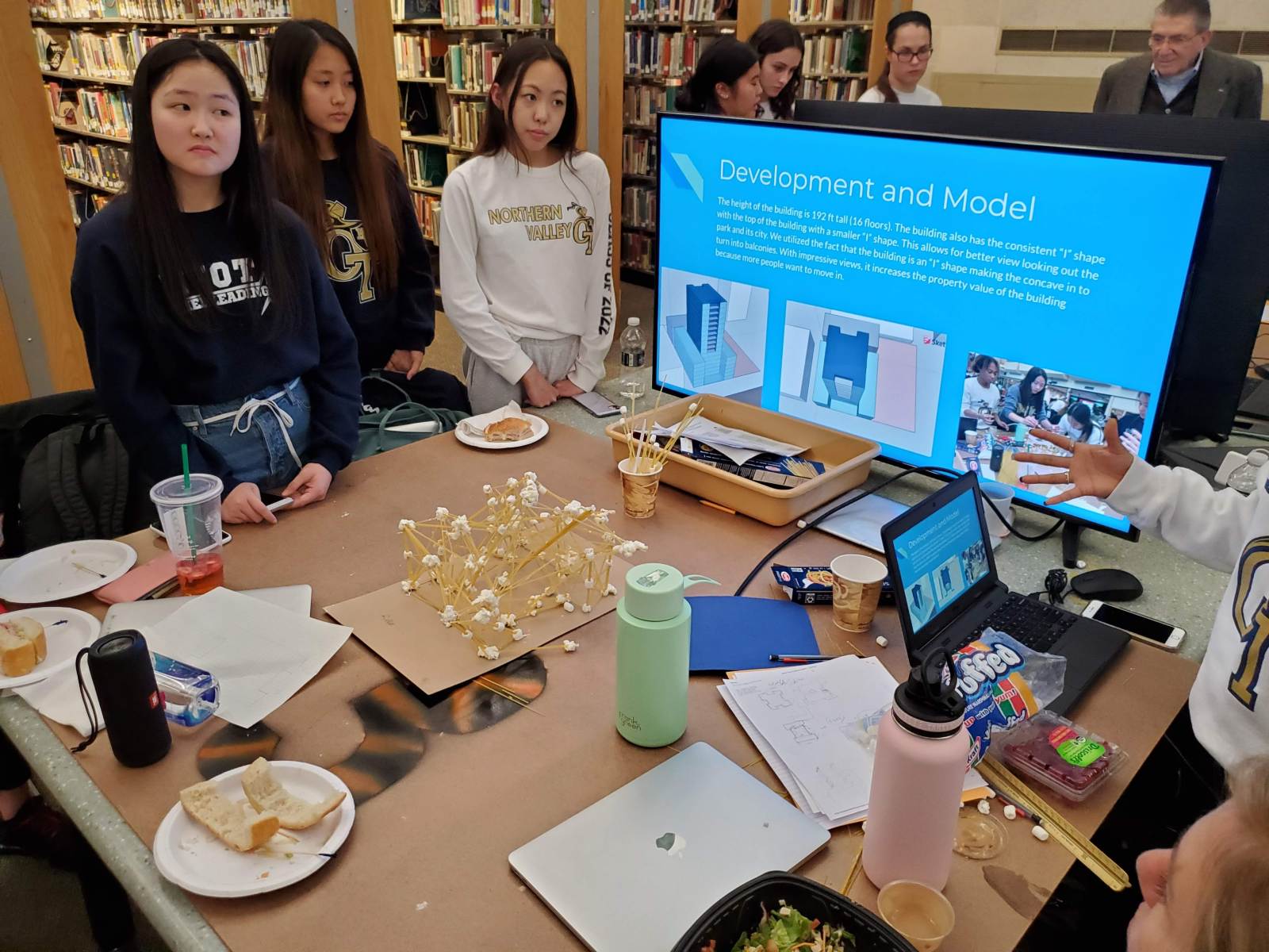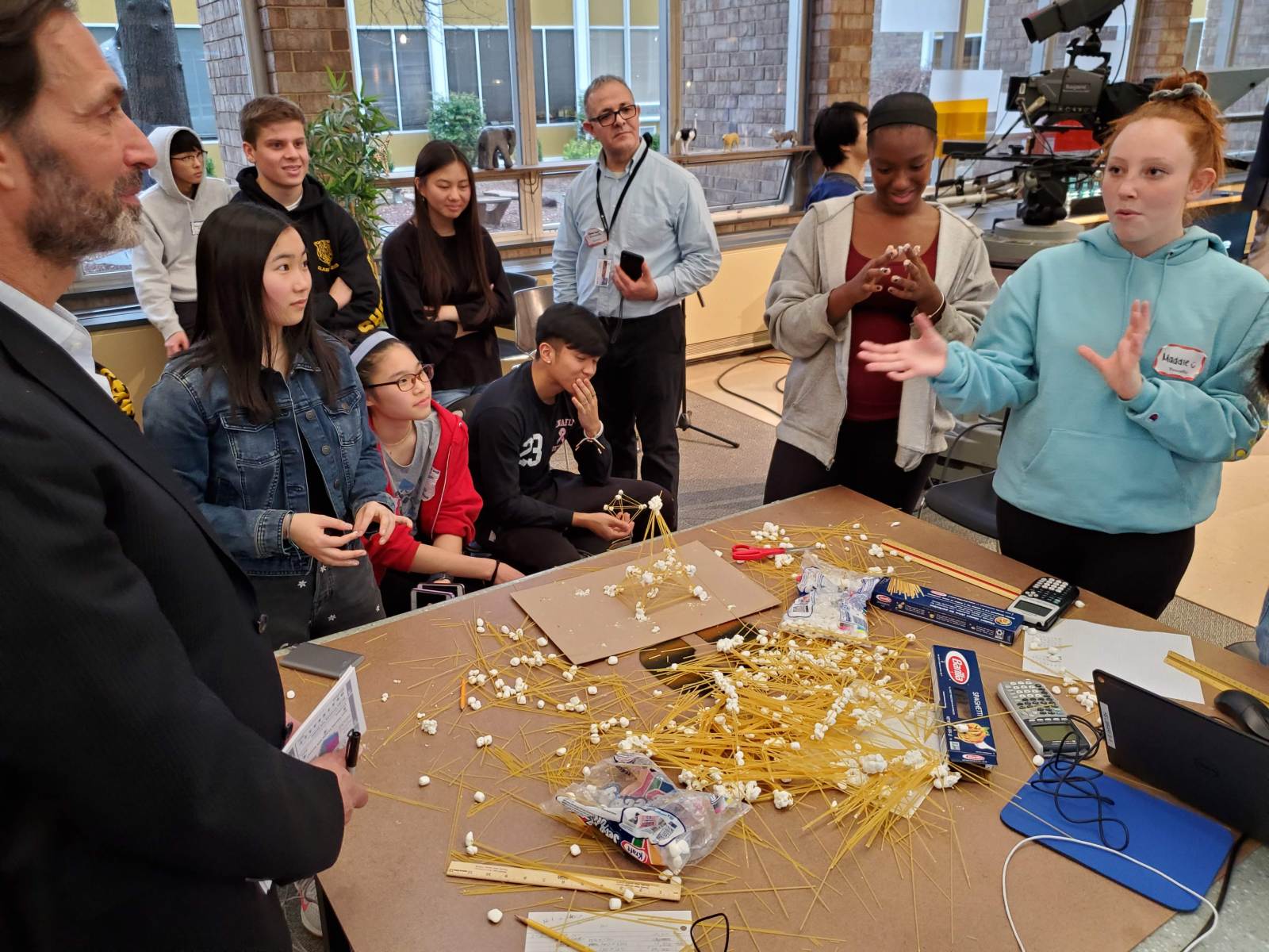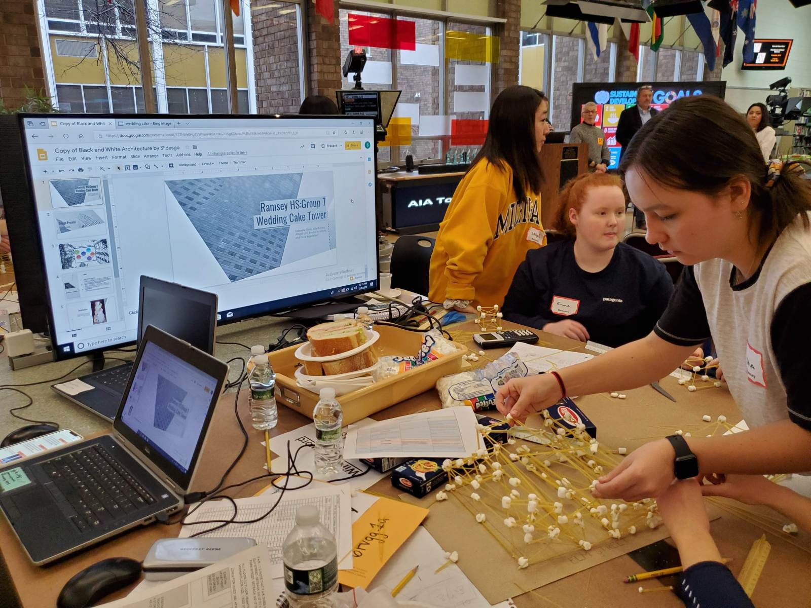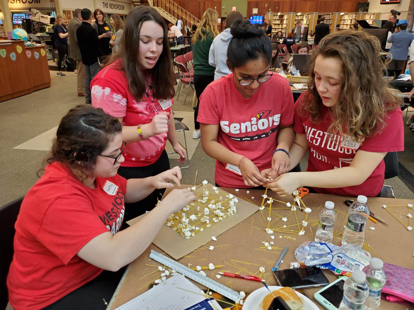 The project, designed and developed by Joseph David, AIA, challenged teams to experience some of the design challenges that architects face every day as they work together to design a residential tower. Points were awarded to teams that designed the highest building, the building with the most square footage as well as designs that explore creative solutions. Teams also assembled a simple study model from spaghetti and marshmallows representing their design’s structural system which was tested on a shake table to simulate seismic effects. The women arrived for the competition blind and were required to absorb the concepts and develop the solution all within the time constraints of the single school day competition. Each team had three hours to develop their design, build their model and prepare their presentation.