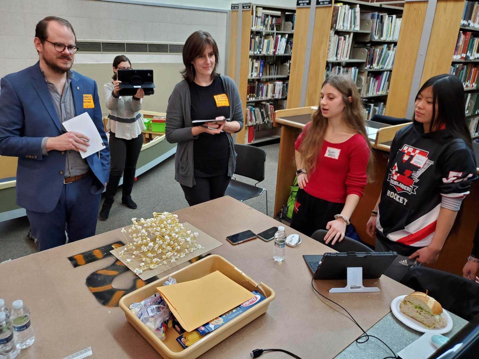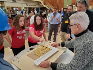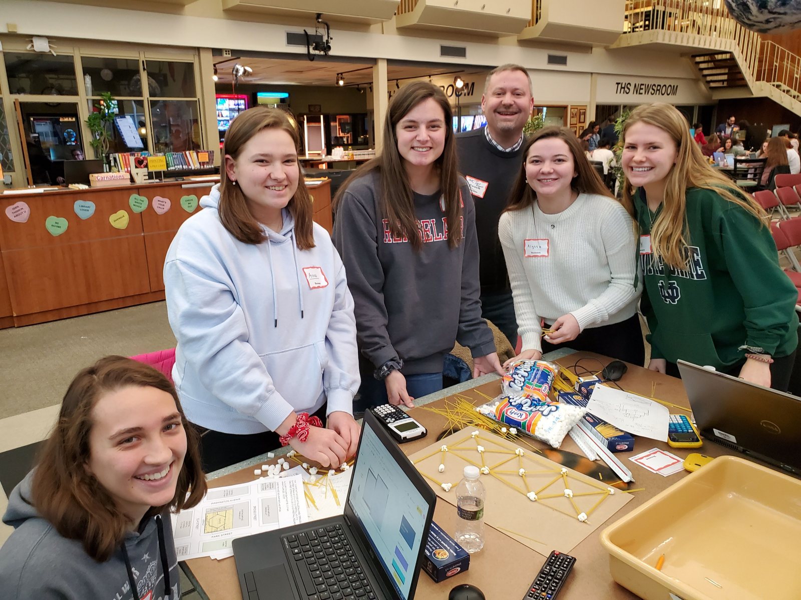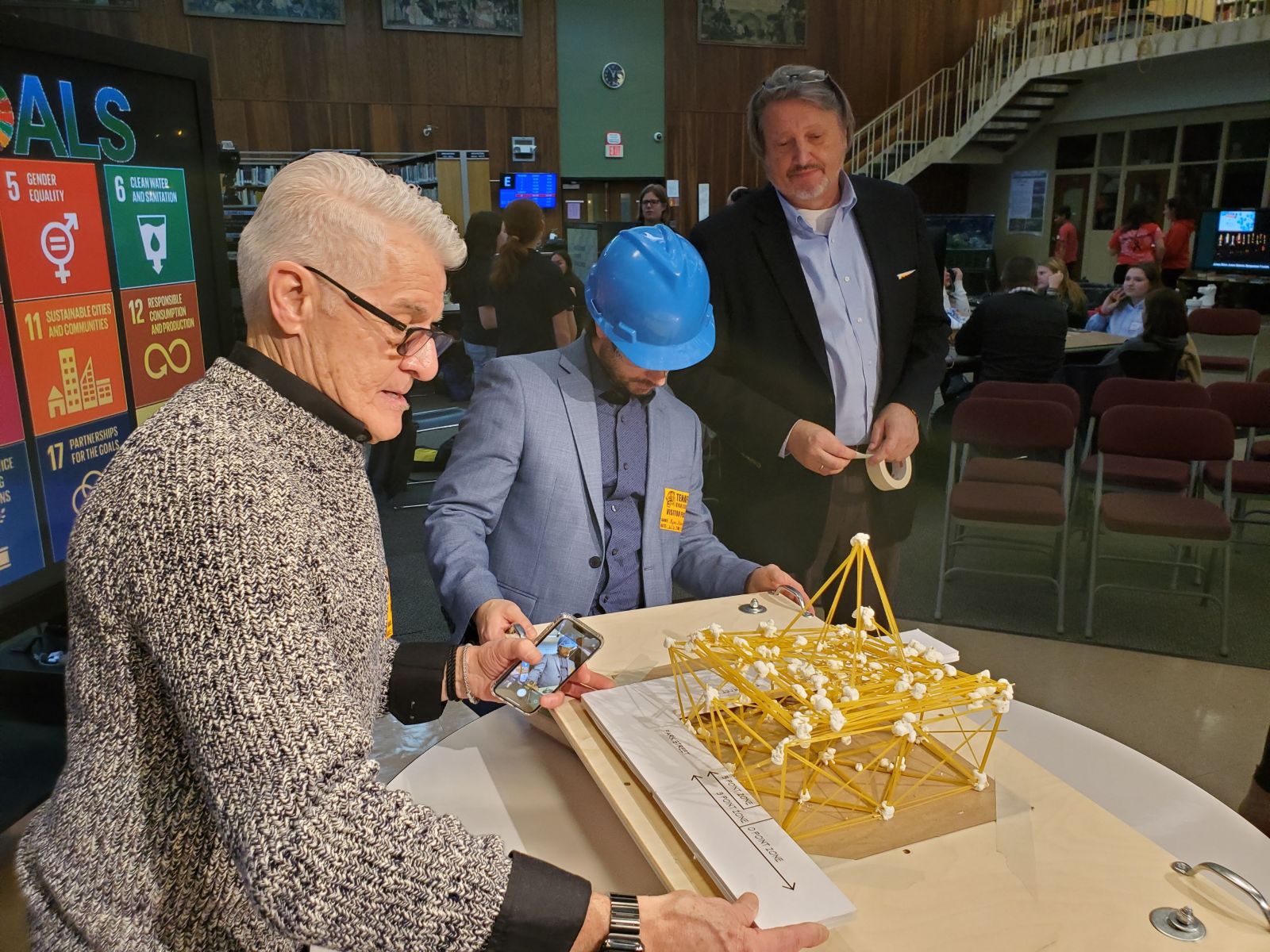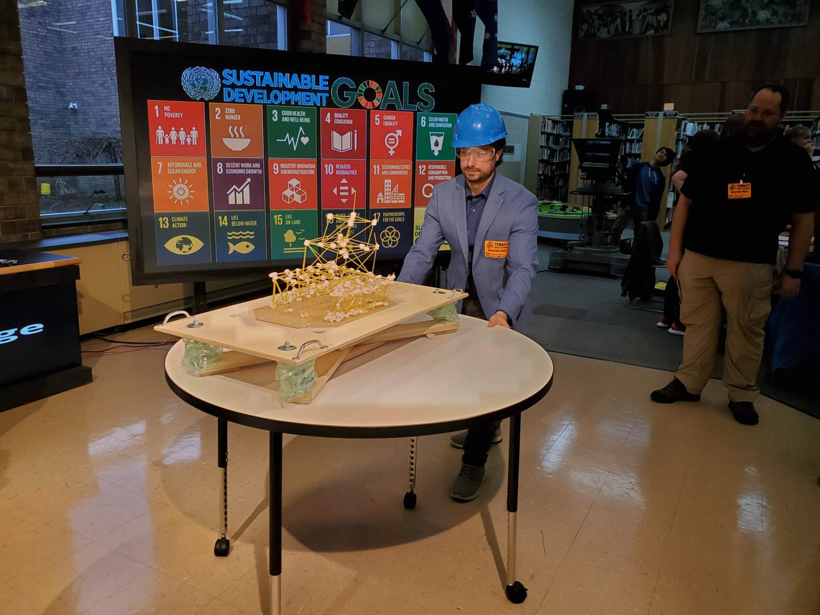 The project, designed and developed by Joseph David, AIA, challenged teams to experience some of the design challenges that architects face every day as they work together to design a residential tower. Points were awarded to teams that designed the highest building, the building with the most square footage as well as designs that explore creative solutions. Teams also assembled a simple study model from spaghetti and marshmallows representing their design’s structural system which was tested on a shake table to simulate seismic effects. The women arrived for the competition blind and were required to absorb the concepts and develop the solution all within the time constraints of the single school day competition. Each team had three hours to develop their design, build their model and prepare their presentation.