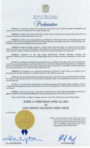 AIA New Jersey 2023 President, Ron Weston, AIA, lauded Governor Phil Murphy and Lieutenant Governor Sheila Oliver for co-signing the recent State of New Jersey Proclamation designating this weeklong celebration of architecture and architects in the Garden State.