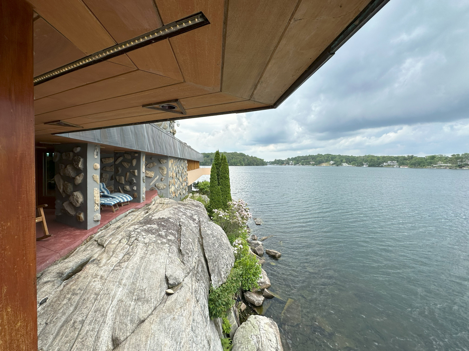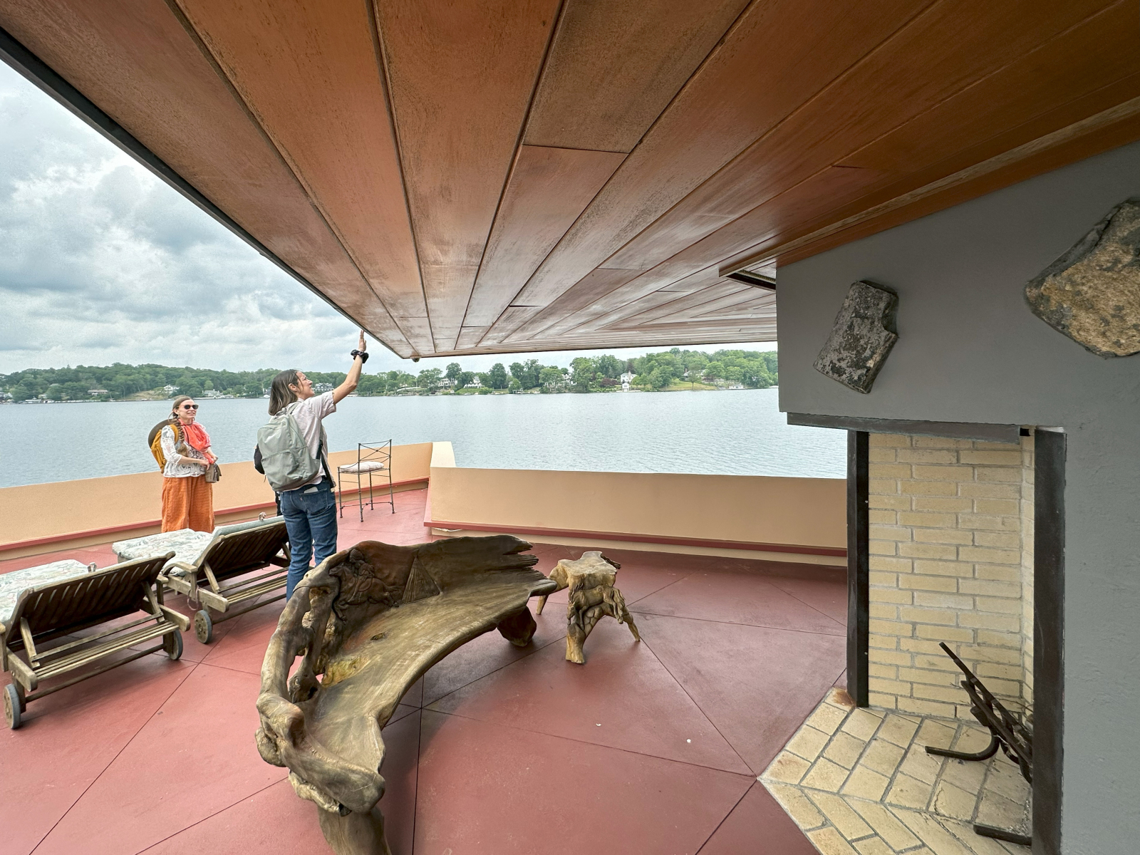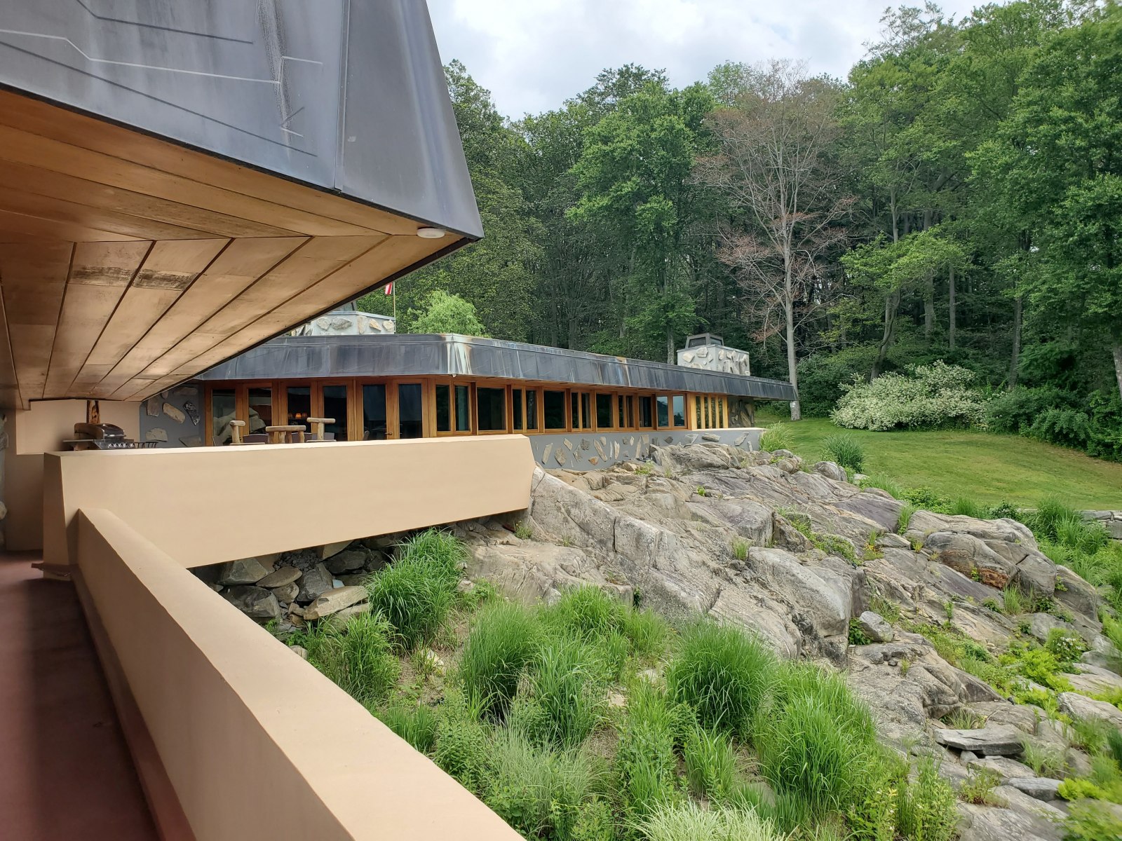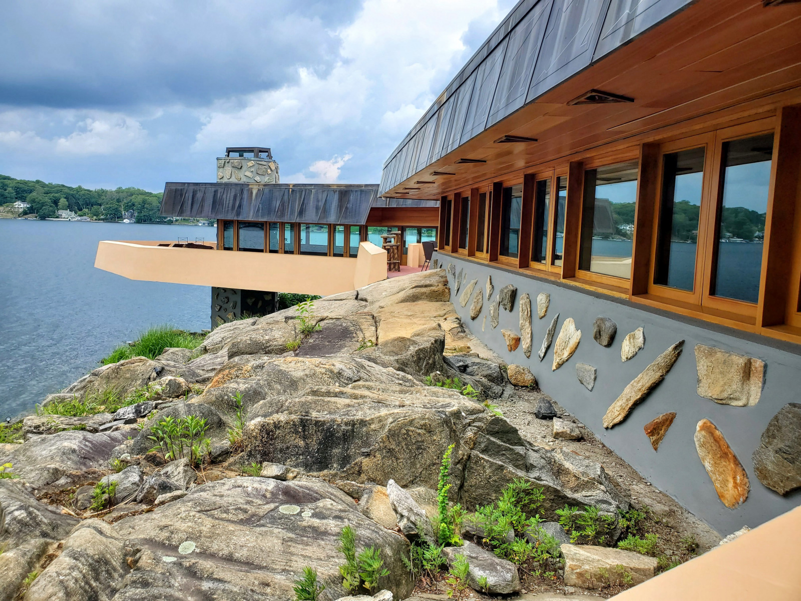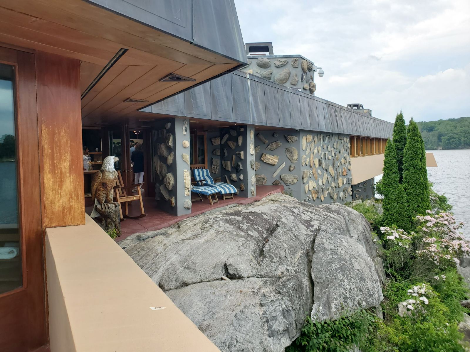 In June, we celebrate Frank Lloyd Wright’s Birthday. To commemorate the occasion, five AIA New Jersey members took a guided tour of Petra Island in Mahopac, NY, to visit the Chahroudi House, designed by Frank Lloyd Wright, and the Massaro House, inspired by a Frank Lloyd Wright (FLW) design for the same site. Current owner of the island and both residences, Joseph Massaro, conducted the tour.