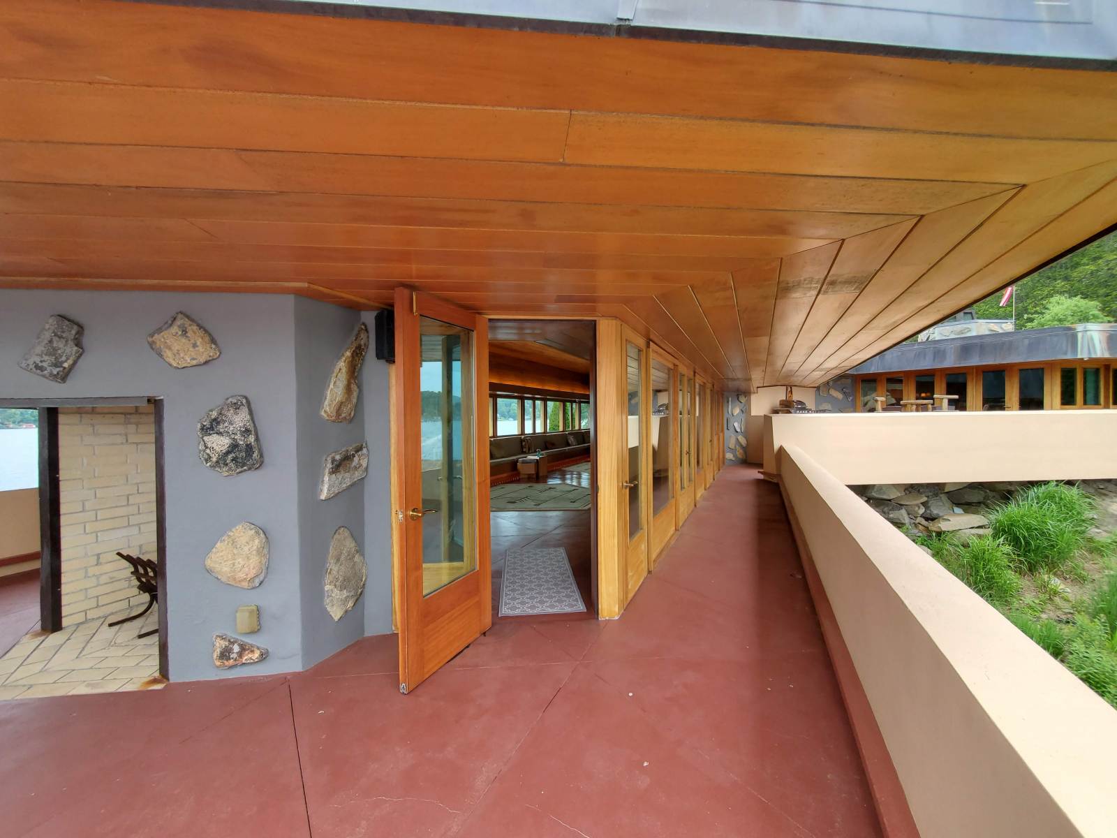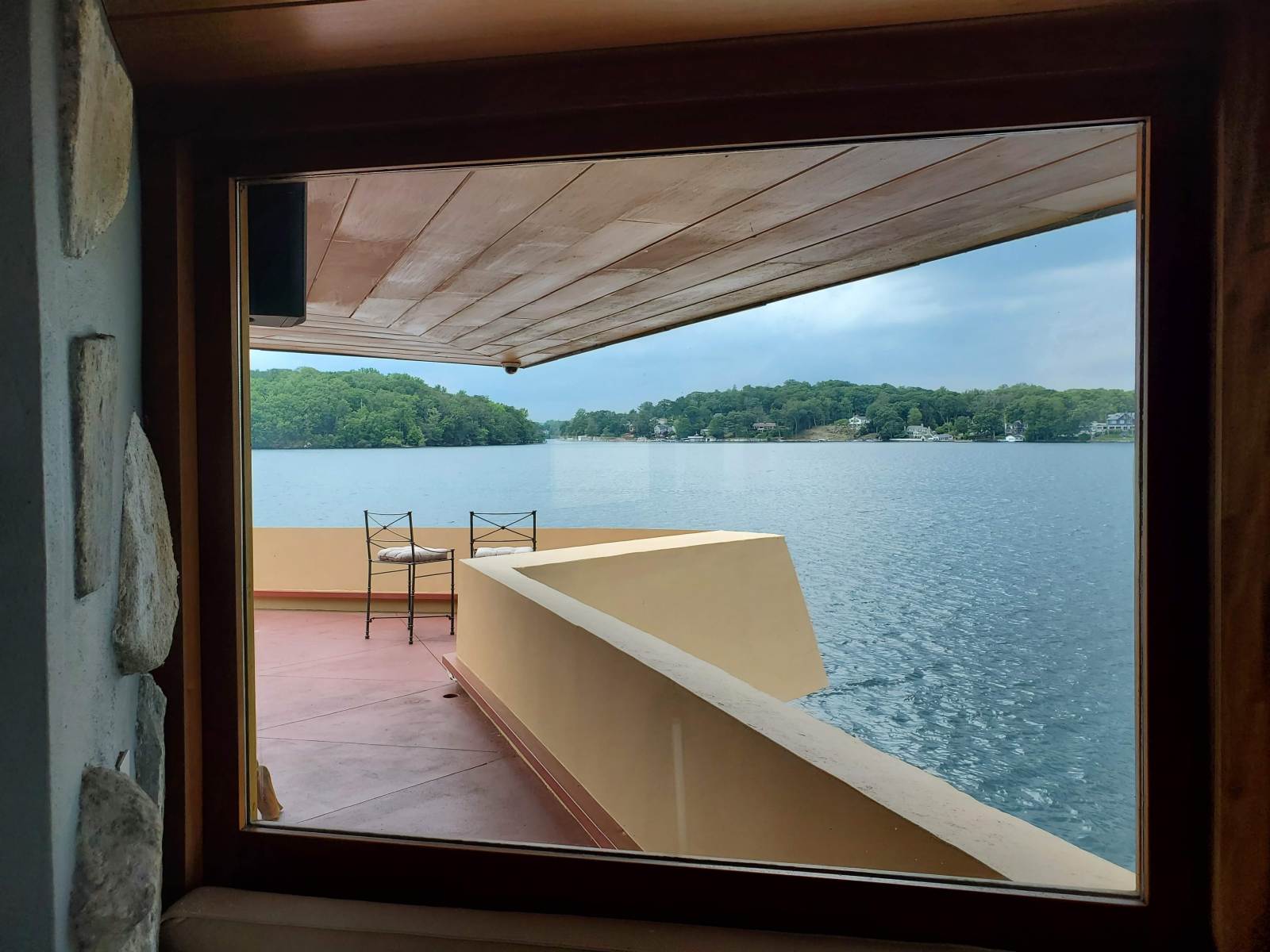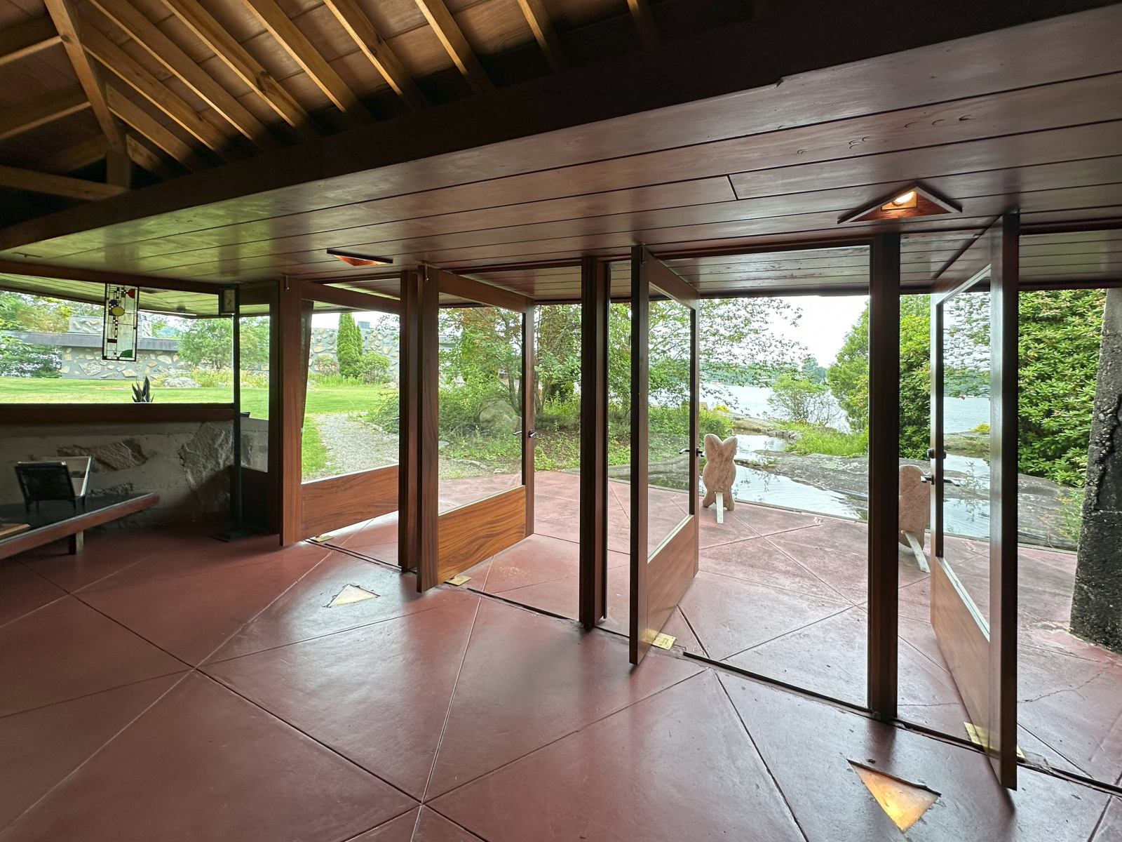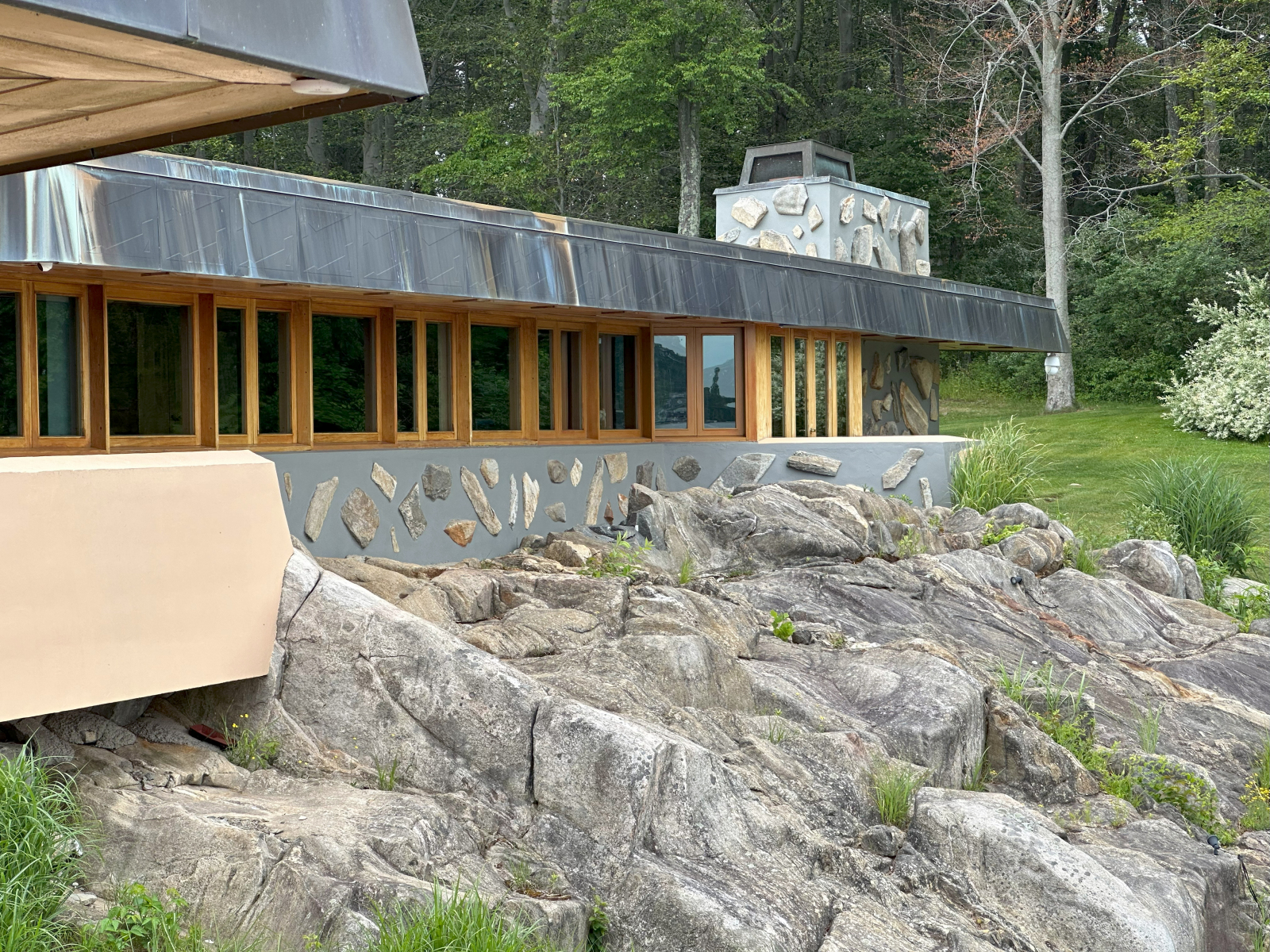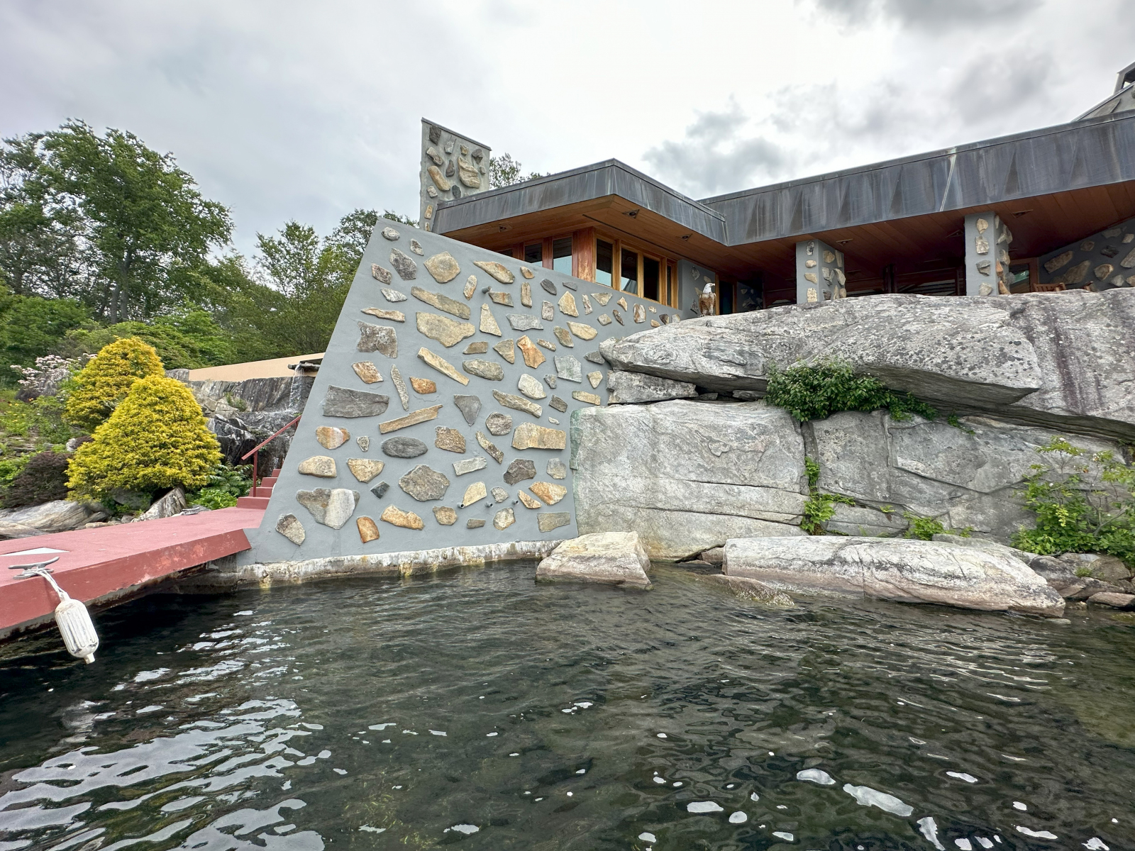 In June, we celebrate Frank Lloyd Wright’s Birthday. To commemorate the occasion, five AIA New Jersey members took a guided tour of Petra Island in Mahopac, NY, to visit the Chahroudi House, designed by Frank Lloyd Wright, and the Massaro House, inspired by a Frank Lloyd Wright (FLW) design for the same site. Current owner of the island and both residences, Joseph Massaro, conducted the tour.