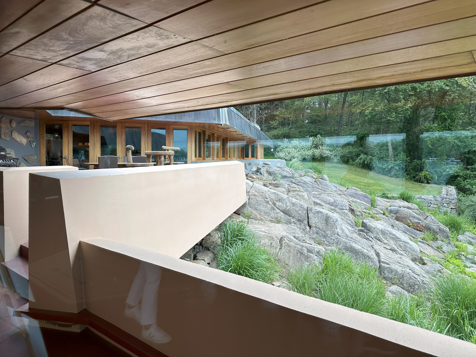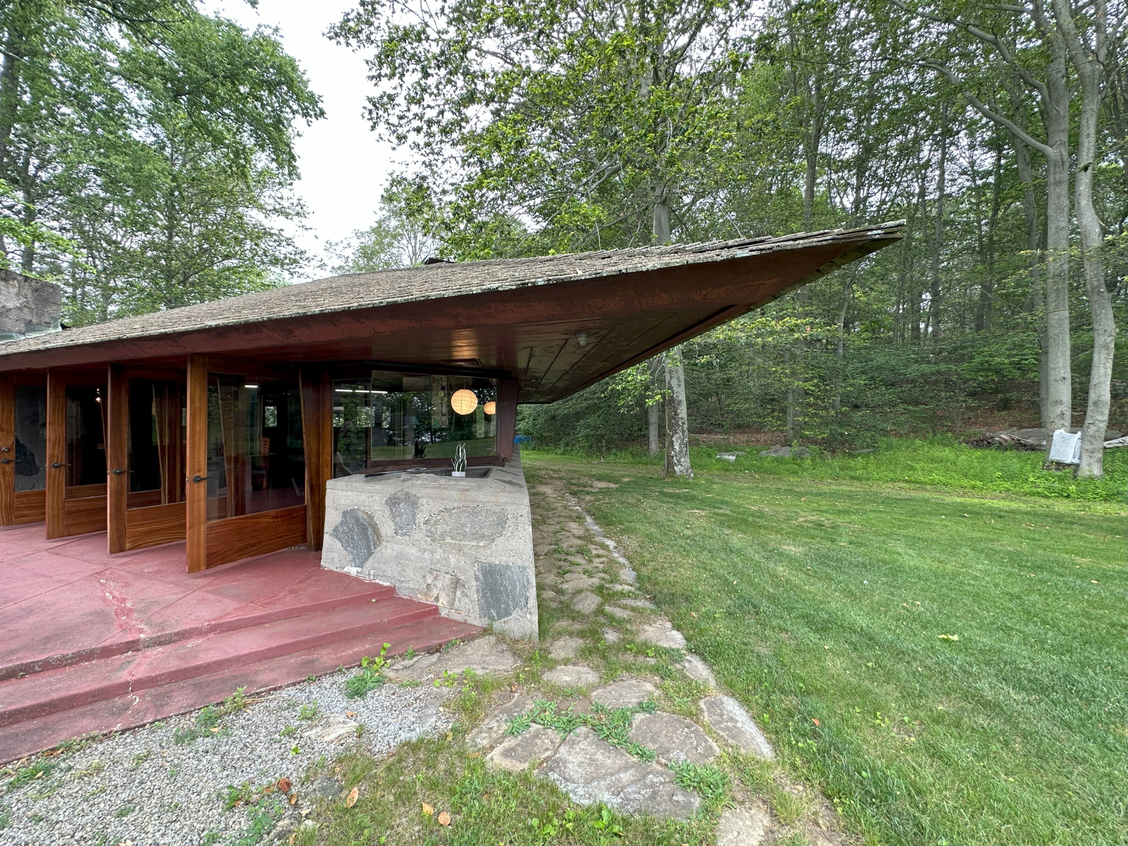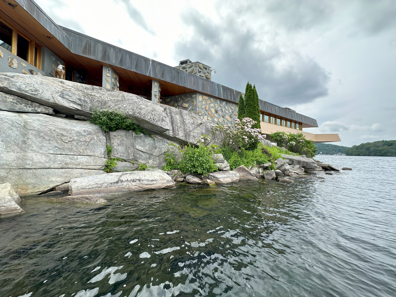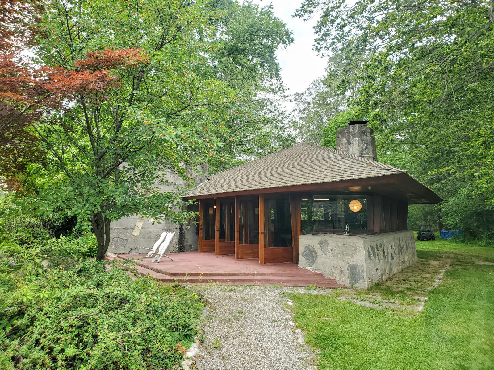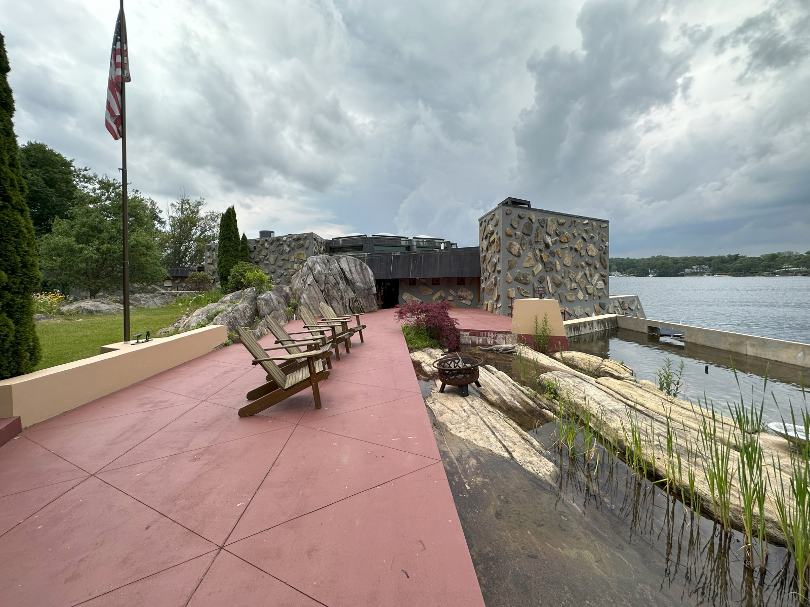 In June, we celebrate Frank Lloyd Wright’s Birthday. To commemorate the occasion, five AIA New Jersey members took a guided tour of Petra Island in Mahopac, NY, to visit the Chahroudi House, designed by Frank Lloyd Wright, and the Massaro House, inspired by a Frank Lloyd Wright (FLW) design for the same site. Current owner of the island and both residences, Joseph Massaro, conducted the tour.