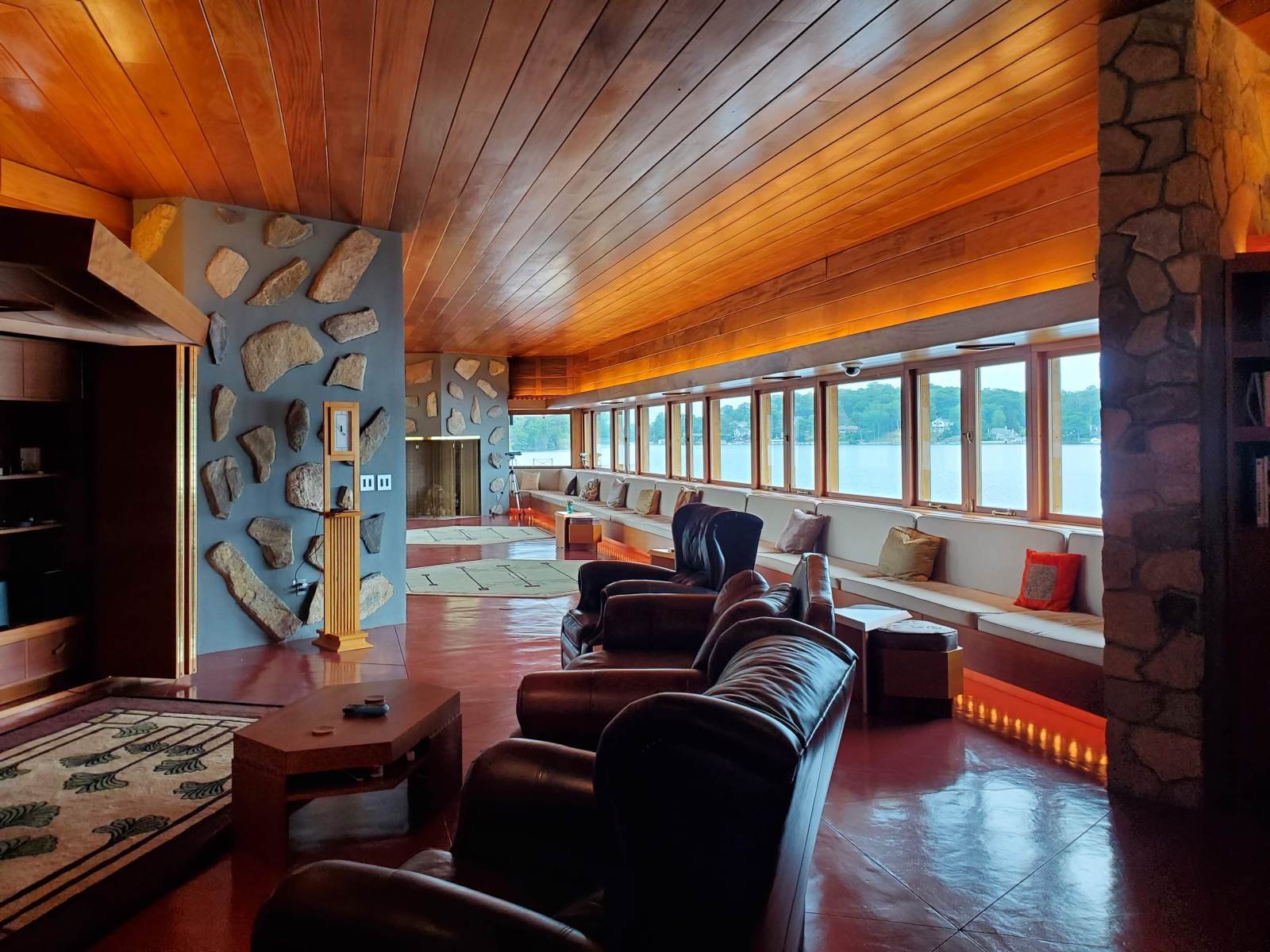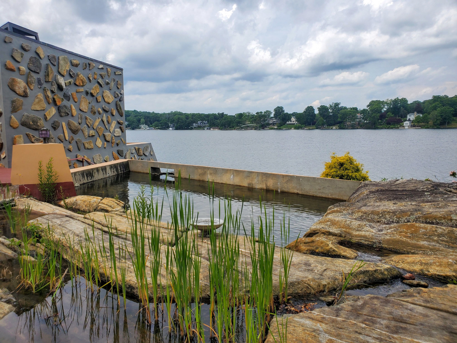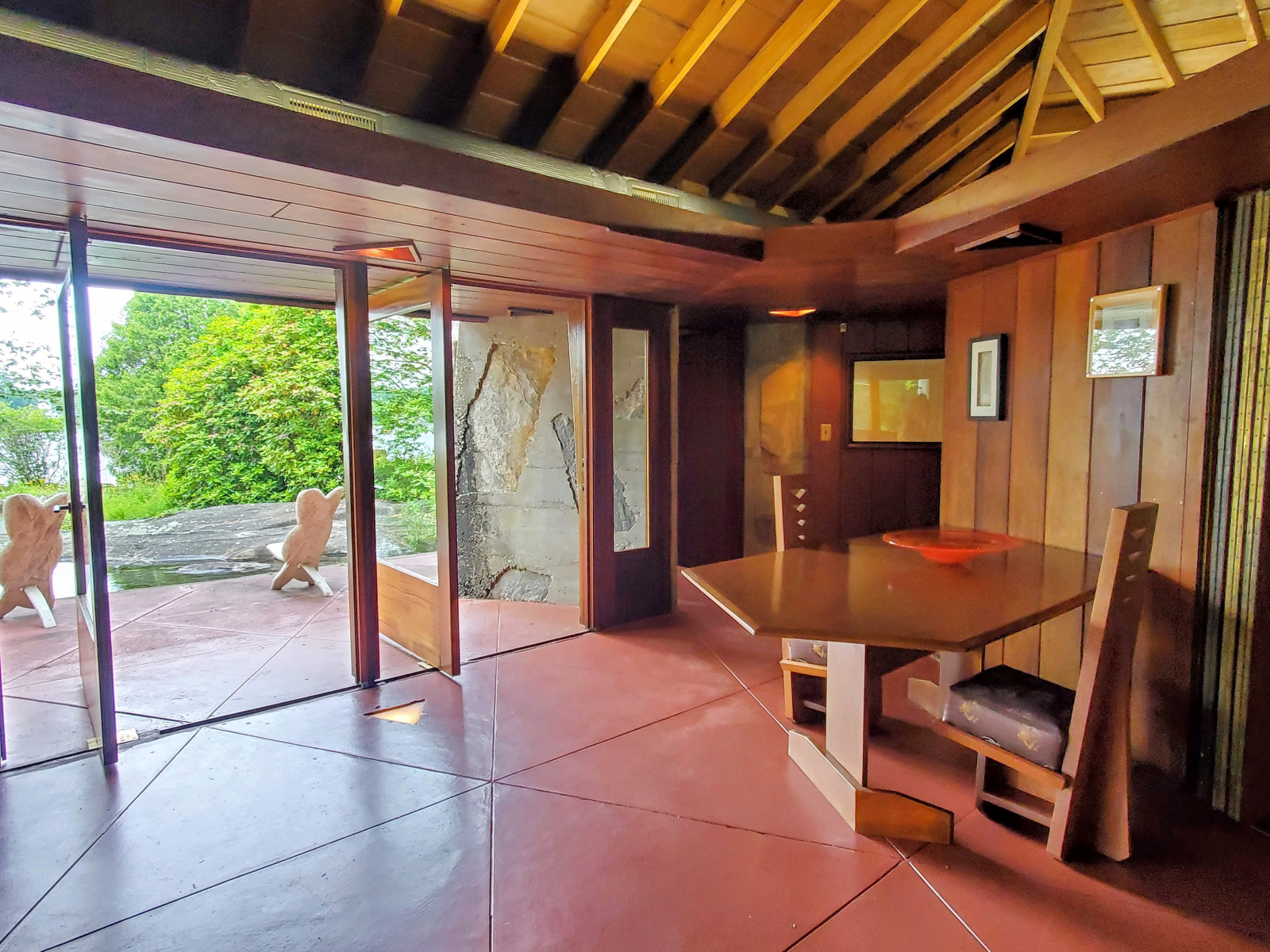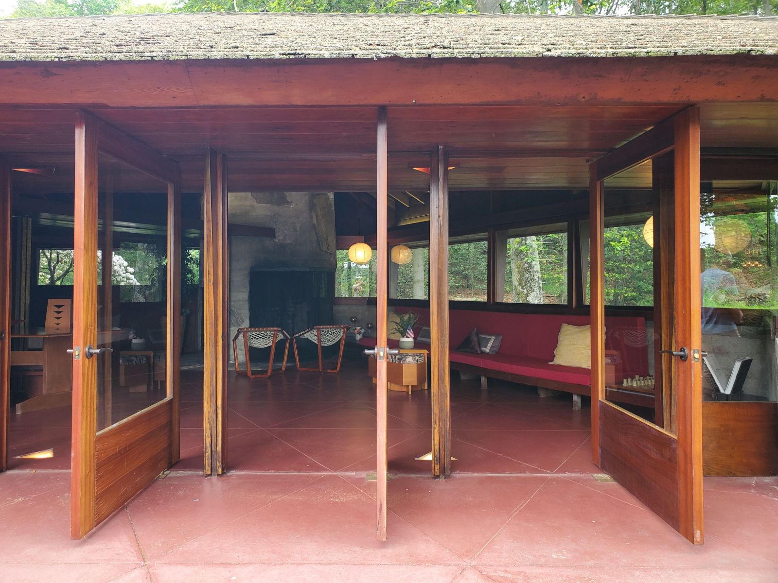 In June, we celebrate Frank Lloyd Wright’s Birthday. To commemorate the occasion, five AIA New Jersey members took a guided tour of Petra Island in Mahopac, NY, to visit the Chahroudi House, designed by Frank Lloyd Wright, and the Massaro House, inspired by a Frank Lloyd Wright (FLW) design for the same site. Current owner of the island and both residences, Joseph Massaro, conducted the tour.