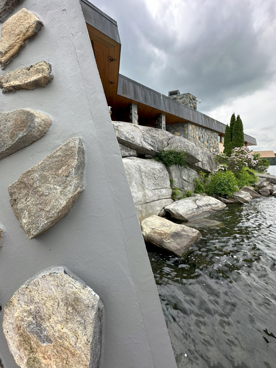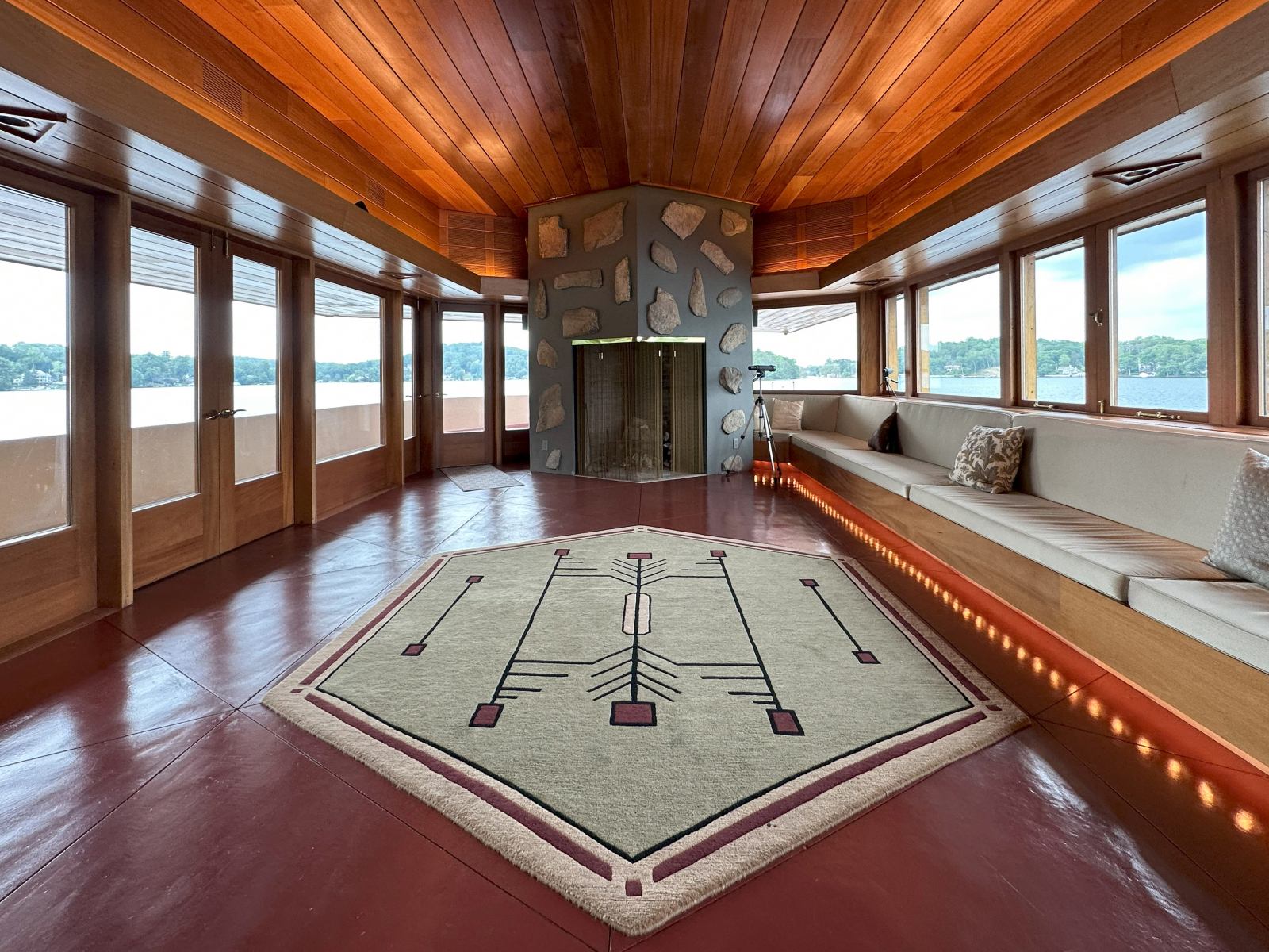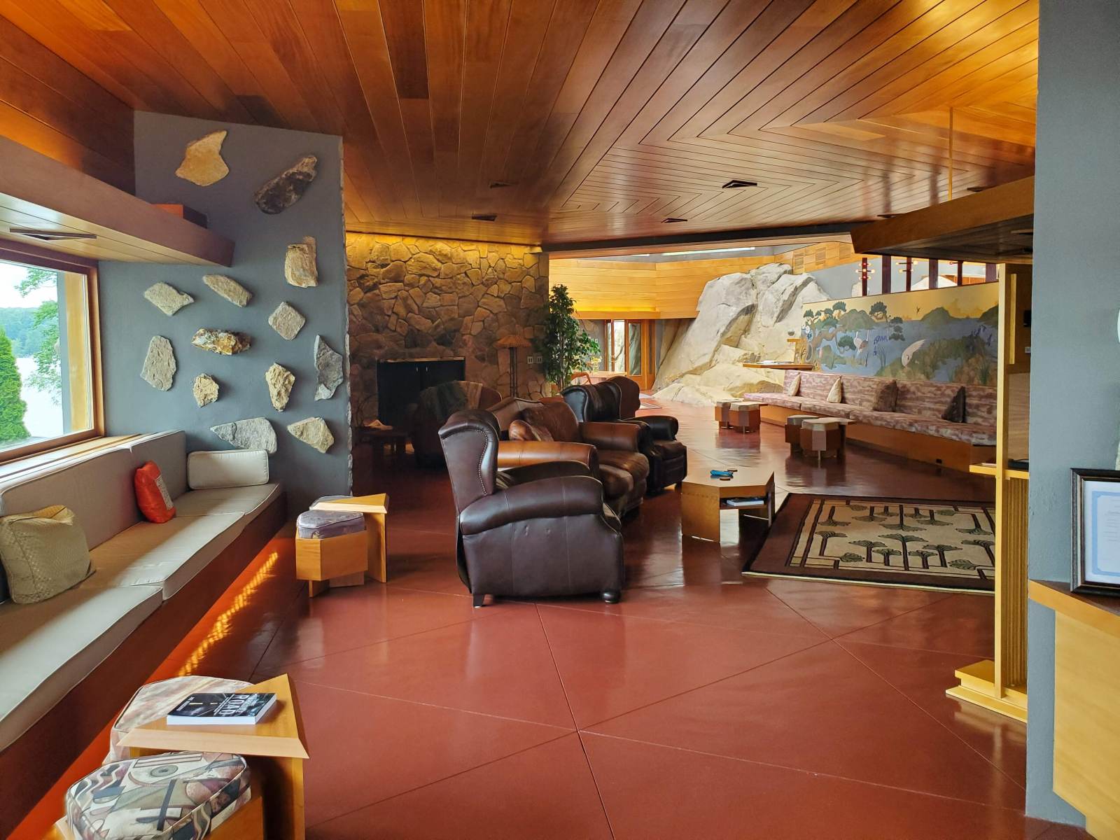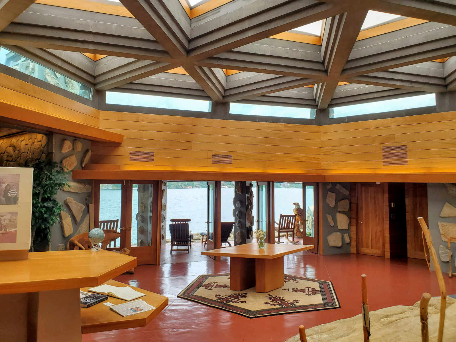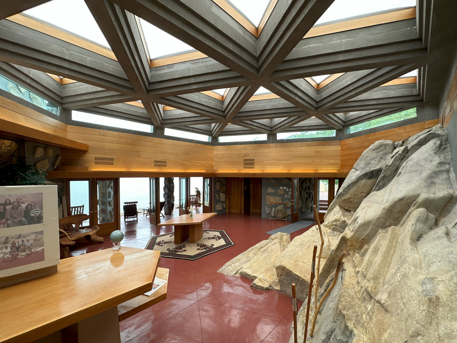 In 2000, Joe began the permitting process and construction commenced in 2002. Tour attendee Helen Logan, AIA, noted, “One of the fascinating facts for me was that one winter the ice in the lake was over 3ft thick, enabling the construction crew to easily transport materials and heavy machinery across the water to the construction site! After the ice thawed, it was too late to remove the backhoe, so it’s still on the island!”