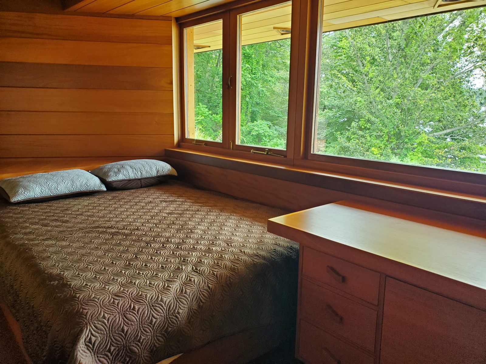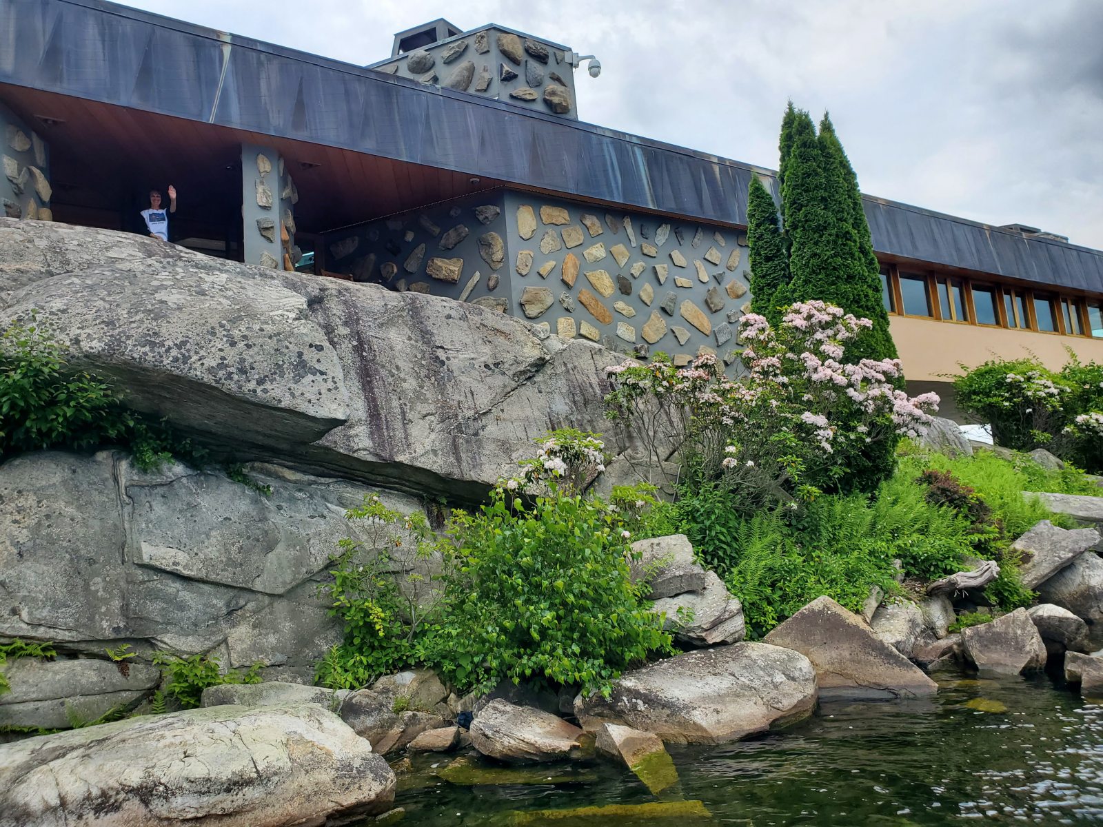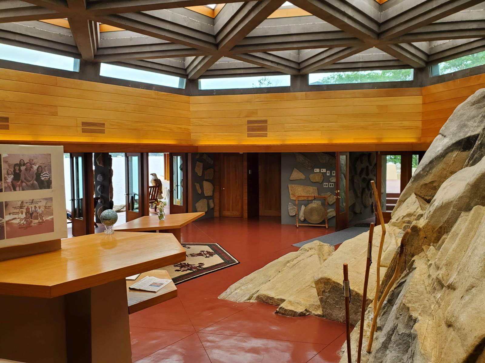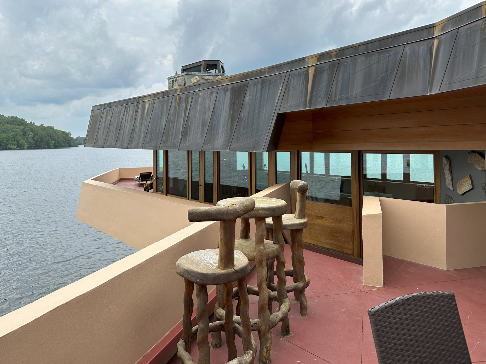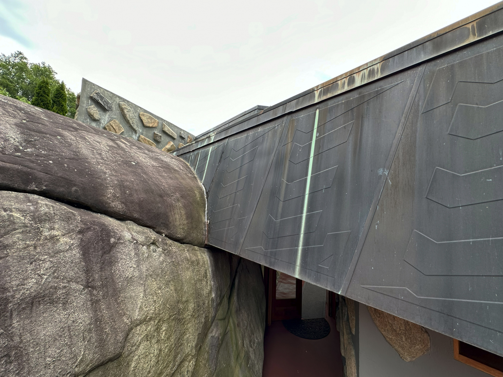In 2000, Joe began the permitting process and construction commenced in 2002. Tour attendee Helen Logan, AIA, noted, “One of the fascinating facts for me was that one winter the ice in the lake was over 3ft thick, enabling the construction crew to easily transport materials and heavy machinery across the water to the construction site! After the ice thawed, it was too late to remove the backhoe, so it’s still on the island!”