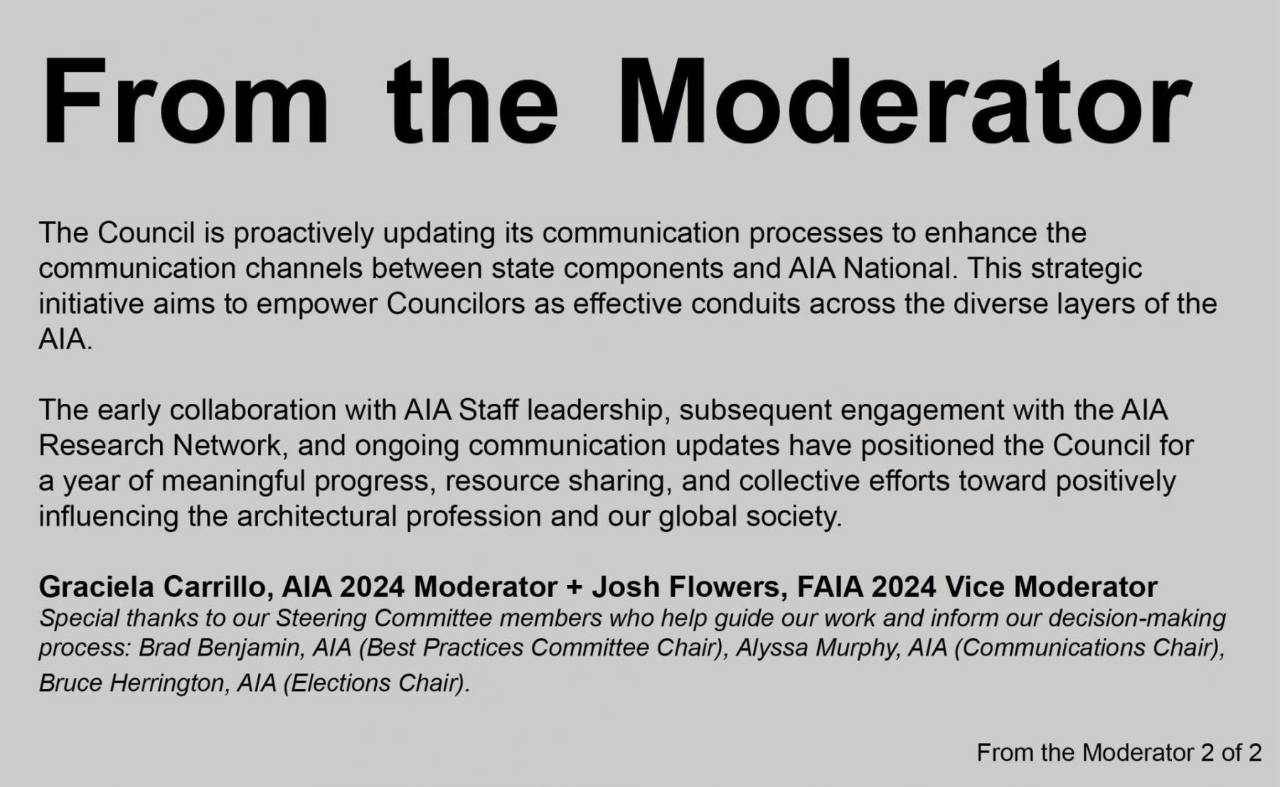 Graciela Carrillo, AIA 2024 Moderator + Josh Flowers, FAIA 2024 Vice Moderator