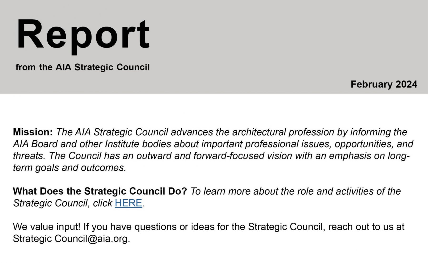 We value input! If you have questions or ideas for the Strategic Council, contact us at StrategicCouncil@aia.org.