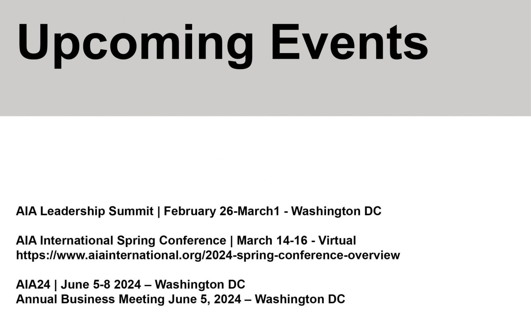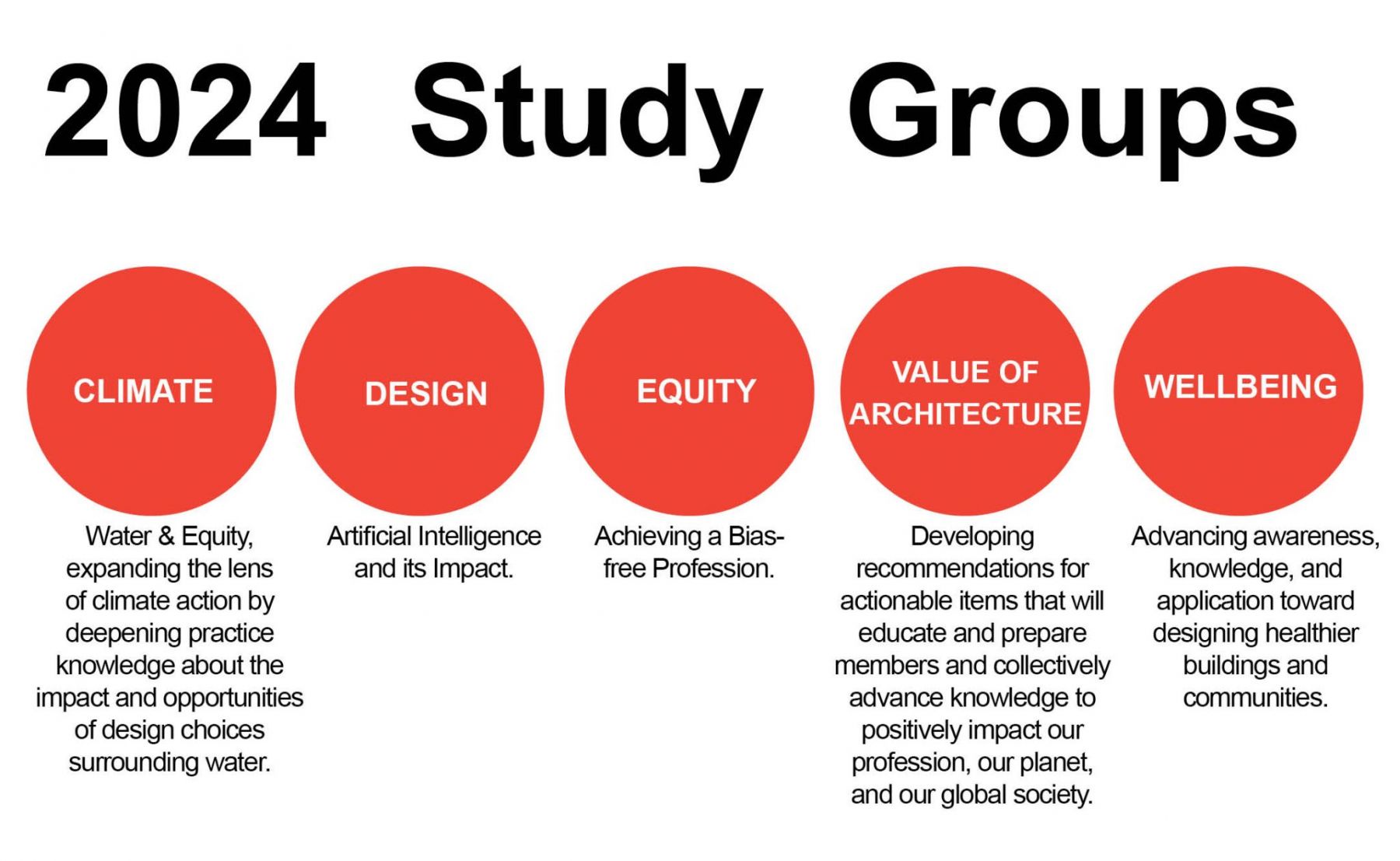 The 2024 Strategic Council has formed five study groups researching the following topics. In January, the co-chairs of each study group met with AIA Staff leadership to exchange resources and identify potential synergies with AIA's ongoing initiatives. This meeting enabled us to pinpoint key AIA personnel who would actively contribute to the study meetings, fostering further collaboration and resource sharing.