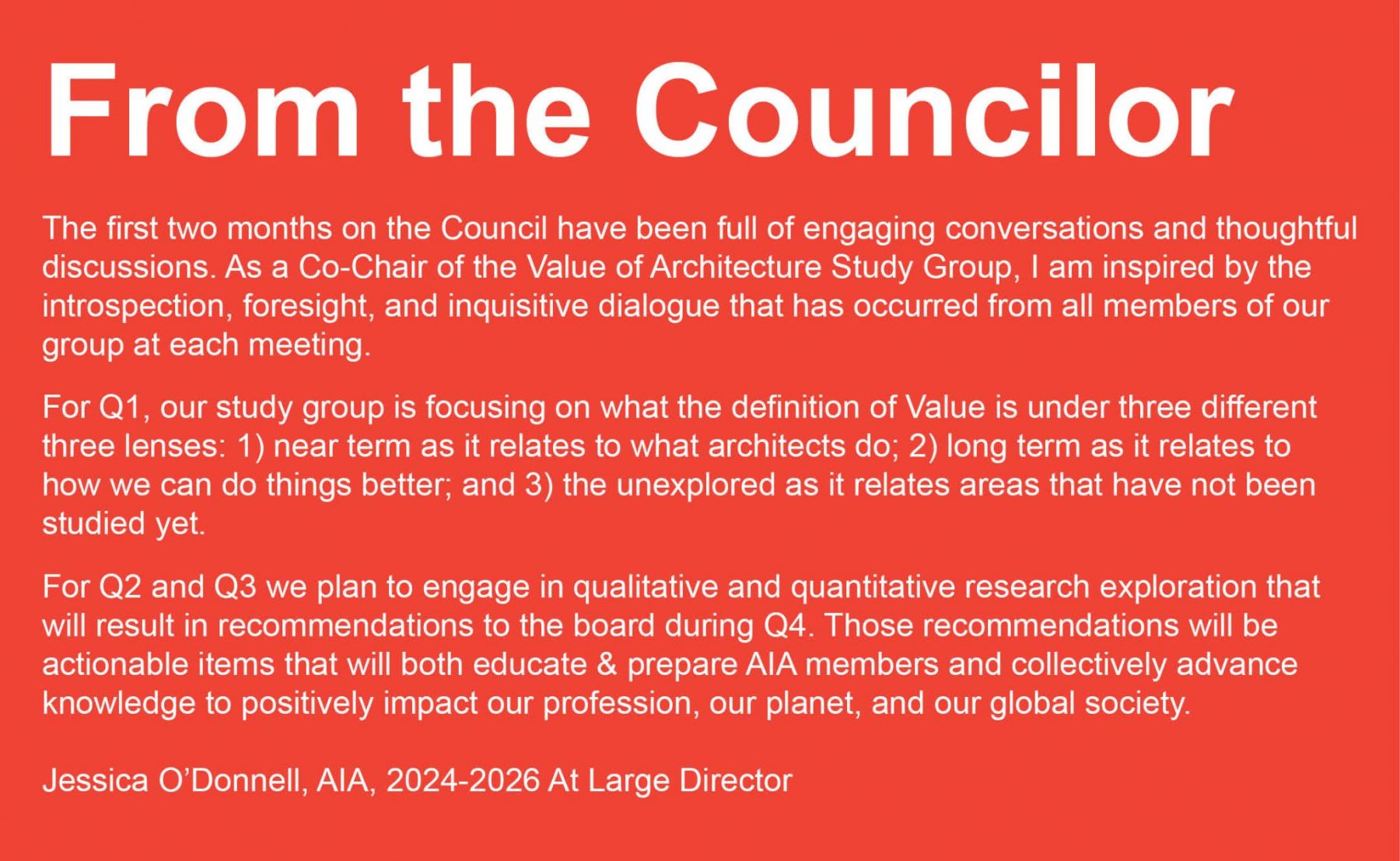 The first two months on the Council have been full of engaging conversations and thoughtful discussions. As a Co-Chair of the Value of Architecture Study Group, I am inspired by the introspection, foresight, and inquisitive dialogue that has occurred from all group members at each meeting.