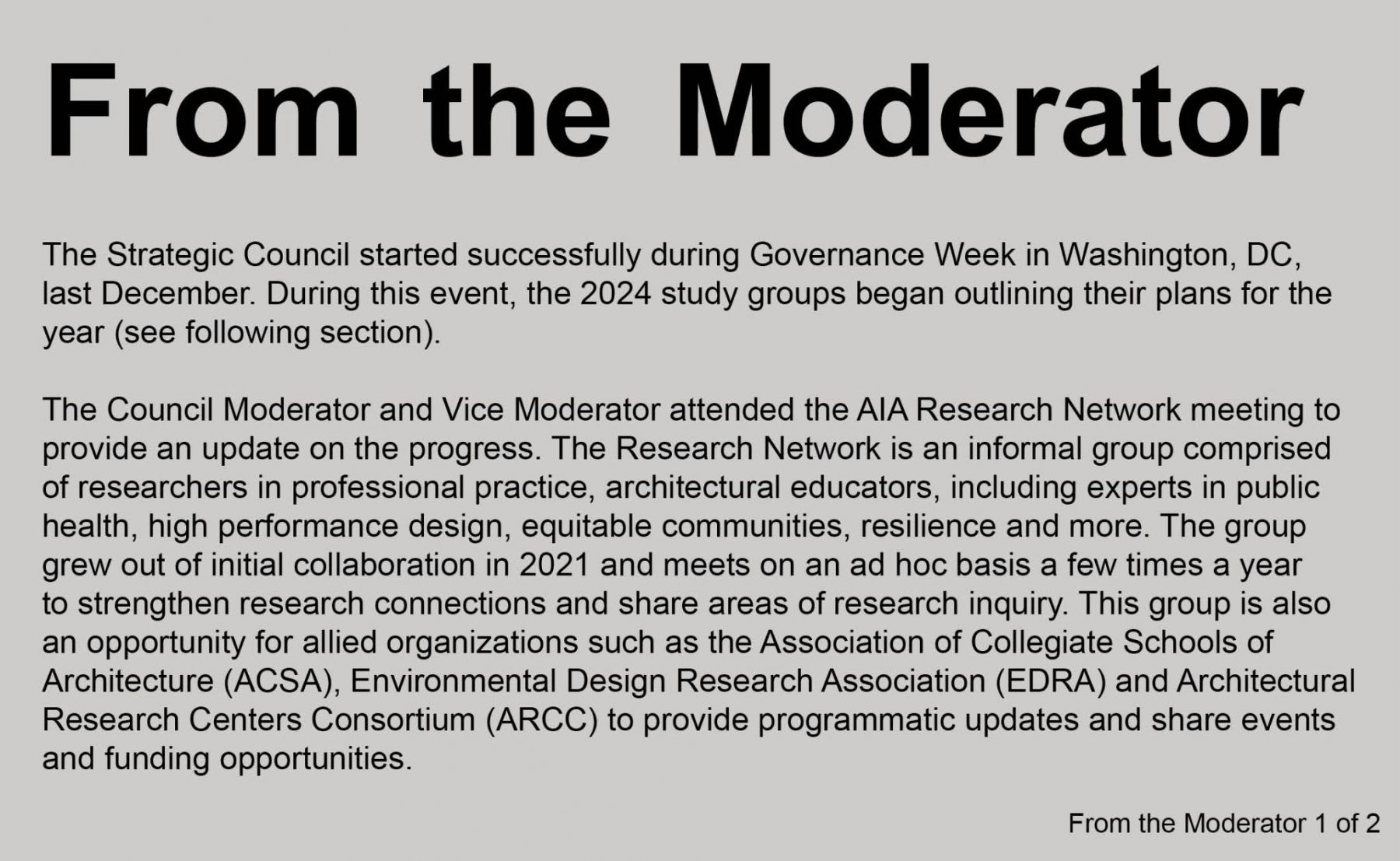 The Council Moderator and Vice Moderator attended the AIA Research Network meeting to provide an update on the progress. The Research Network is an informal group comprised of researchers in professional practice, and architectural educators, including experts in public health, high-performance design, equitable communities, resilience, and more. The group grew out of initial collaboration in 2021 and meets on an ad hoc basis a few times a year to strengthen research connections and share areas of research inquiry. This group is also an opportunity for allied organizations such as the Association of Collegiate Schools of Architecture (ACSA), Environmental Design Research Association (EDRA), and Architectural Research Centers Consortium (ARCC) to provide programmatic updates and share events
