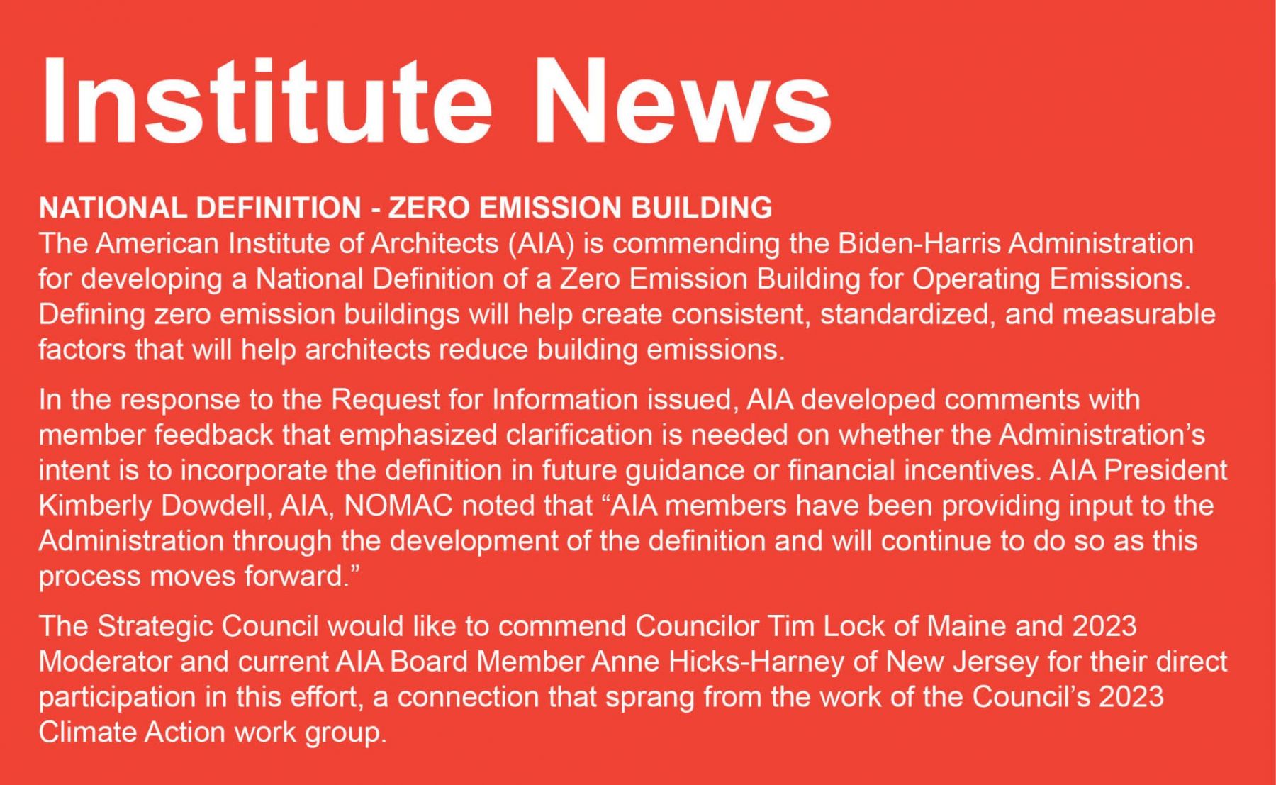 The Strategic Council would like to commend Councilor Tim Lock of Maine and 2023 Moderator and current AIA Board Member Anne Hicks-Harney of New Jersey for their direct participation in this effort. This connection sprang from the work of the Council’s 2023 Climate Action workgroup.