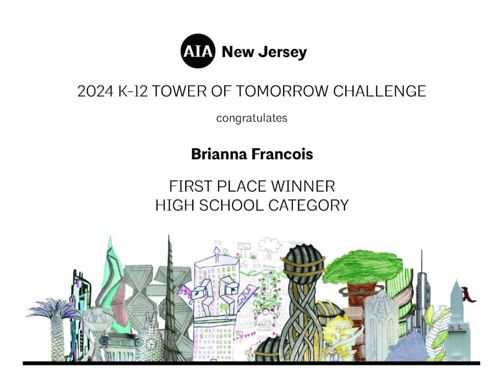 This competition was part of the celebration of New Jersey Architecture Week with AIA New Jersey. Students were invited to design their own “skyscraper of the future” in the AIA New Jersey K-12 TOWER OF TOMORROW CHALLENGE. Participants were invited to submit a drawing or a photo of a model, along with a description of their tower.