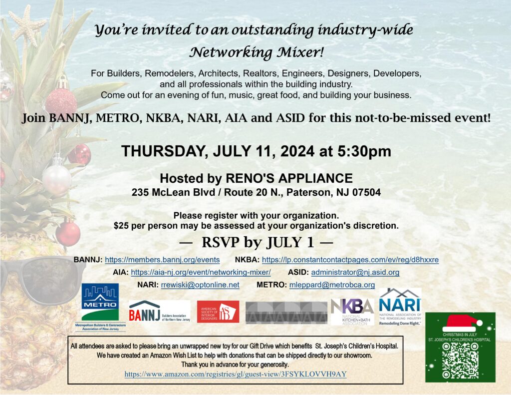 Meet Builders, Remodelers, Realtors, Engineers, Designers, Developers, and all professionals within the building industry. Come out for an evening of fun, music, great food, amazing prizes and building your business. Join colleagues from BANNJ, METRO, NKBA, NARI, and ASID for this not-to-be-missed event!