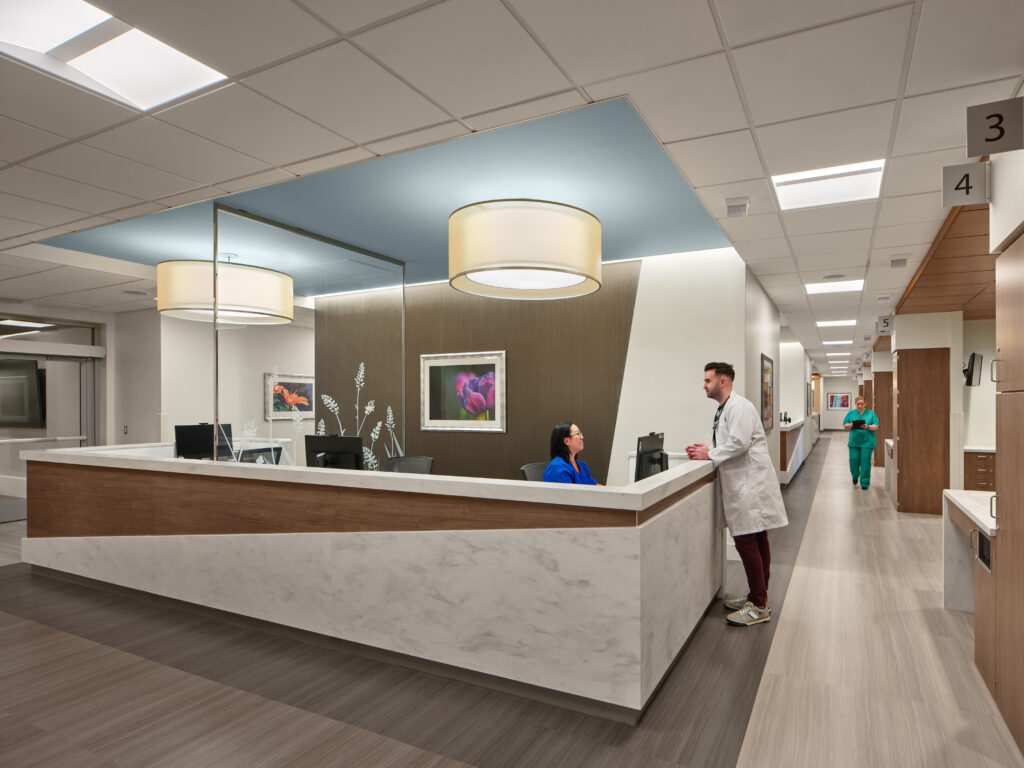 As a medical mall, the campus offers convenience at every turn, providing patients and providers easy access to roadways, ample parking, and a sought-after infrastructure for medical services. A central connecting spine captured on both ends – allowing entrance from both central registration and the mall – allows uninterrupted patient flow from two points. The long corridor allowed the design team to create a series of pod waiting areas, allowing clinic service providers’ schedules to flex by day. Central support services and amenities for staff and the public integrate the building into the mall experience with a food service location and a connected care technology hub along the mall circulation axis. This hub allows the purchase of wearables and IT support to integrate them with an online patient portal.