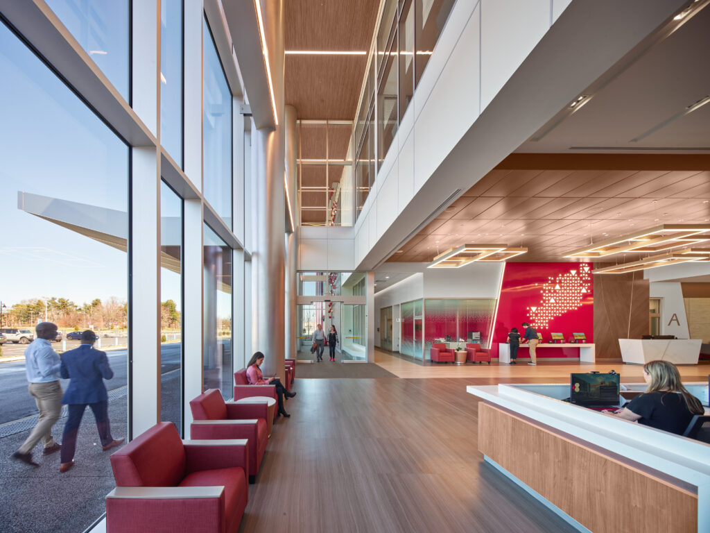 The site of a three-story, 166,000 SF ambulatory care campus posed some challenges. Because of its location along a busy but aging commercial corridor, Cooper’s new Moorestown Campus had to be designed to boldly announce its presence to the community while serving as a catalyst for regeneration. Dynamic elements such as the “Cooper Red” perforated metal screening panels, large expanses of two-story glass, and crisp architectural lighting don’t just make an outwardly bold statement to commuters and shoppers, they are also integral elements of the focused healing environments within, creating a seamless blend of form and function.