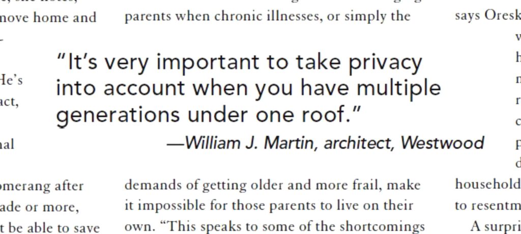 William J. Martin, AIA of WJM Architect was quoted in the October 2024 Issue of Bergen Health and Life Magazine for the special report article “FULL HOUSE” about the trend toward multigenerational family living. Click HERE for the full article on page 56!