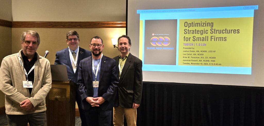 Exciting inspiration was provided by AIA New Jersey – The New Jersey Society of Architects President Brian W. Penschow Aia, Past President Joshua Zinder, AIA, SFx Chair Jeremiah Russell, AIA, and SFx Board Member Lee Calista, AIA. Optimizing Strategic Small Firm Operations was an educational session that represented a variety of small firm models, informing the audience of best practices that have resulted in professional success.