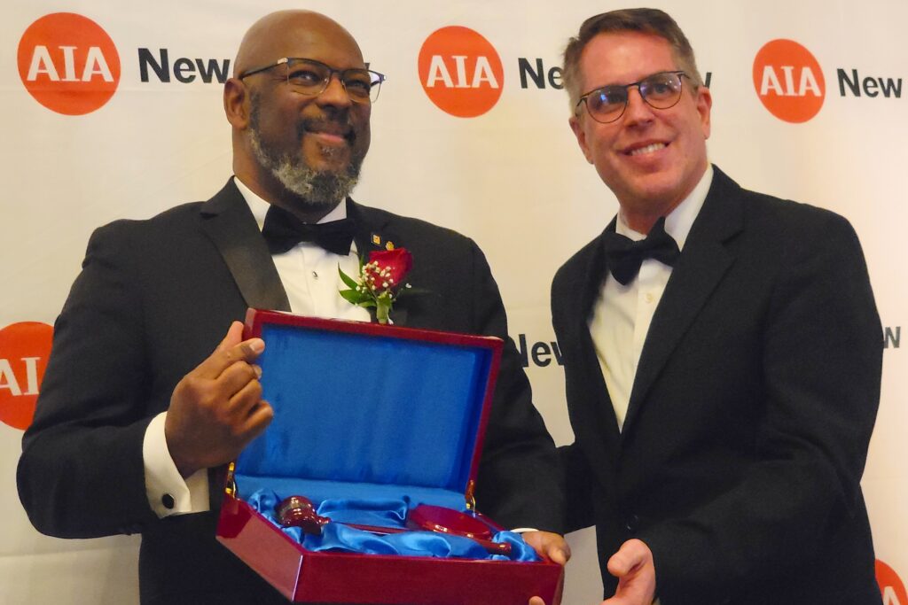 2025 AIA NJ President Andrew Thompson, AIA, NOMAC, on left, was presented his gavel by Immediate Past President Brian Penschow, AIA.