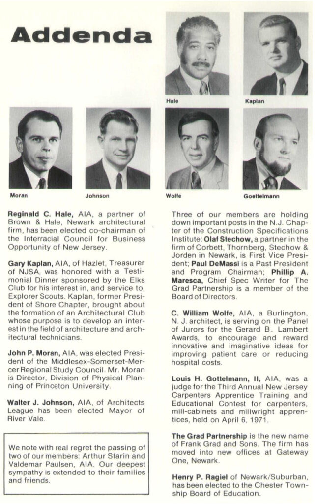 AIA New Jersy 2002 Past President William M. Brown, III, FAIA, NOMAC, has been so cooperative as to share his personal and professional history regarding his father, 1986 Past President of AIA New Jersey, William M. Brown Jr., AIA, and his business partner and friend, Reginald C. Hale, AIA.