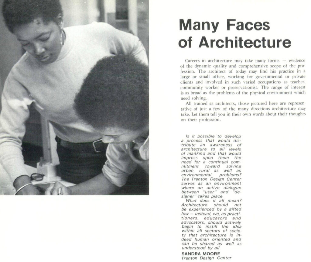 April-June 1974 NJ Architecture Magazine – Alternative Careers in Architecture Article By Dr. Sandra Moore. Dr. Moore was not a member of AIA, but was the liaison from NJIT and she received several awards for grants from AIA NJ.