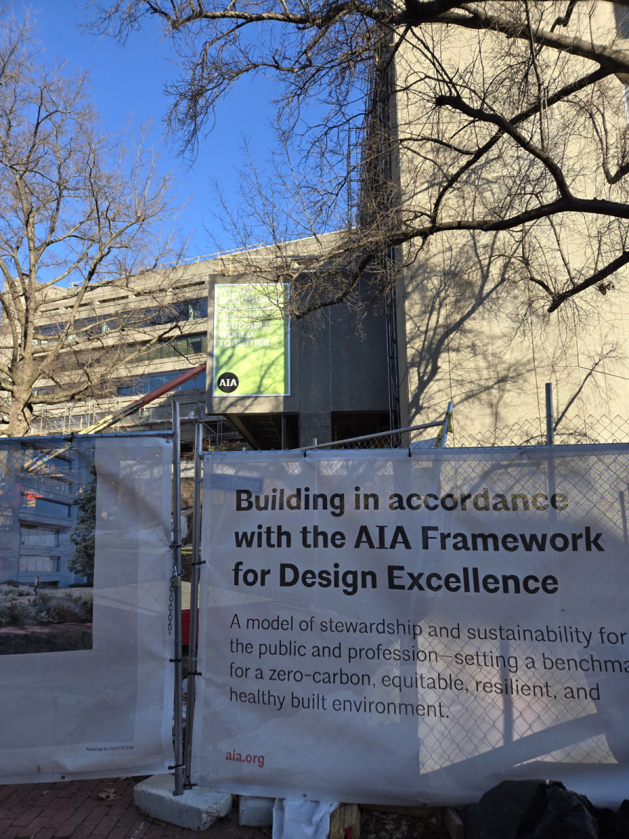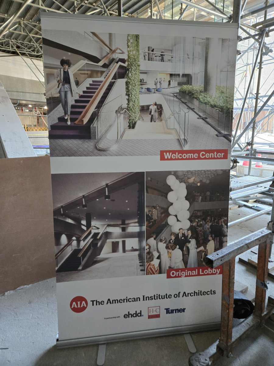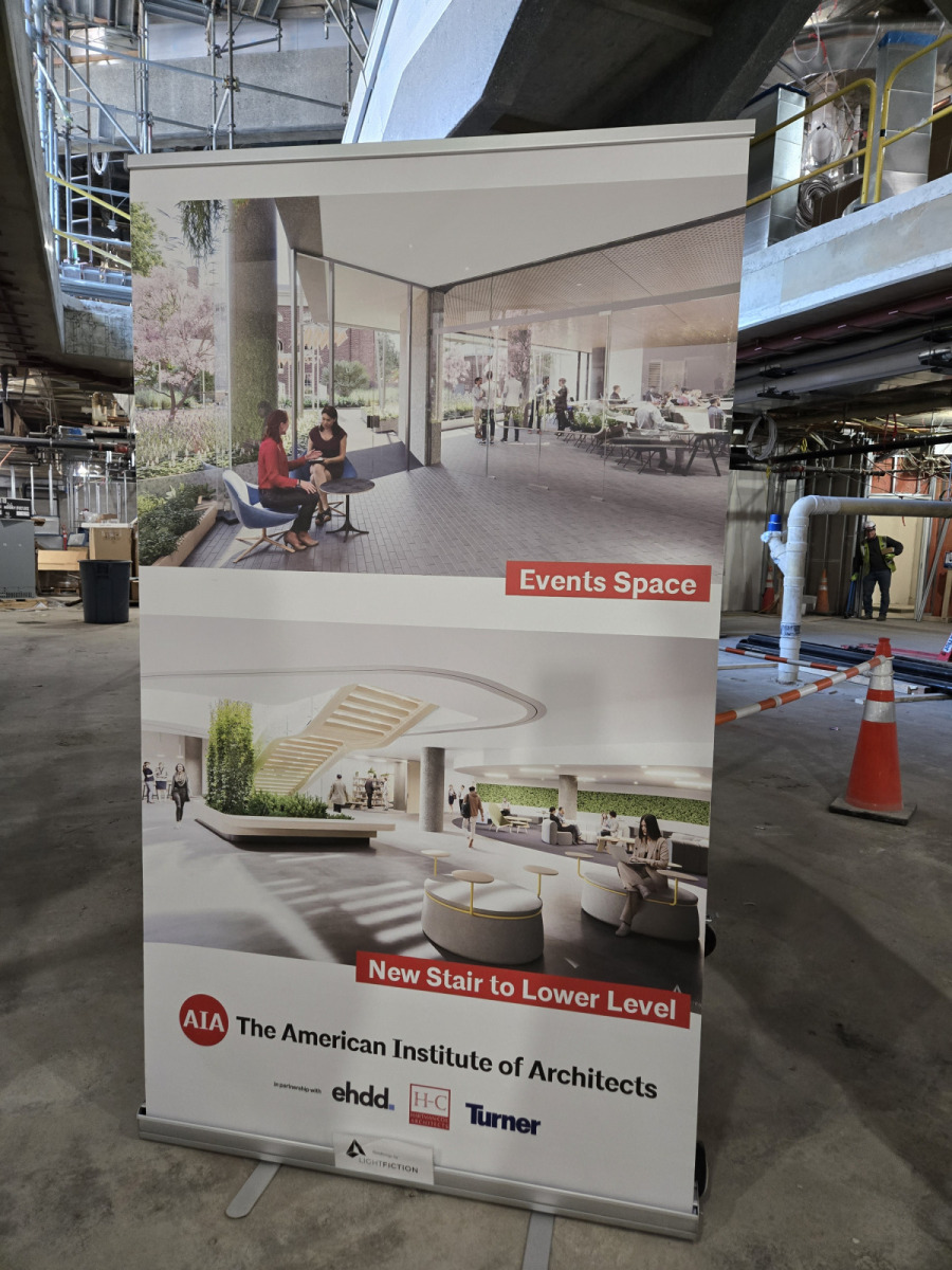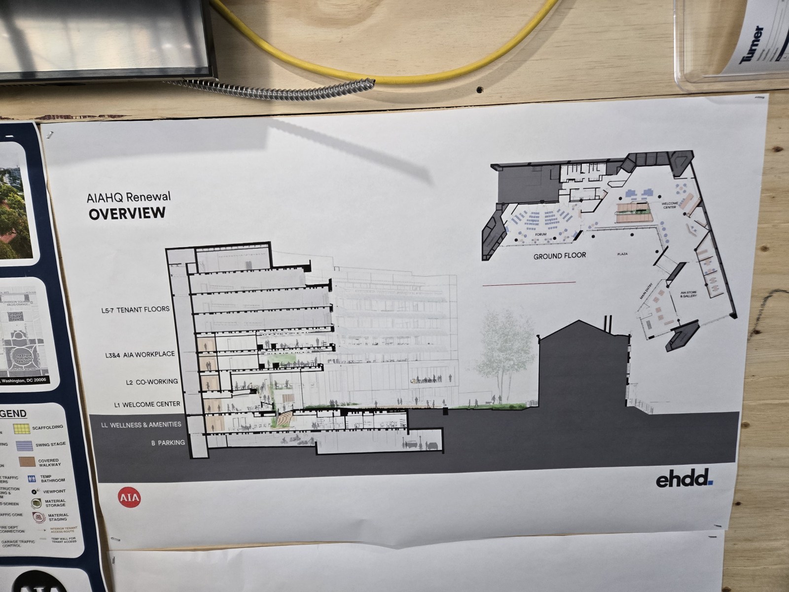 We learned that the first wave of furniture is expected to be installed in April, with AIA staff expected to inhabit the 4th floor in June 2025, and the other floors following. The current “secret” tenant on floors 5, 6 and 7 has continued occupancy during construction and will be staying after AIA returns to the building. The tour and construction are provided by the