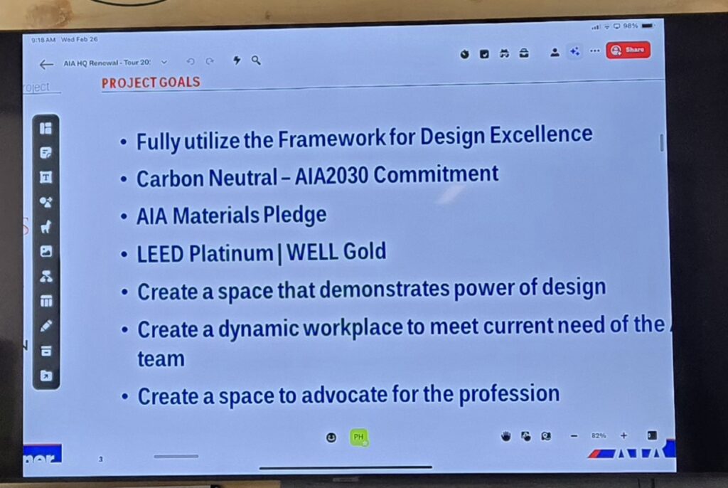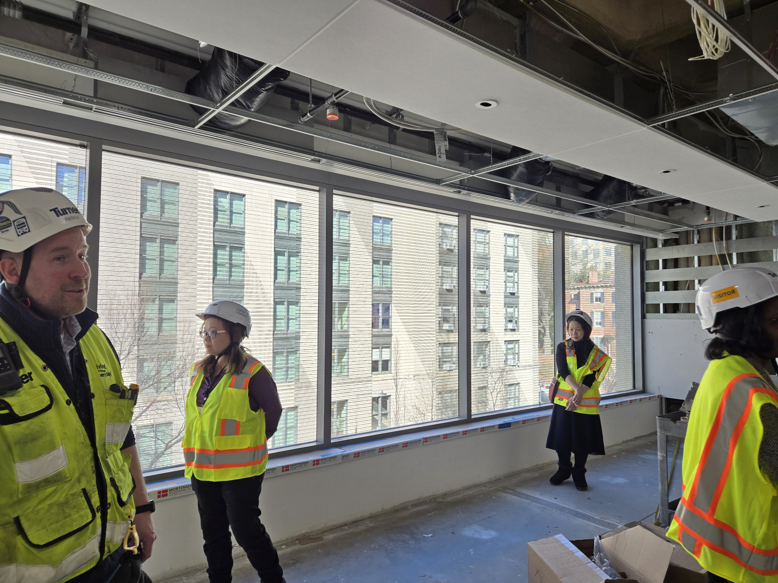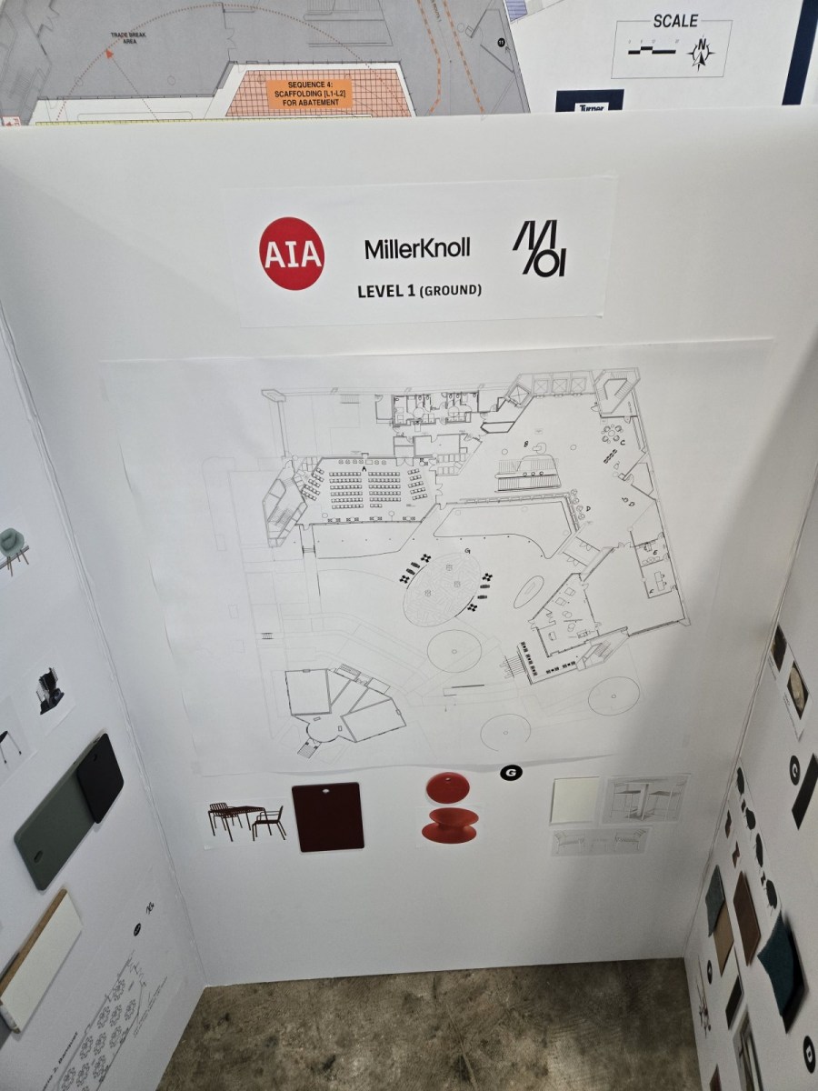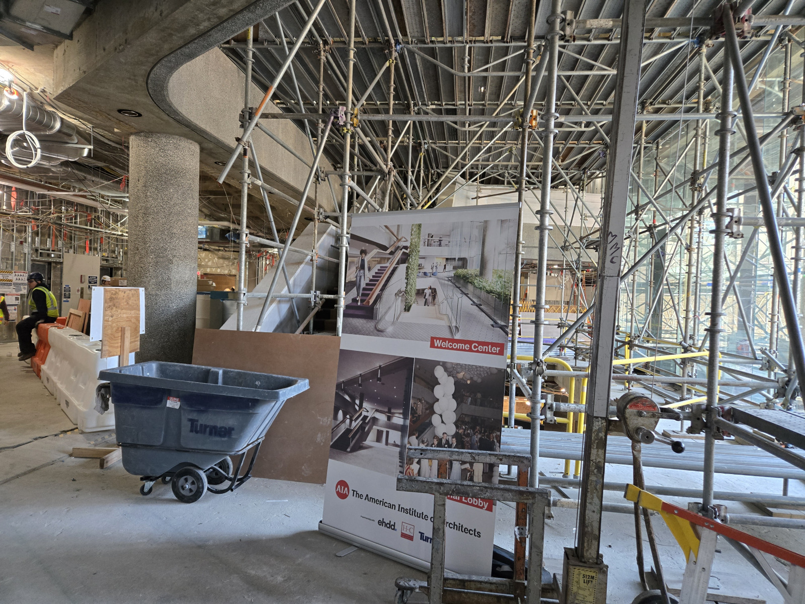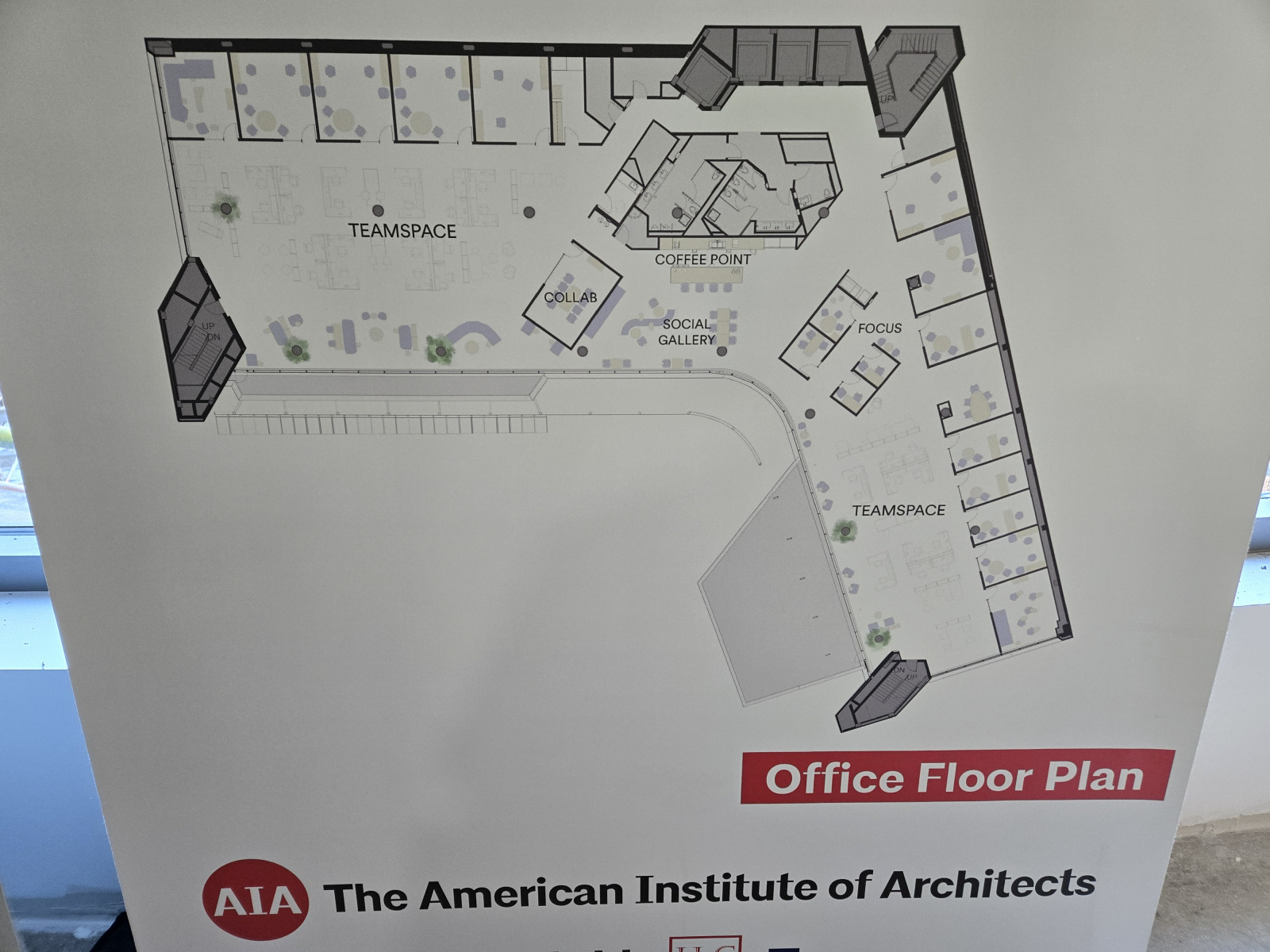 We learned that the first wave of furniture is expected to be installed in April, with AIA staff expected to inhabit the 4th floor in June 2025, and the other floors following. The current “secret” tenant on floors 5, 6 and 7 has continued occupancy during construction and will be staying after AIA returns to the building. The tour and construction are provided by the