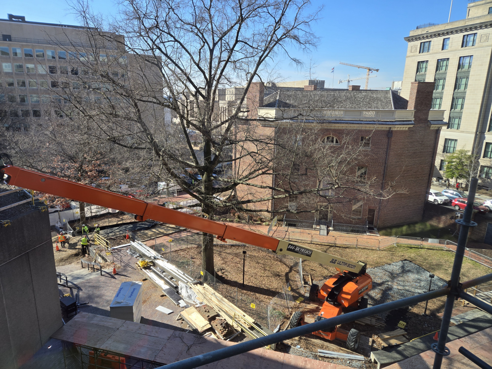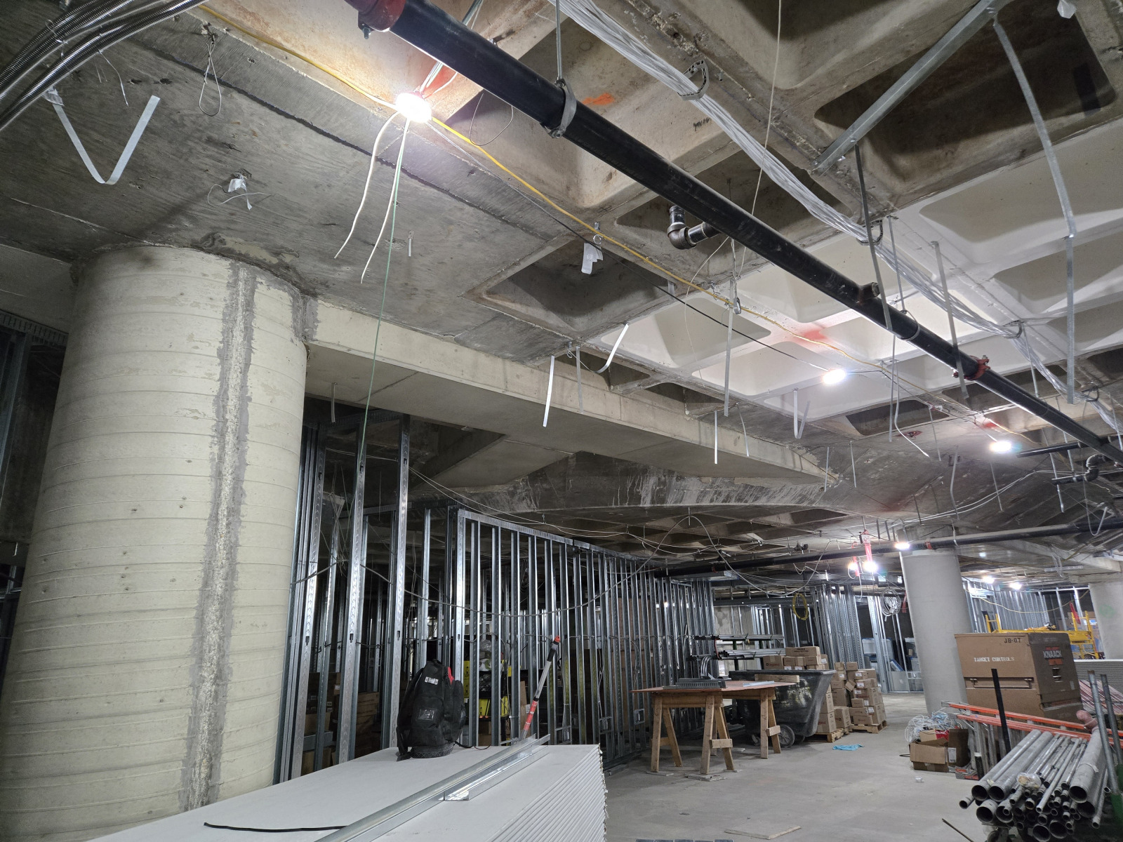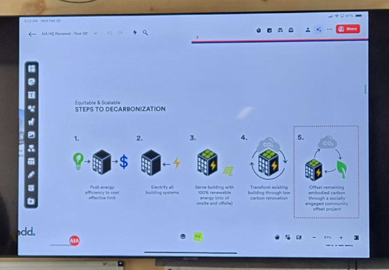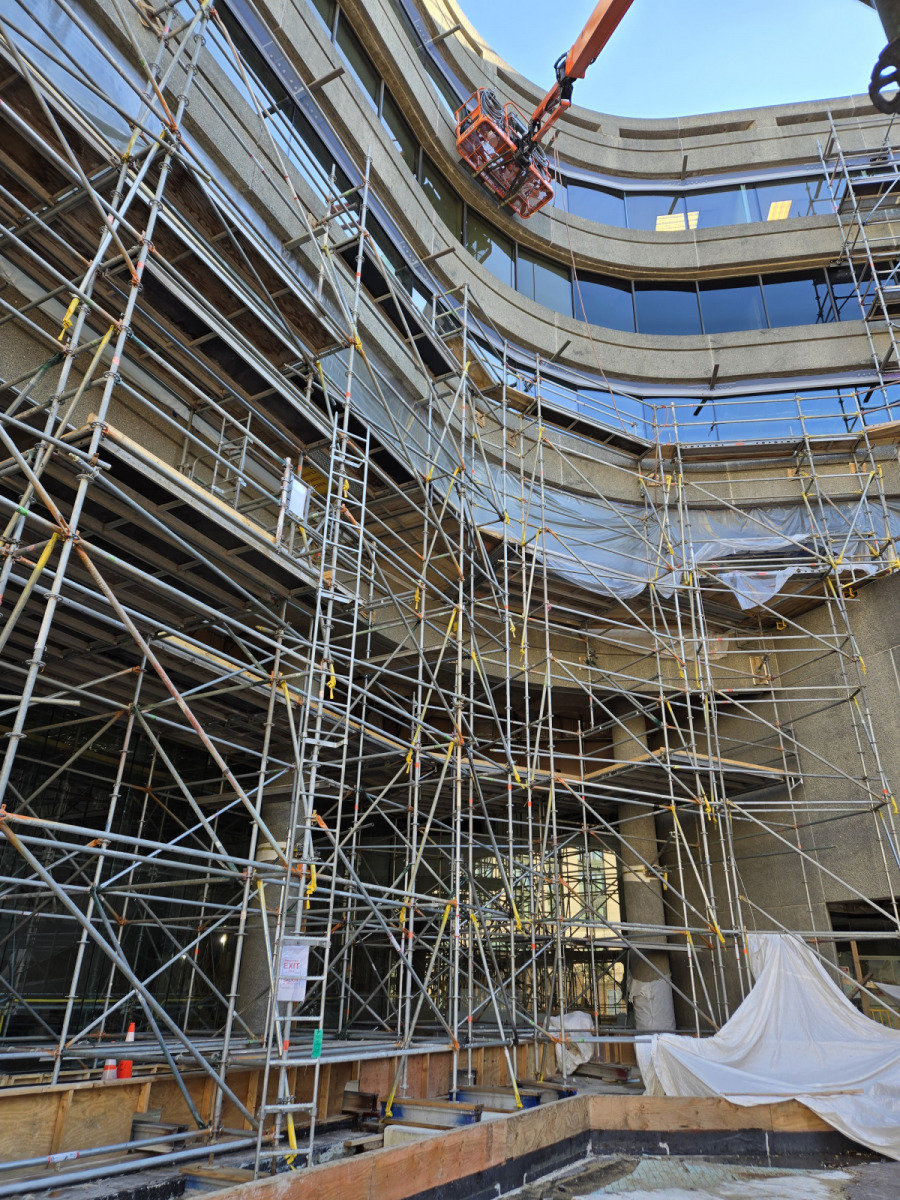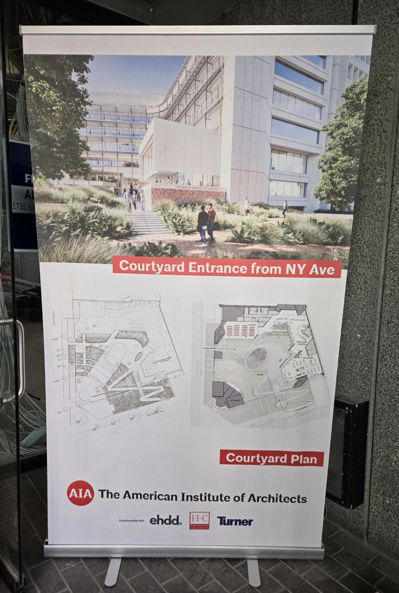 We learned that the first wave of furniture is expected to be installed in April, with AIA staff expected to inhabit the 4th floor in June 2025, and the other floors following. The current “secret” tenant on floors 5, 6 and 7 has continued occupancy during construction and will be staying after AIA returns to the building. The tour and construction are provided by the