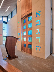steel frame in the shape of the Hebrew letter Shin (symbolizing a name for God), which is found on mezuzahs hung in doorways of Jewish homes. This inverted gabled roof and menorah motif is duplicated over the sanctuary and social hall, allowing the building to maintain a low profile from the street.