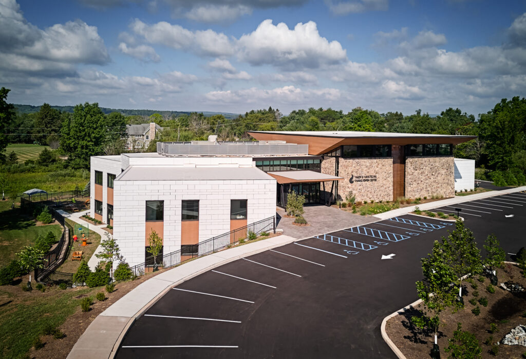 Chabad of Hunterdon County built a permanent home after years of renting, creating a 23,000-square-foot community center on a 7.2-acre site with wetlands and bounded by two roads. The building nestles into the landscape, offering a solid, discrete home for the growing congregation.