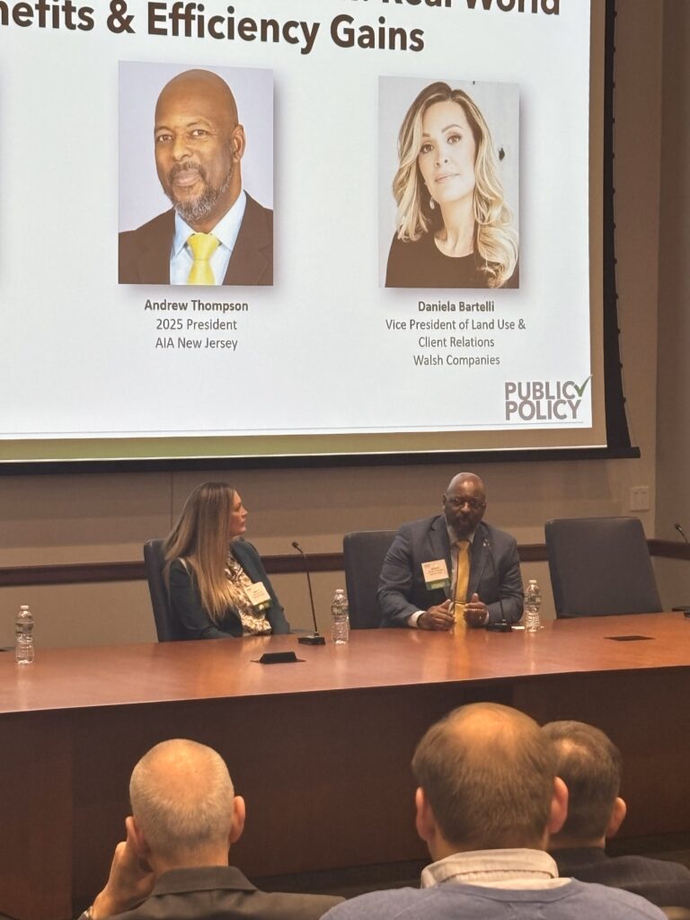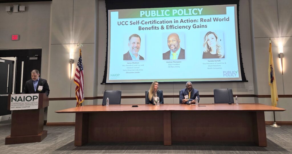 On March 19, 2025, AIA New Jersey President Andrew Thompson, AIA, NOMAC, participated in the UCC Self-Certification in Action: Real-World Benefits & Efficiency Gains panel discussion at the Annual Public Policy Symposium on March 19, 2025, at the Carpenters Apprentice Training Center in Edison, NJ along with Daniela Bartelli of the Walsh Company and James Rhatican of Hartz Mountain.