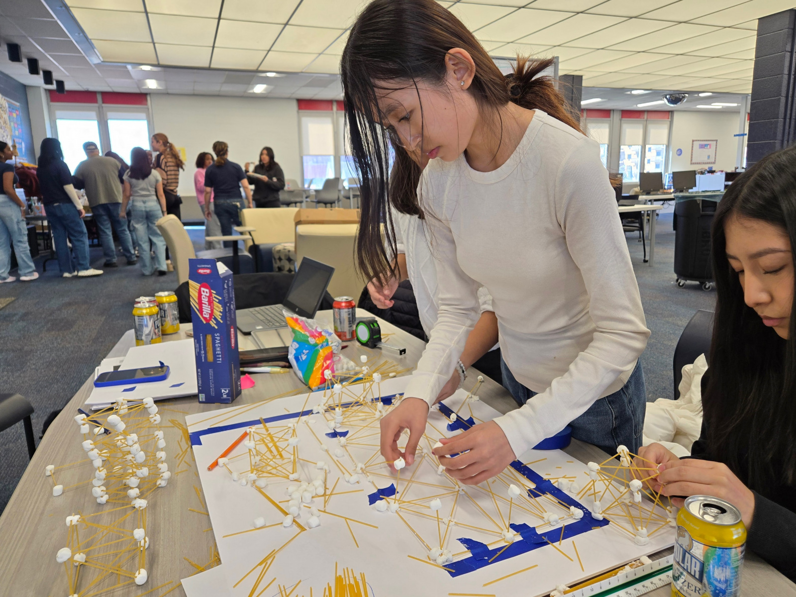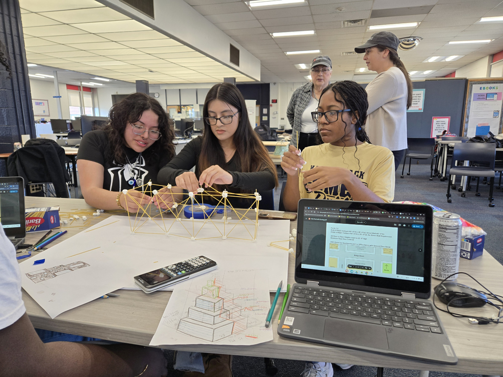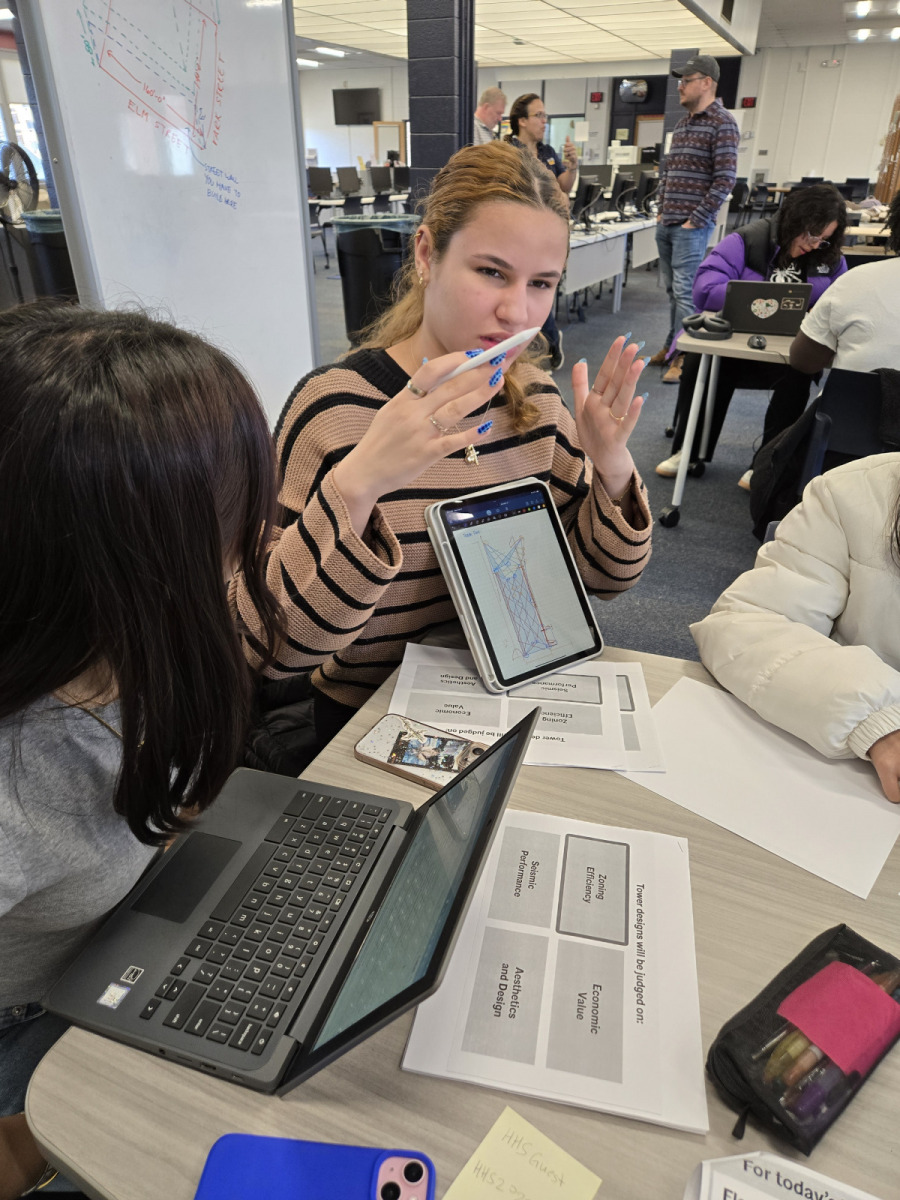 The Women’s STEAM Interscholastic High School Architecture Tower Challenge encourages teams of students to work together to design a tower judged on four criteria: Zoning Efficiency, Economic Value, Seismic Performance and Aesthetics/Design. Students use CAD programs to create mixed-use towers and are required to build within a provided site, FAR requirements, setback limits, and street wall requirements. Students were also asked to create physical sketch models of their tower’s structure using spaghetti and marshmallows that were tested for seismic on a shake table.