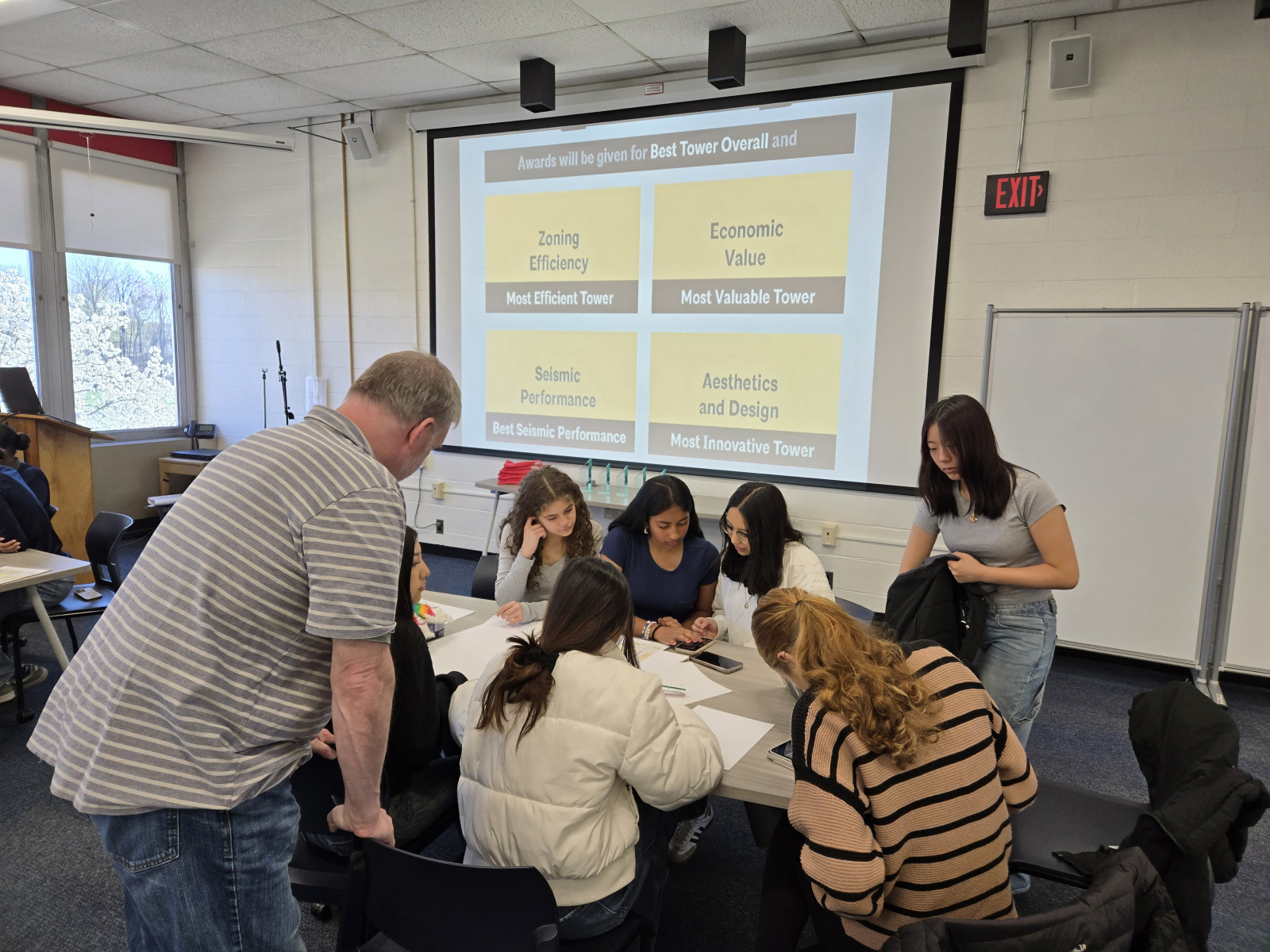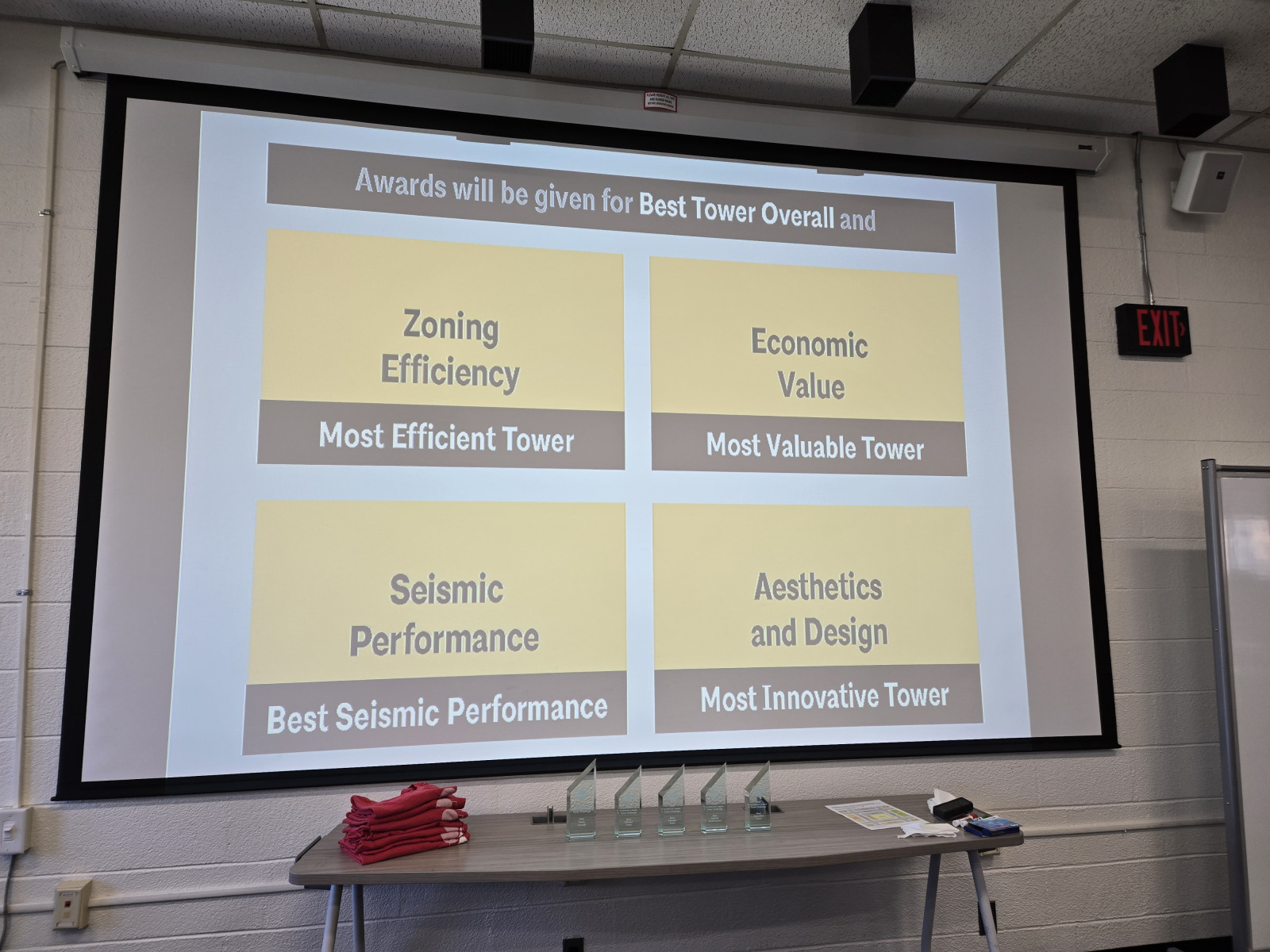 The Tower Challenge promotes climate initiatives by designing a mixed-use residential tower. Density reduces greenhouse emissions through a reduction in transportation needs, by replacing sprawl with shared amenities, resources, and city services available to densely populated areas. Four teams designed, constructed and competed for recognition in the following categories:   Most Efficient, Most Valuable, Most Innovative, Best Seismic Performance and Best Overall. Each team worked with faculty and architect mentors to develop an understanding of the new concepts.