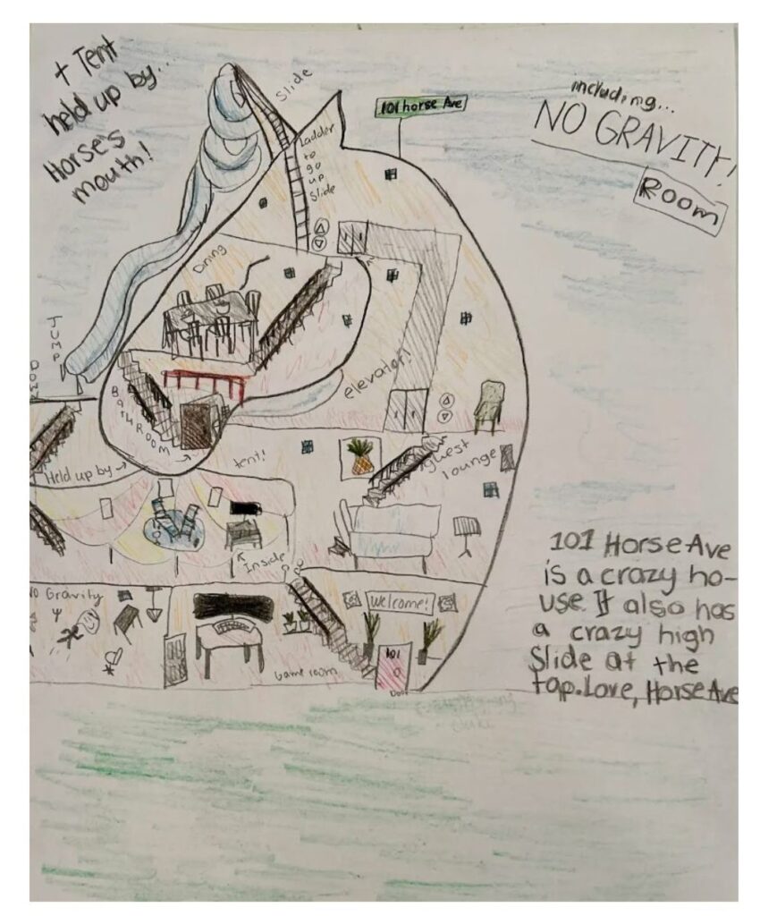 101 Horse Avenue, is my dream home, shaped like a horse- my favorite animal. It has zero gravity room, a slide that runs from the roof and a tent that is held by the horse’s mouth. It has plenty of stairs and elevators for young and old – it has room for everyone!