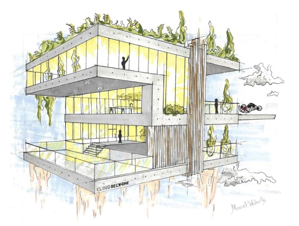 CloudDeck One is a floating home that hovers above the clouds using cold fusion-powered ion thrusters and AI-controlled stabilizers. Built from lightweight titanium-aluminum alloy, it features an infinity pool, a modular smart interior, and a personal hoverjet dock — all fully powered by unlimited clean energy in a self-sustaining, off-grid design.