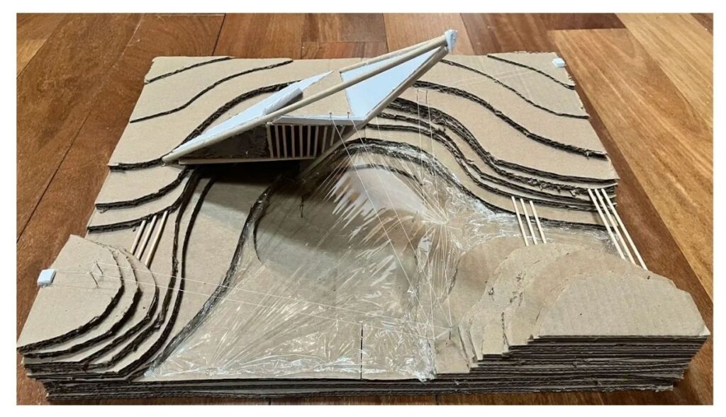 Residing in the world of the future, full of ever ongoing threats of climate change and pollution, high up in the alps along a river bank lays my model. The structure consists of biodegradable materials and a clean transportation system via thermal and hydro powered aerial tramways to support the idea of a clean future.