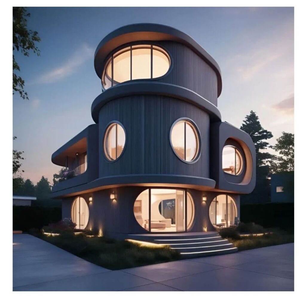 This future-style house has a smooth, curved shape, big round windows, and soft glowing lights, making it look modern and creative.