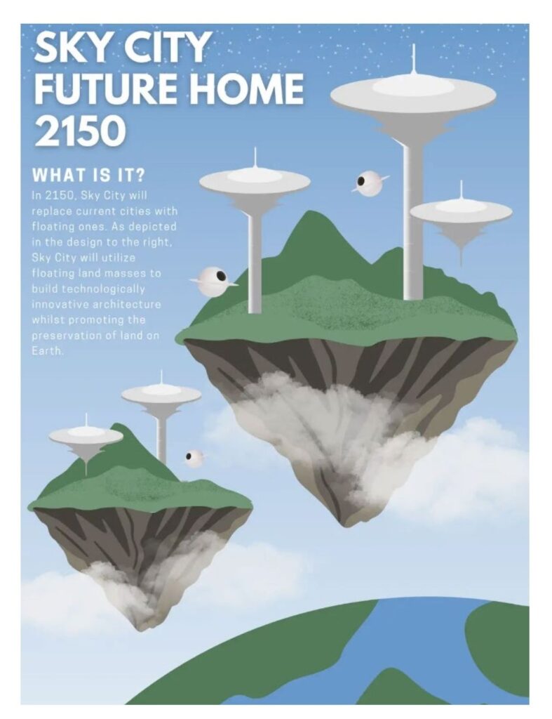 In 2150, Sky City will replace current cities with floating ones. As depicted in the design to the right, Sky City will utilize floating land masses to build technologically innovative architecture whilst promoting the preservation of land on Earth.